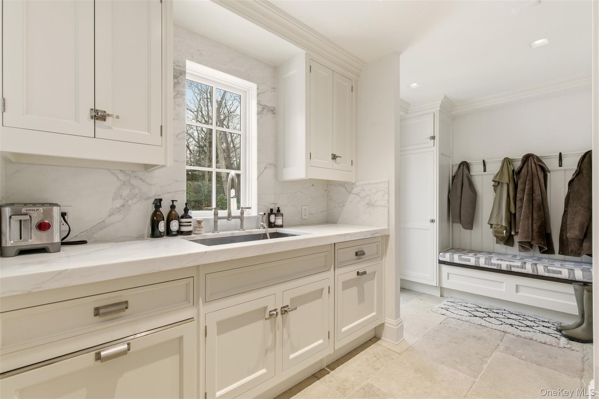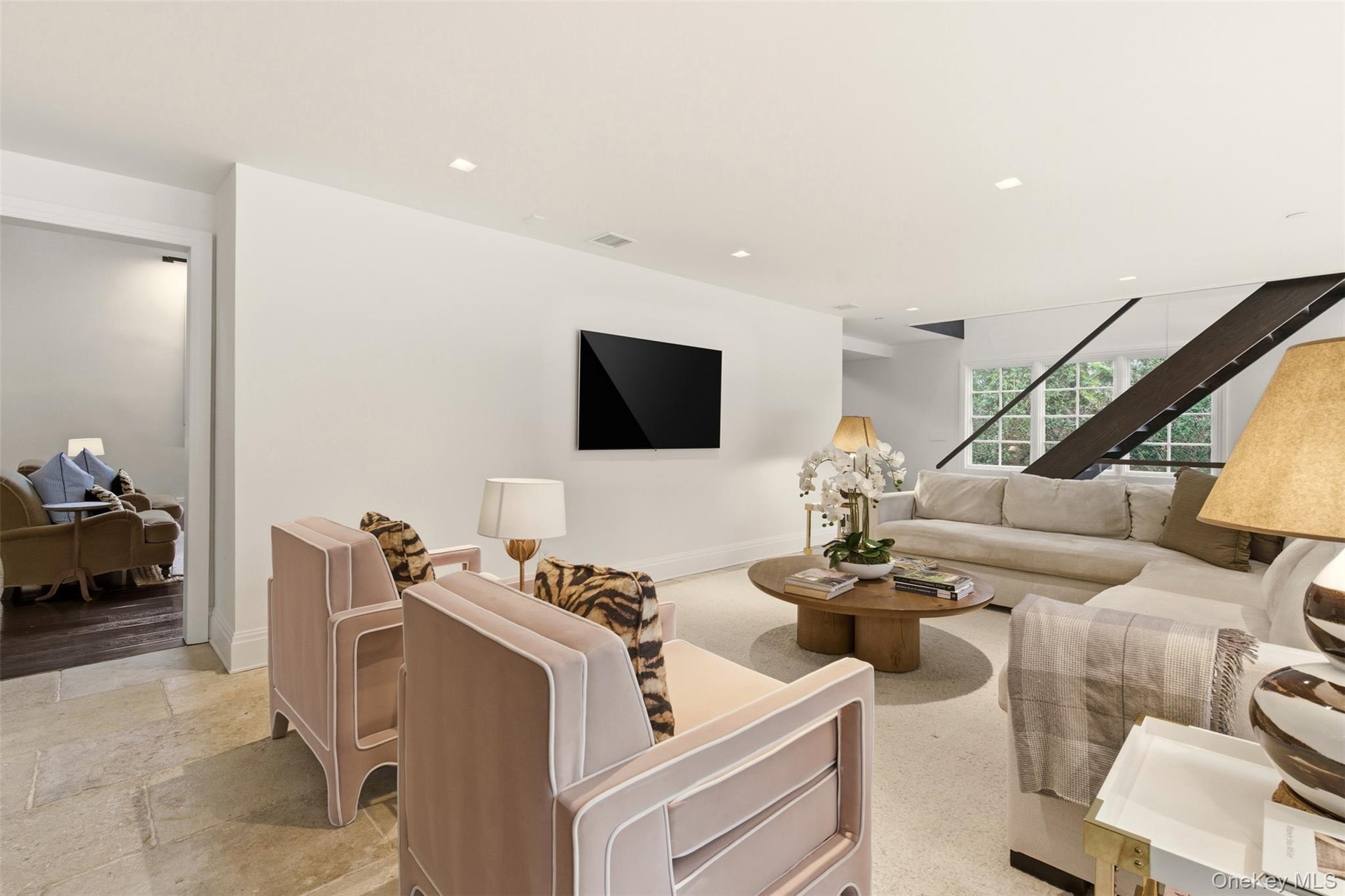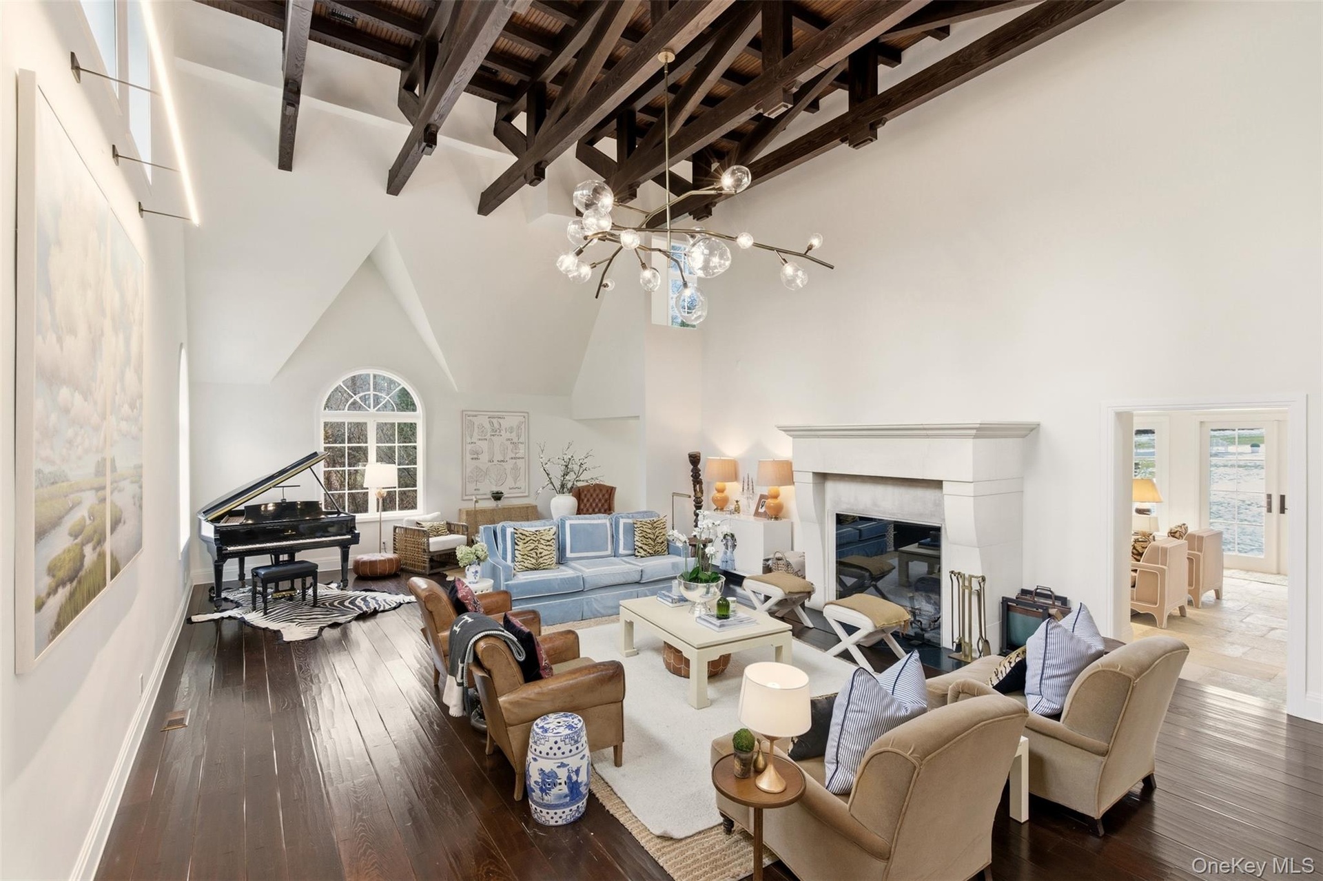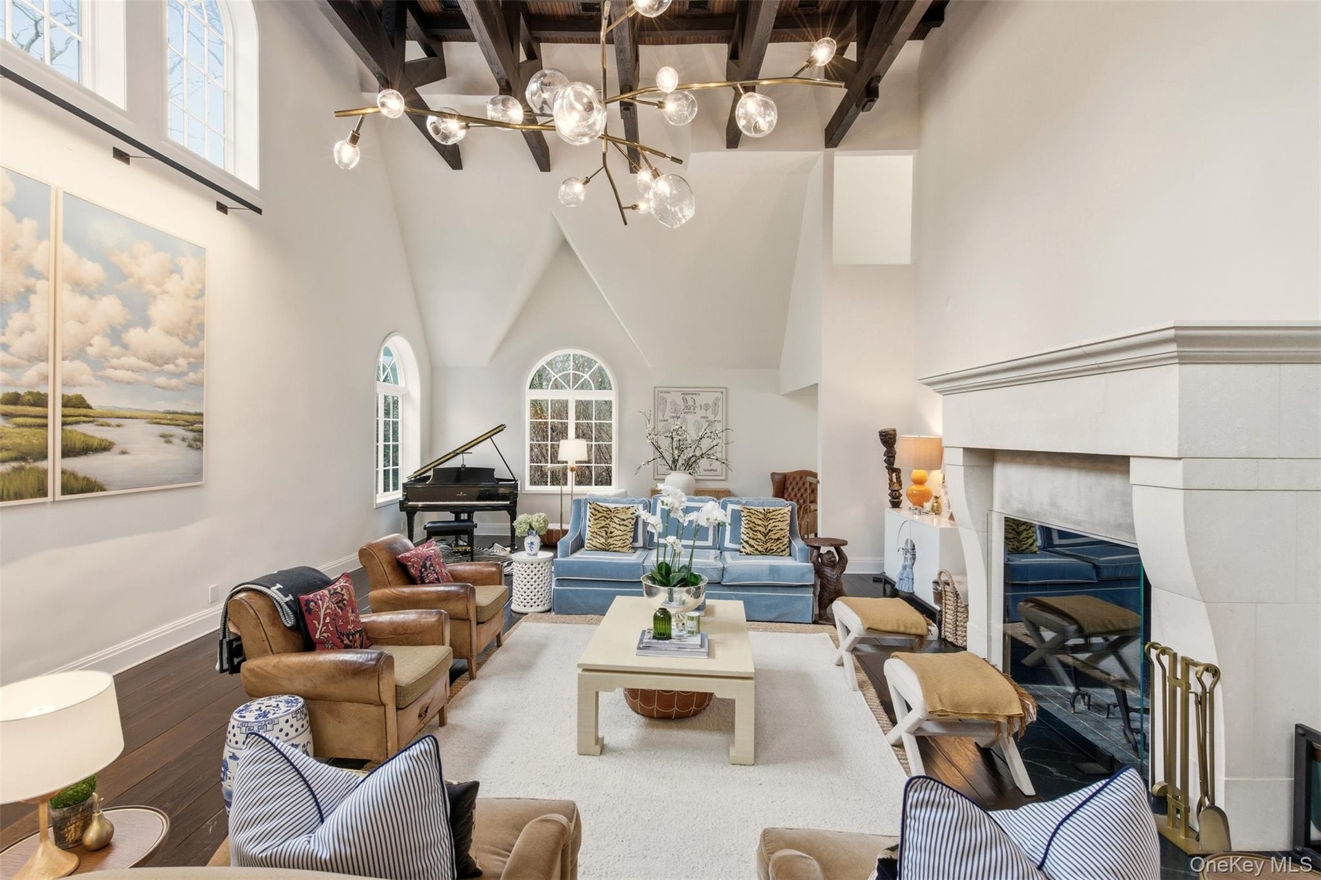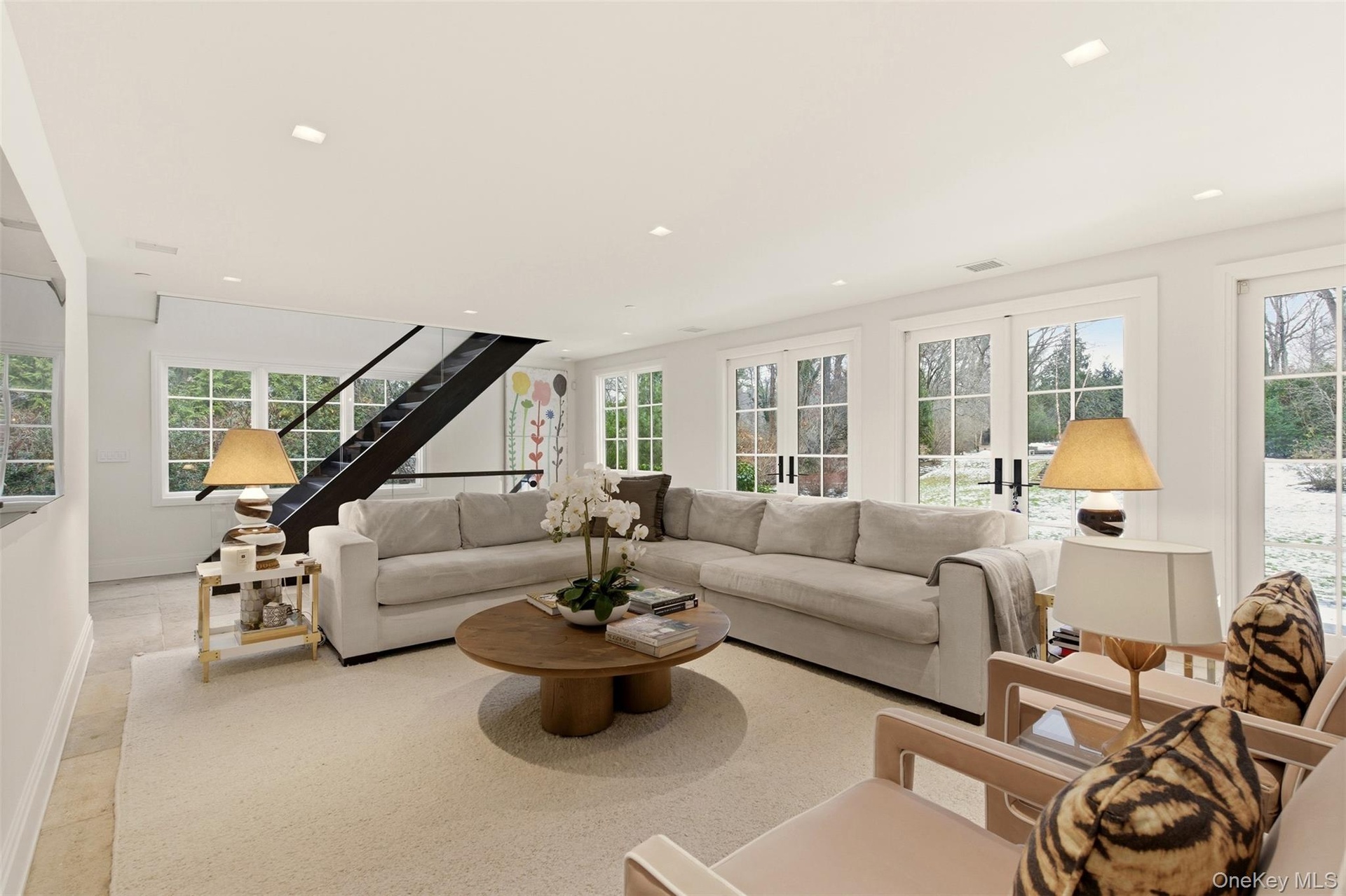The stunning living room and dining room offer high ceilings and French doors, with the dining area opening directly to a bluestone patio featuring a fire pit and seating area, ideal for additional outdoor entertaining. An open floor plan for the kitchen and family room features Christopher Peacock cabinetry, Carrera marble countertops, and Wolf appliances. Bedrooms include walk-in closets and en-suite baths. The primary suite offers a new veranda and a Chesney wood-burning fireplace flanked by custom built-ins. Finished lower level includes a bedroom, full bath, and laundry and playroom or gym space.