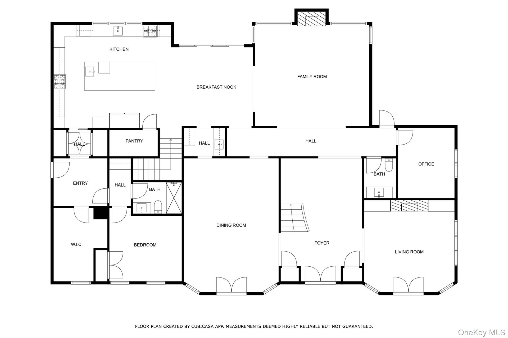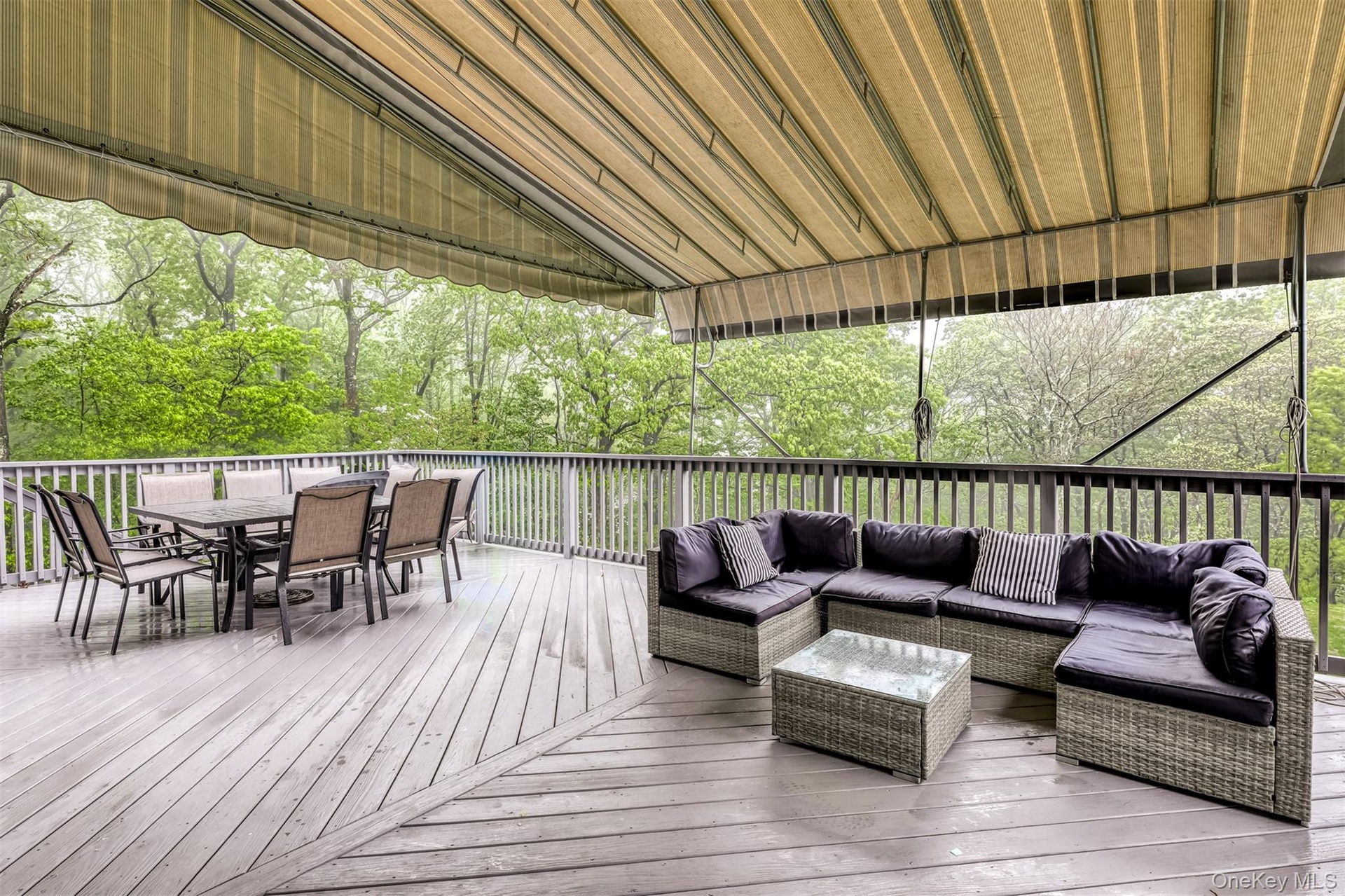 The chef’s kitchen is designed for both function and style, featuring an expansive center island with breakfast seating and abundant storage, quartzite Panta countertops, white tile backsplash, three gold-accented sinks, and premium stainless-steel appliances. Highlights include a 6-burner Wolf range with an additional 2-burner cooktop, two GE ovens, oversized refrigerator, pot filler, custom hood, concealed walk-in pantry, two additional pantries, and dramatic black cabinetry with gold accents. The adjoining dinette opens through sliding glass doors to a deck with a large awning overlooking the impressive grounds.