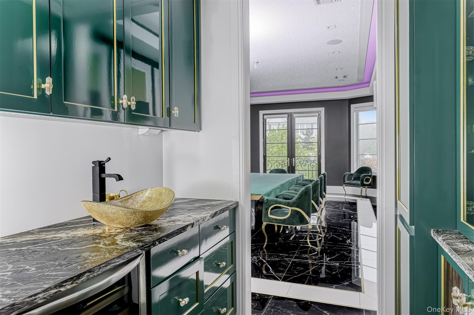 A dramatic entry through arched solid iron double doors opens to a grand marble foyer with soaring 10-foot ceilings, intricate wall detailing, and a sweeping curved staircase accented by custom glass and gold railings beneath a striking designer chandelier. The formal living room is both inviting and sophisticated, highlighted by custom floor-to-ceiling upholstered wall seating, a sleek electric fireplace, recessed lighting, and black-framed French doors leading to a Juliet balcony. The formal dining room mirrors this elegance, offering French doors, a Juliet balcony, and a tray ceiling with color-changing ambient lighting—ideal for elevated entertaining. A fully appointed butler’s pantry with custom cabinetry, wine cooler, and sink ensures seamless hosting.