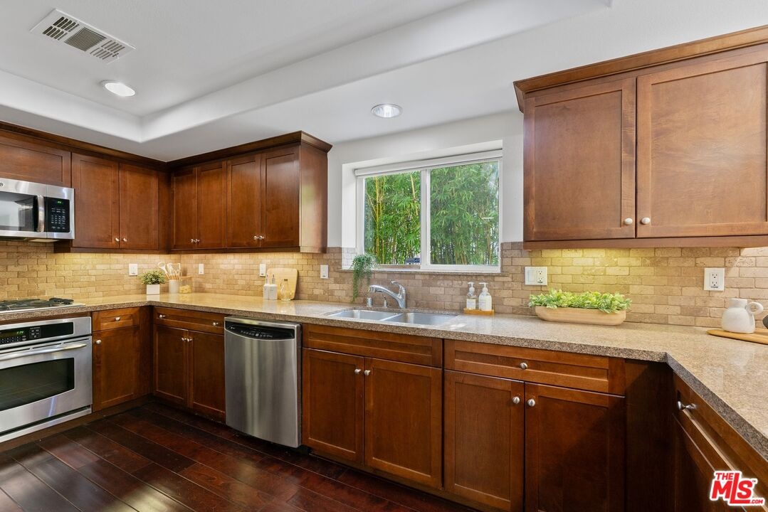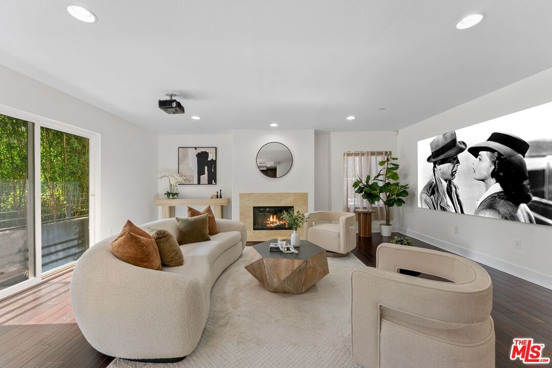 Immerse yourself in more than 1,600 square feet of refined living in the foothills of Runyon Canyon. From the moment you step inside, natural light pours through expansive south-facing sliding doors, illuminating this corner layout with only one shared wall thoughtfully designed for both relaxation and entertainment. The living and dining area features hardwood floors, a stone-framed fireplace, and a ceiling-mounted projector screen for movie nights. Sliding doors lead to a generous terrace, ideal for morning coffee, evening cocktails, or quiet meditation with canyon breezes. Adjacent to the living space, the kitchen offers stainless steel appliances, custom granite counters, ample cabinetry, and a breakfast bar for casual meals. The primary suite provides a private courtyard patio, a spa-inspired bath, and a walk-in closet built to accommodate an extensive wardrobe. Thoughtful storage solutions include custom-built closets, a full-size side-by-side washer and dryer, and a separate secured storage room. Your vehicles enjoy the convenience of rare side-by-side covered parking. Franklin Place, a pet-friendly boutique community of only 22 residences, offers controlled access, a gym, a recreation room, guest parking, and low HOA dues. From your doorstep, explore the trails of Runyon Canyon at sunrise, stroll to the Hollywood Bowl or Yamashiro for dining and entertainment, and access the 101 freeway and Metro B Line within minutes. This residence delivers the serenity of a private retreat amid the vibrancy of Hollywood Hills West address where open space, abundant light, and urban convenience converge. More info on the property website.