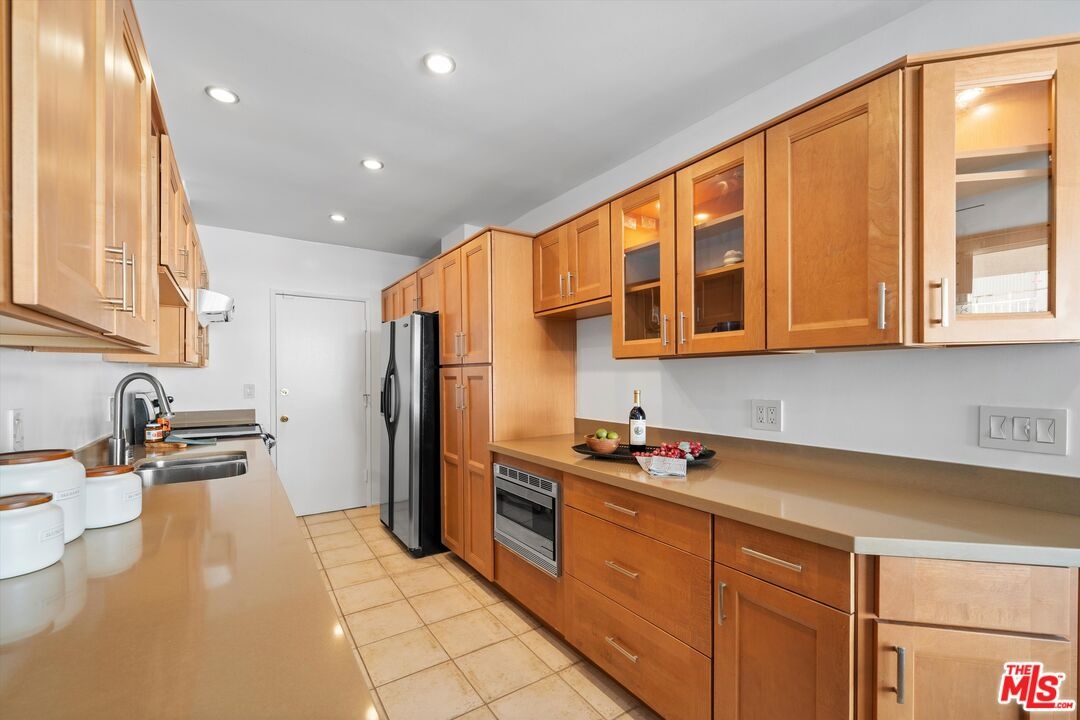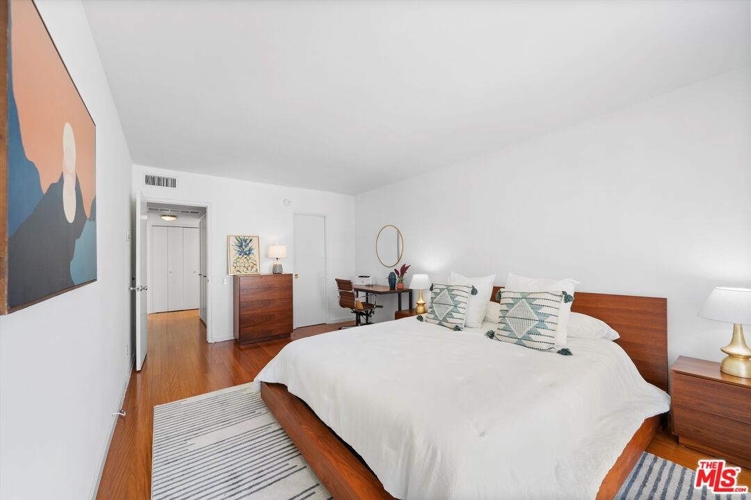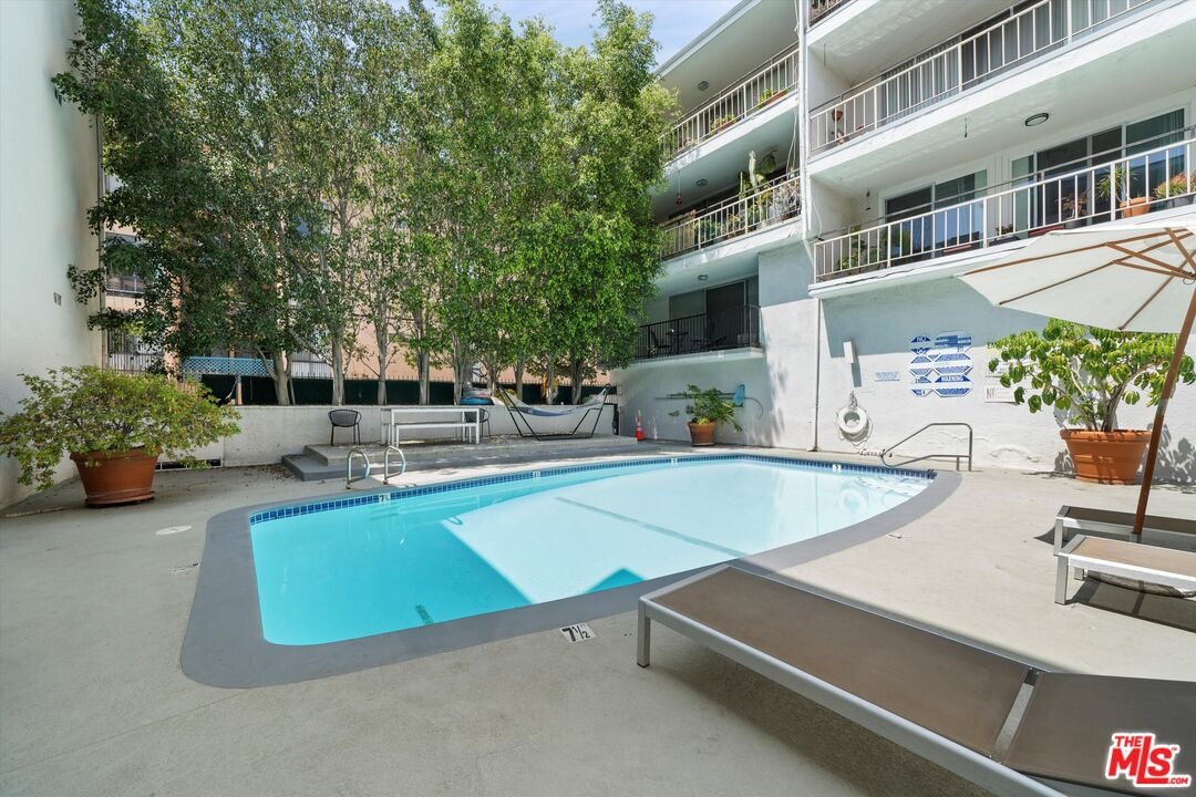 Turnkey, top-floor condo with large private outdoor space in the heart of Hollywood! Freshly painted and filled with natural light, this quiet top-floor condo offers a bright and airy retreat a short distance from the iconic Sunset Strip and Runyon Canyon hiking trails. Enter through double doors into a spacious, thoughtfully designed open layout that gives mid-century vibes and features gleaming hardwood floors, floor-to-ceiling sliders, and an oversized balcony with pool views. The open-concept living and dining areas flow seamlessly into a large, updated kitchen complete with quartz countertops and stainless steel appliances. The bedroom features balcony access, a walk-in closet, and a floor-to-ceiling window that invites in abundant light. With two bathrooms, both with skylights, you can enjoy the flexibility of having separate guest and primary bath options, ready to enjoy or personalize to your taste. Additional highlights include ample in-unit storage, dedicated garage storage, and close proximity to the laundry room, elevator, and parking. The 50-unit Key Largo community offers secured entry, a pool and spa, a peaceful courtyard, and guest parking. Outside, you have easy access to a variety of nightlife, restaurants, fitness options, luxury hotels, and the Hollywood Metro Rail. This vibrant location perfectly blends convenience, nature, and classic L.A. energy.