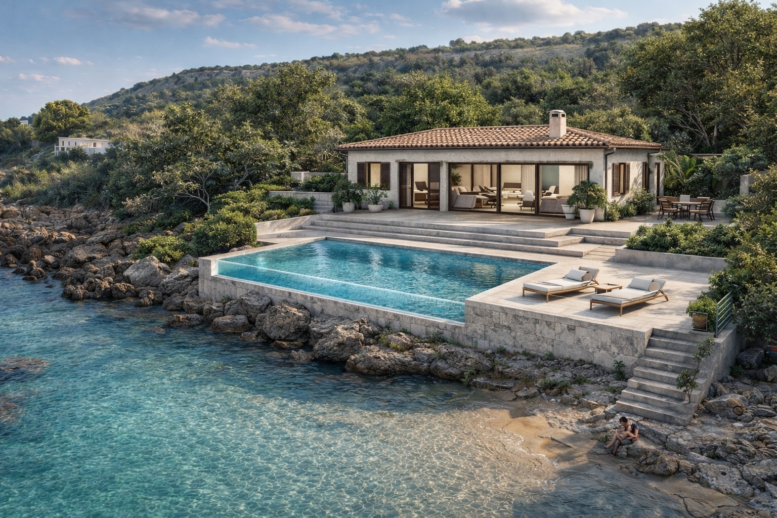 The outdoor areas — private, spacious and beautifully integrated into the natural surroundings — create the perfect setting for refined seaside living. Imagine launching your kayak from your own waterfront platform, hosting sunset aperitifs with the sound of waves in the background, or simply stepping into the Adriatic whenever you wish. This is a sanctuary for those who seek privacy, beauty and the rare pleasure of living on the sea rather than near it.