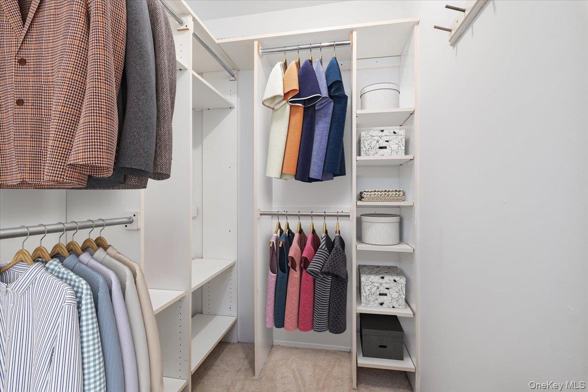 Upstairs, the spacious primary bedroom includes a walk-in closet, vanity area, and walk-in shower. The second bedroom offers two large closets and an en-suite bathroom with tub, while the hallway is lined with additional deep closets for exceptional storage.