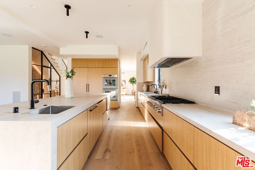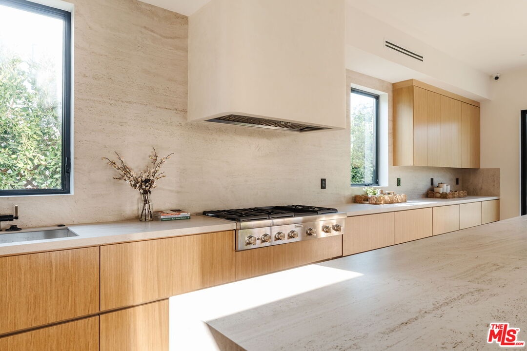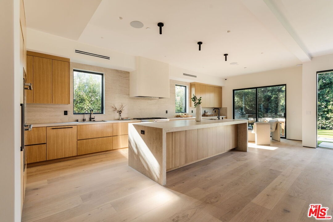 A sun-filled modern masterpiece designed for effortless entertaining and elevated everyday living. Spanning approximately 4,260 square feet, this exceptional home offers six bedrooms and six-and-a-half bathrooms with a thoughtfully designed, open layout ideal for both comfort and style. Skylights and expansive windows throughout flood the home with natural light, creating a bright, airy ambiance. A stunning formal dining room with large windows serves as a true showpiece perfect for hosting memorable gatherings while enjoying abundant daylight. The chef's kitchen is outfitted with top-of-the-line stainless steel appliances, custom white oak cabinetry, white oak flooring, a walk-in pantry, three sinks, two dishwashers, and a full-size refrigerator and freezer. Large sliding doors from the kitchen and breakfast area open to the backyard, while expansive sliding pocket doors off the living room create seamless indoor-outdoor flow, ideal for entertaining and relaxed California living. A striking wine display adds a refined architectural focal point. The versatile floor plan includes four bedrooms upstairs and two downstairs, along with a dedicated office. The primary suite is a luxurious retreat featuring a spacious walk-in closet, a spa-inspired bathroom with dual sinks, dual shower heads, a soaking tub, and access to a generous private balcony. An additional front-facing bedroom also enjoys its own expansive balcony. Crowning the home is an impressive rooftop deck offering breathtaking 360-degree views of the mountains, Century City skyline, and the surrounding cityscape an exceptional space for entertaining or unwinding above it all. Additional highlights include a gated front entry and custom cabinetry throughout. Ideally located in a highly central Los Angeles setting, the property offers convenient access to Beverly Hills, Century City, Culver City, and beyond, as well as nearby places of worship, dining, and premier retail. A light-filled, spacious modern home designed for elevated living and unforgettable entertaining.