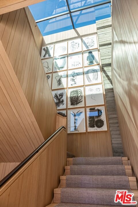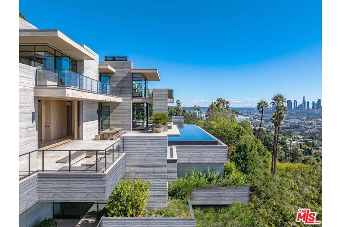 The Hollywood Hills House designed by Scott Mitchell Studio is a monumental and versatile modern villa rising out of the Hollywood Hills. The layered and terraced house - designed for living and entertaining - embraces views that span L.A.'s cityscape from east to west and out to the Pacific Ocean. This property is set on Los Angeles's most iconic promontory, formerly owned by Howard Hughes, that extends over one acre with no neighbors on either side and 270 views of the entire city. Set at the 50-yard line of legendary hot spots Chateau Marmont, Tower Bar, and the Hollywood Bowl, the energy of the city can be seen and felt from the estate's peaceful privacy. Additionally, the property borders state land so no building can be constructed behind it, and it has private access to hiking in the famous Runyon Canyon. The form of the house follows a rigorous commitment to rich, organic materials and light. Grand outdoor decks provide seamless indoor and outdoor living. With expansive volumes over three floors, the tranquil and rooted hillside haven exudes a sense of balance, repose and a seamless connection to the natural landscape. A secluded driveway inclines to an impressive, cobbled motor court that can accommodate 12 or more cars and is nestled under the house with far-reaching views across the city. From there the villa's grand and wide staircase begins, following the form of the building, passing a large-scale, vertical water feature to the landscaped north terrace and walkway, where native plantings and open fires frame the principal steel window and door entry system. On entering, to the east is a luxurious study and to the west, an open living room with fireplace and views across the city that flows into the dining room and on to the kitchen and family room, where floor to ceiling glass sliding doors open seamlessly connecting indoor and outdoor and framing wide urban vistas. On the exterior, wire-brushed narrow Itauba deck boards and an elegant dark stone clad infinity pool and hot tub are flanked by a sunken fire pit and seating area. A stand-alone pool bar and lounge is connected by a covered breezeway adjacent to an outdoor seating area. Walkways and terraces continue around the house incorporating native oaks and under-storied plantings that are composed with elements of fire and water. On the upper level, the primary bedroom wing comprises not only the primary bedroom but separate bathrooms and dressing rooms, and a study that can be isolated from the rest of the suite by a discreet pocket door system. On the lower level is a recreational zone with state-of-the-art screening room, billiards room with lounge area, and a bar. These program elements are organized around a gracious distribution foyer which doubles as a secondary point of entry to the house and leads to the motor court, which can be converted into a conditioned, modern ballroom. The house was built over a 10-year period, and new codes have been created since its construction, preventing a home of this type ever being built again in the Hollywood Hills. The house is constructed with $30 million of solid poured-in-place board-formed concrete with three feet thick concrete walls, and over 100 caissons that go 100 feet deep. The hard cost of the construction is $3,500 a square foot not including the land. The project engaged JRC Group, Inc., arguably the best builder in the city. The house includes a multi-million-dollar Jada steel door package, custom millwork, and audio/visual.