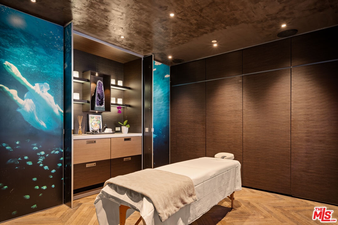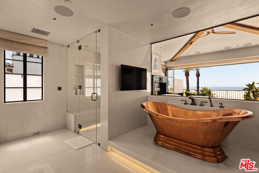 Welcome to Villa Molori, a legacy estate along the famed Palisades Beach Road in Santa Monica. Once graced by legends like Charlie Chaplin and Howard Hughes, this exclusive enclave known as the original "Billionaire's Beach"is now home to tech moguls, film executives, and captains of industry seeking the ultimate coastal retreat. Crafted by Molori Design, this world-class resort-style estate exemplifies coastal luxury. With multiple access points and proximity to first responders, experience unmatched serenity with 24-hour private security and a fully staffed fire station just yards away. From the lushly landscaped grounds and private infinity-edge pool with hot tub and cold plunge, to the open-air stainless steel kitchen by Kalamazoo and dual alfresco lounge areas, every inch of the exterior was designed for both celebration and serenity. Tropical gardens and soaring palms form a green cocoon of privacy while offering unobstructed ocean views that stretch to the horizon.Inside, soaring ceilings and wide-plank chevron oak floors lead you through a gallery of European-inspired luxury. Floor-to-ceiling glass doors open to create united indoor and outdoor spaces, blurring boundaries between architecture and nature. A grand formal living room is framed by Ebony Macassar and Thassos stone, opening to an expansive deck ideal for sunset entertaining. A statement fireplace anchors an outdoor dining area set beneath the stars, wrapped in tall bamboo for ultimate seclusion. The chef's kitchen, inspired by the famed El Bulli restaurant and designed in collaboration with culinary innovator Juan Carlos Ramos, features bespoke cabinetry and Wolf & Sub-Zero appliances. An elegant dining room seats up to 25 guests, flanked by French doors and ocean breezes. Upstairs, the showstopping primary suite is a sanctuary of light, warmth, and view. Vaulted ceilings with exposed beams and a sculptural wood fan crown a space anchored by a sleek fireplace and floor-to-ceiling doors that open to a private balcony. Enjoy watching your best films with a full screen projector and surround speakers. Herringbone floors echo the craftsmanship throughout, while a spa-worthy bath with copper double slipper tub and steam shower completes the retreat. A second primary suite mirrors the luxury, with retractable glass walls and a private terrace with rooftop jacuzzi. Every bedroom feels like a five-star hotel suite, featuring built-in coffee stations, private bars, and luxurious en-suite baths. A state-of-the-art home theater, gym, yoga/pilates studio. The villa also features a modern minimalist steam room with a unique heavy metallic porthole window. The massage room features a Murphy bed and can be turned into a 6th bedroom. A Geothermal radiant serves for the floor & pool heating speaks to the no-expense-spared ethos. Technology meets tranquility with full Control4 home automation, sound-engineered windows and doors, a private garage and generous guest parking. Surrounded by neighbors such as George Rosenthal or David Bonderman, this stretch has long attracted A-listers and visionaries. The home was untouched and not evacuated during recent wildfires testament to its prime location and enduring security. A once-in-a-generation offering on the most sought-after shorelines ready for your permanent home.