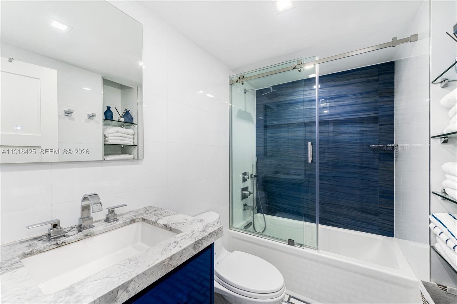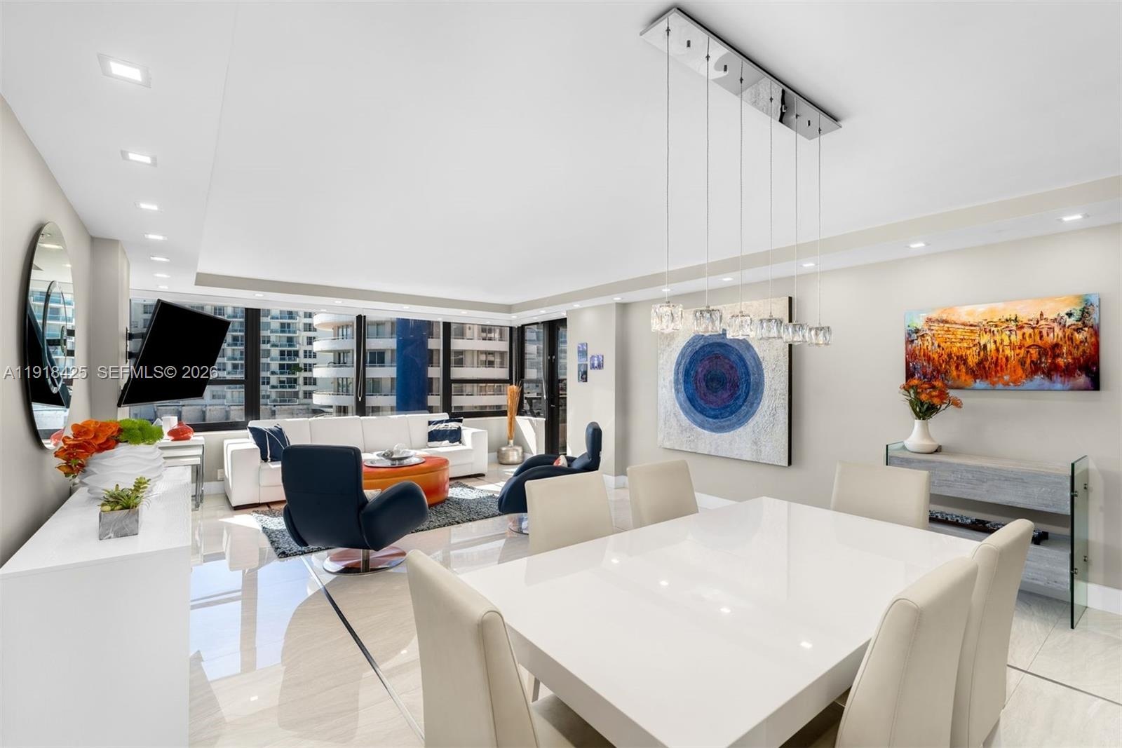 Welcome to this bright and modern residence at The Alexander, located on the south side of the building with sun all day. The home features an open living and dining area, a contemporary kitchen with island seating, and a private balcony overlooking the pool and ocean. The primary bedroom offers generous closet space and an en-suite bathroom, while the second bedroom has a full closet with a bathroom located across the hall. Additional features include an in-unit washer and dryer and tile floors throughout. Residents enjoy a direct beachfront location on Collins Avenue with easy access to the ocean, perfect for morning walks or taking your bike along the boardwalk. Resort-style amenities at The Alexander include two outdoor pools, an on-site restaurant and poolside bar, a fitness center with sauna, spa services, beach service, and valet parking. A relaxed, welcoming home with every convenience at your doorstep.
