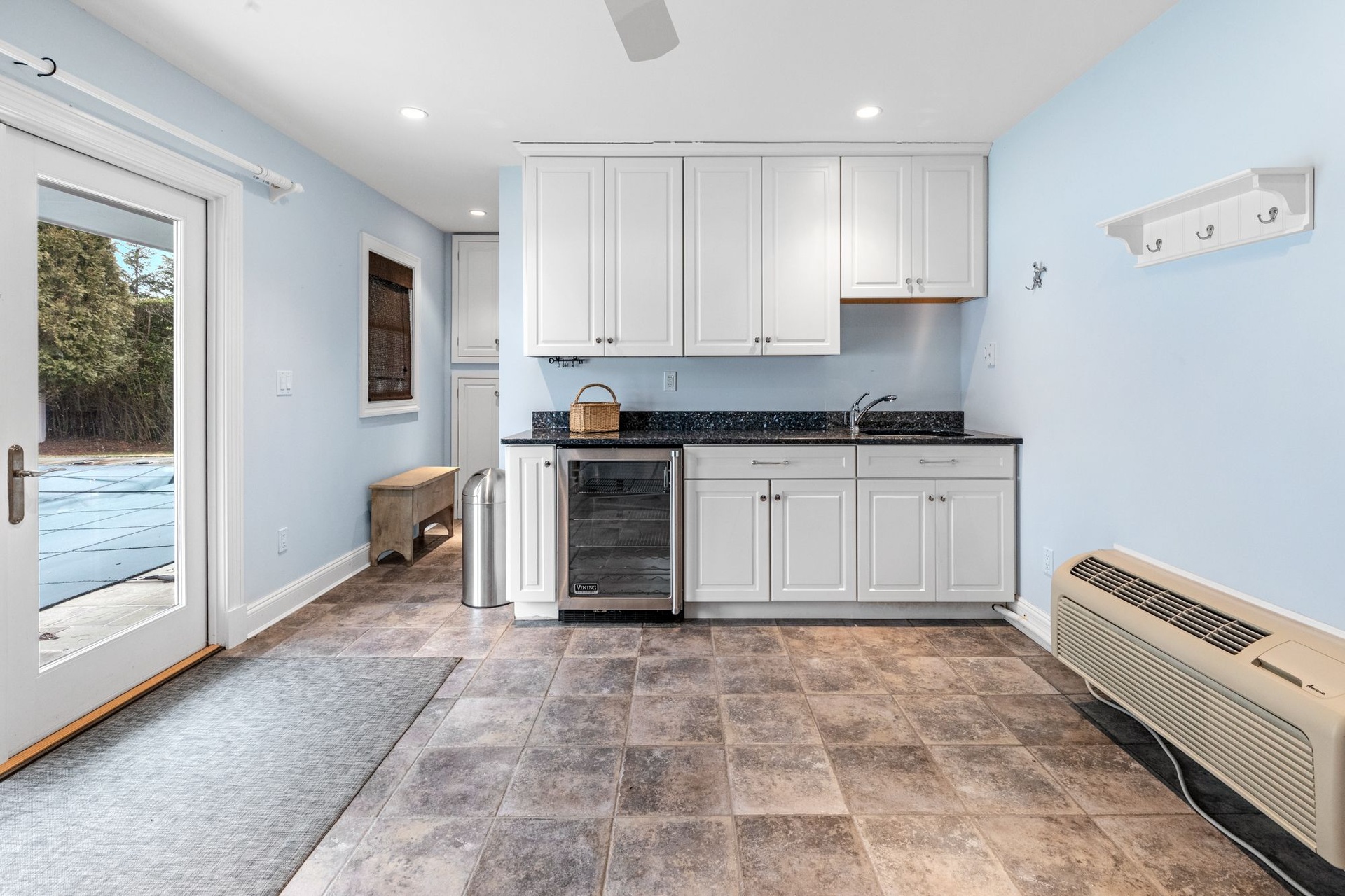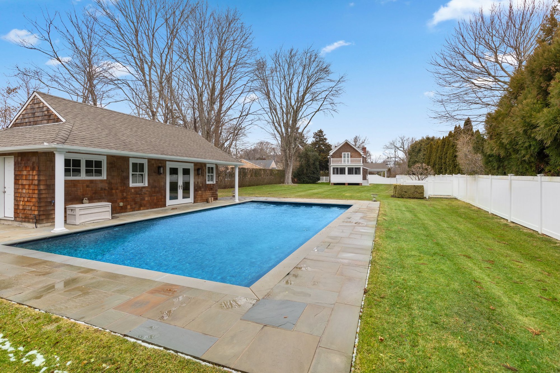 Outdoors, the property unfolds to a generous level lawn, heated pool, and a fully equipped pool house with kitchenette, bath, storage, and outdoor shower — perfect for summer gatherings and resort-style living right at home.