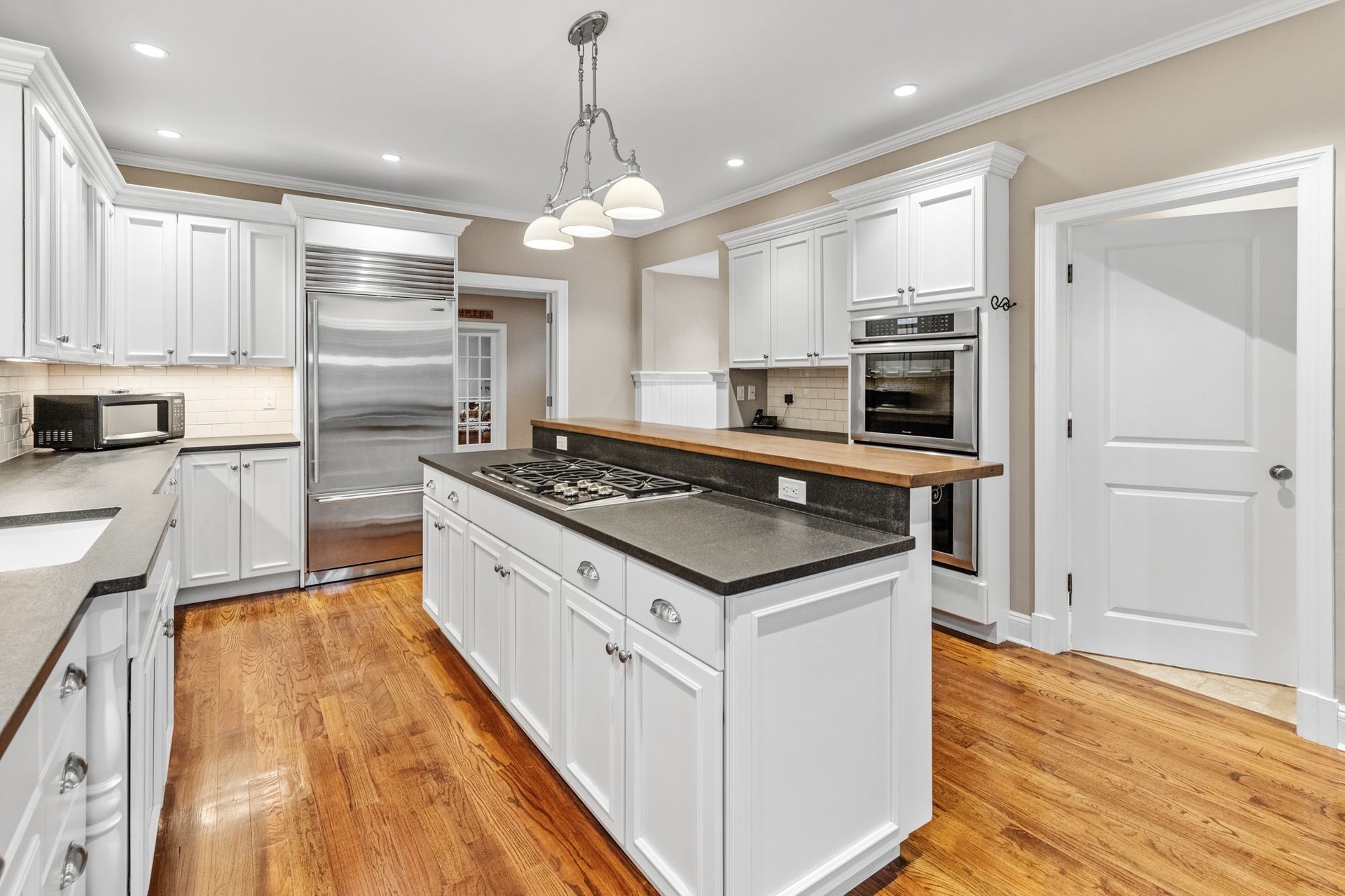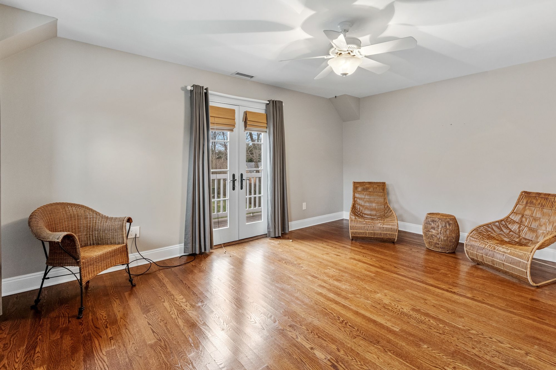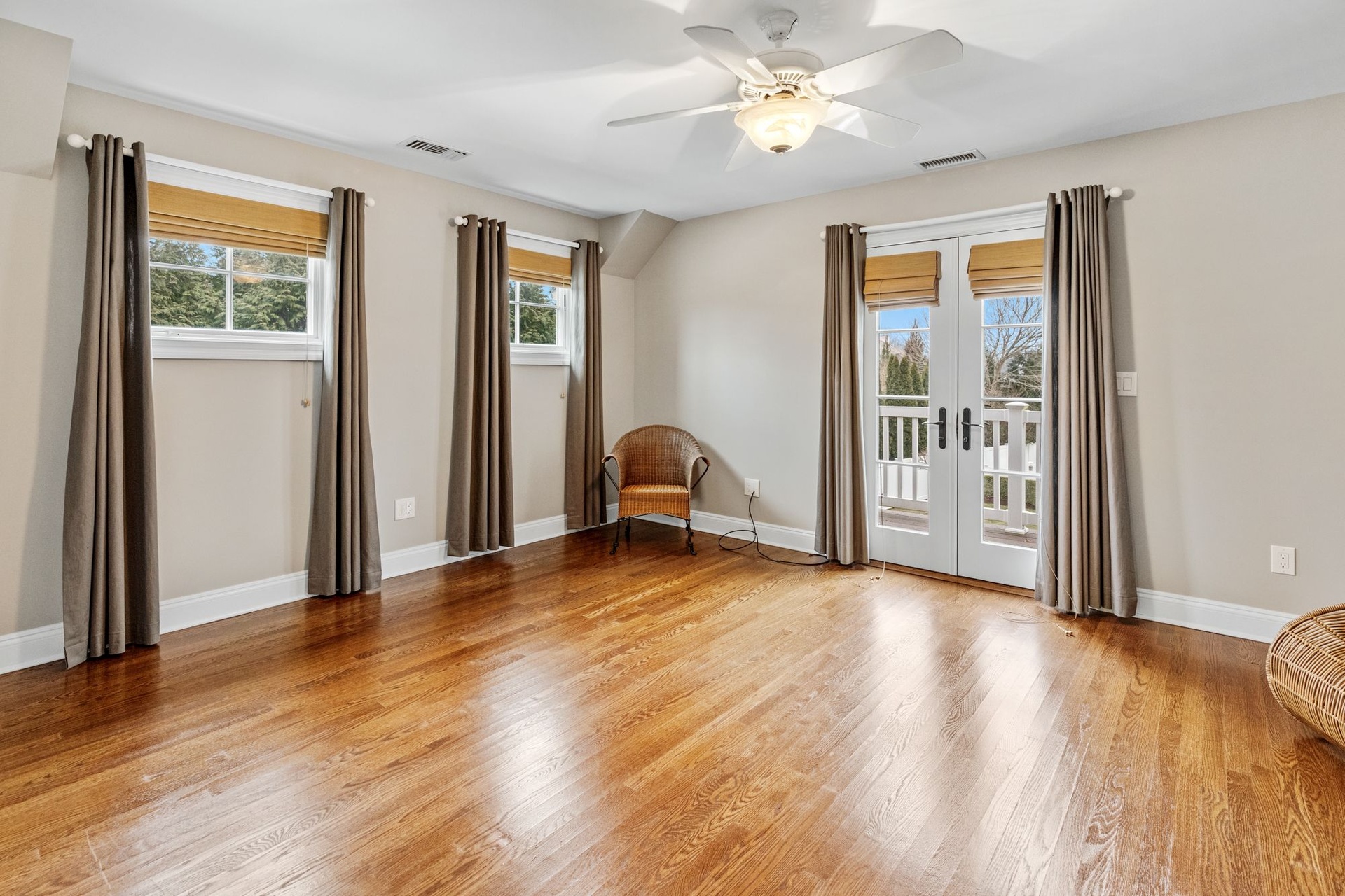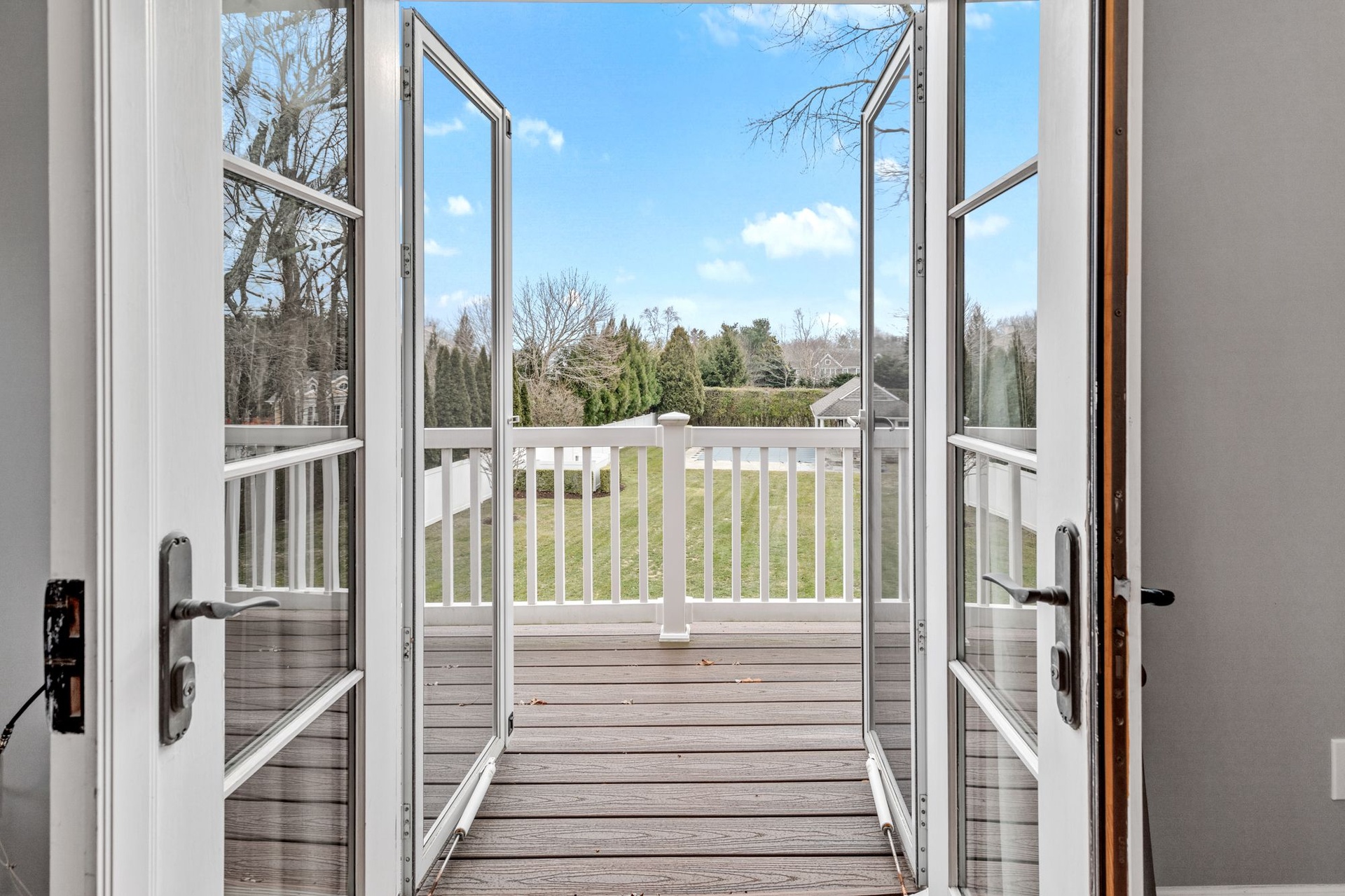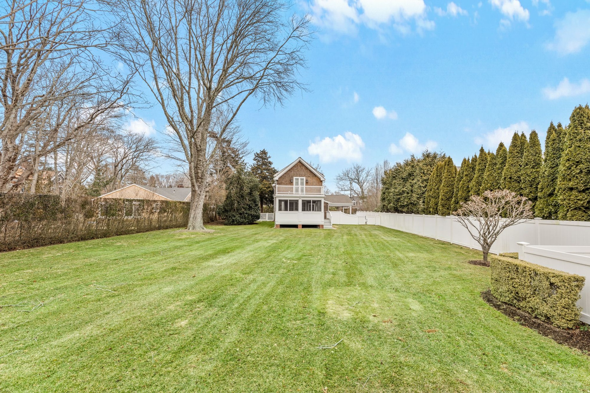 Upstairs, a private primary suite boasts dual closets, a luxurious double-vanity bath, and French doors opening to a balcony terrace overlooking the expansive yard — creating an idyllic vantage point for morning coffee or evening sunset views.