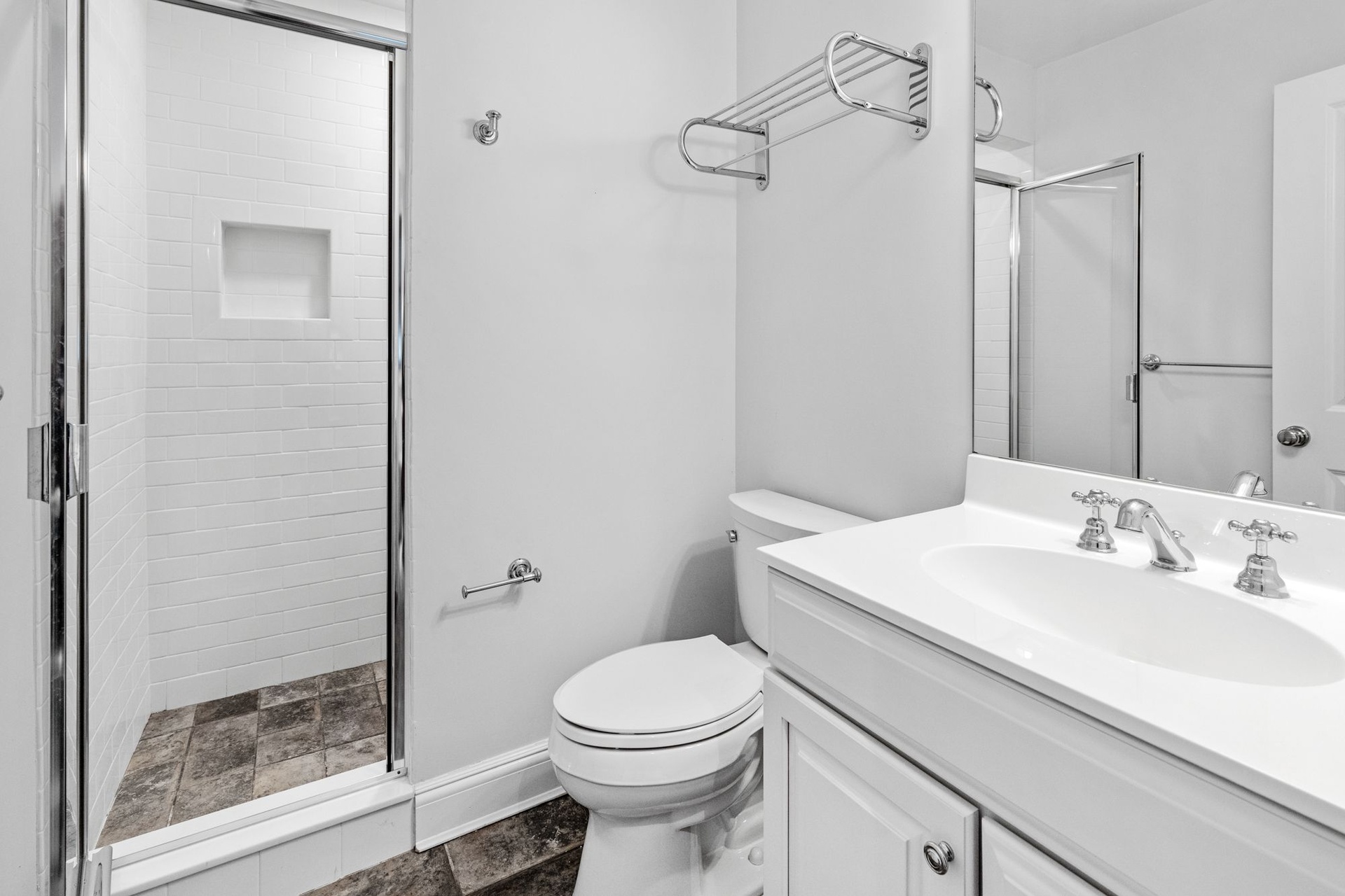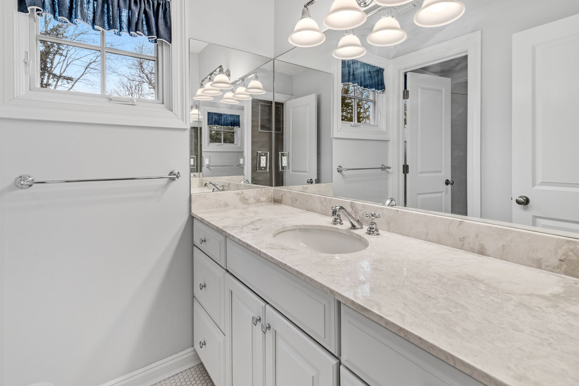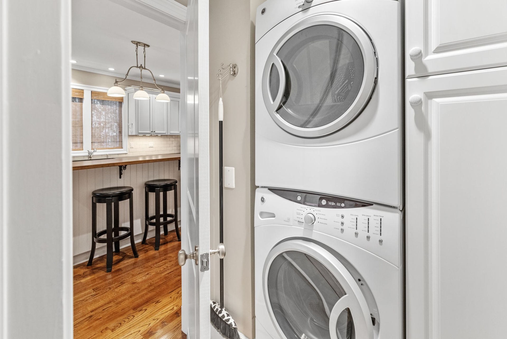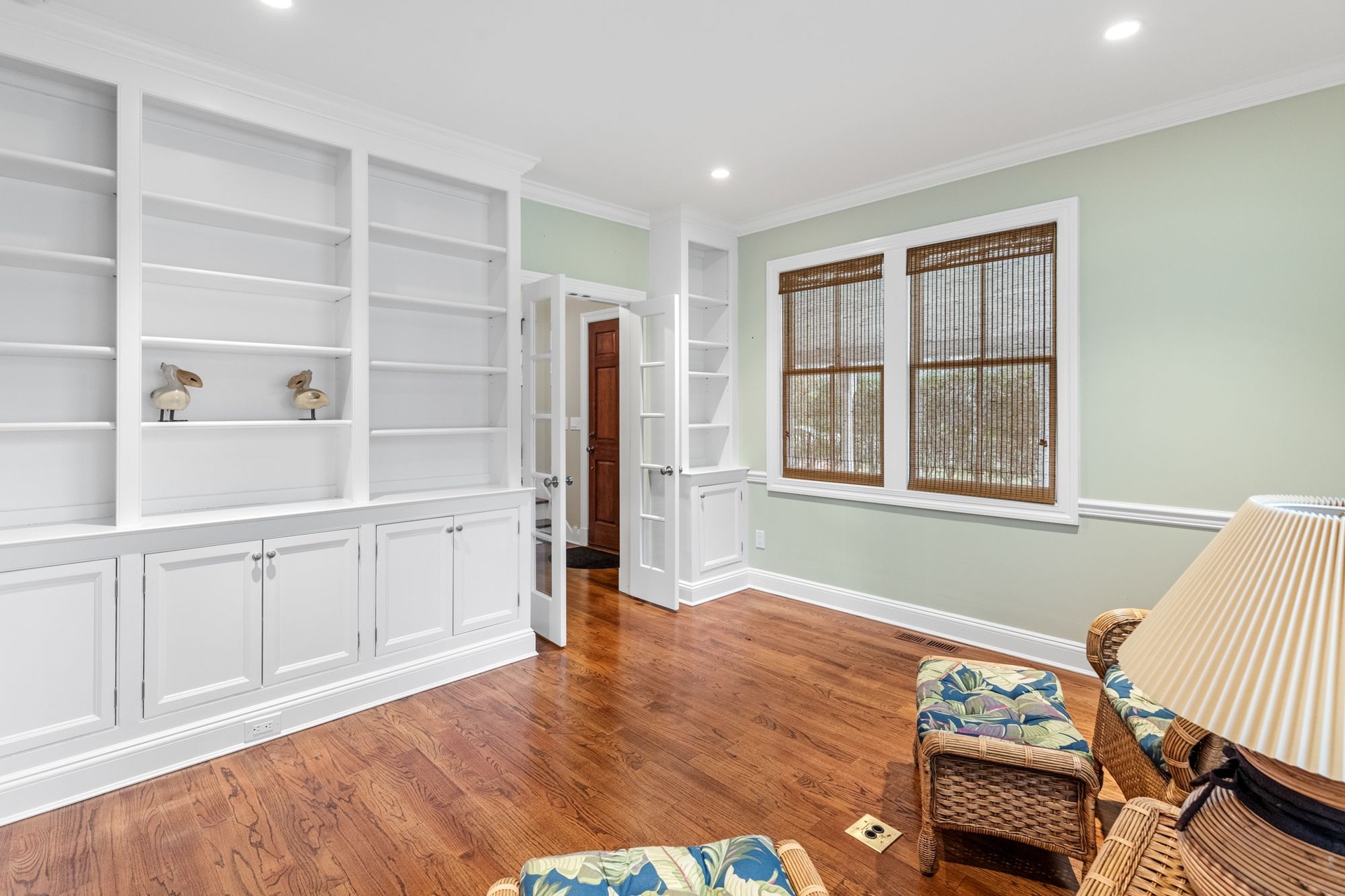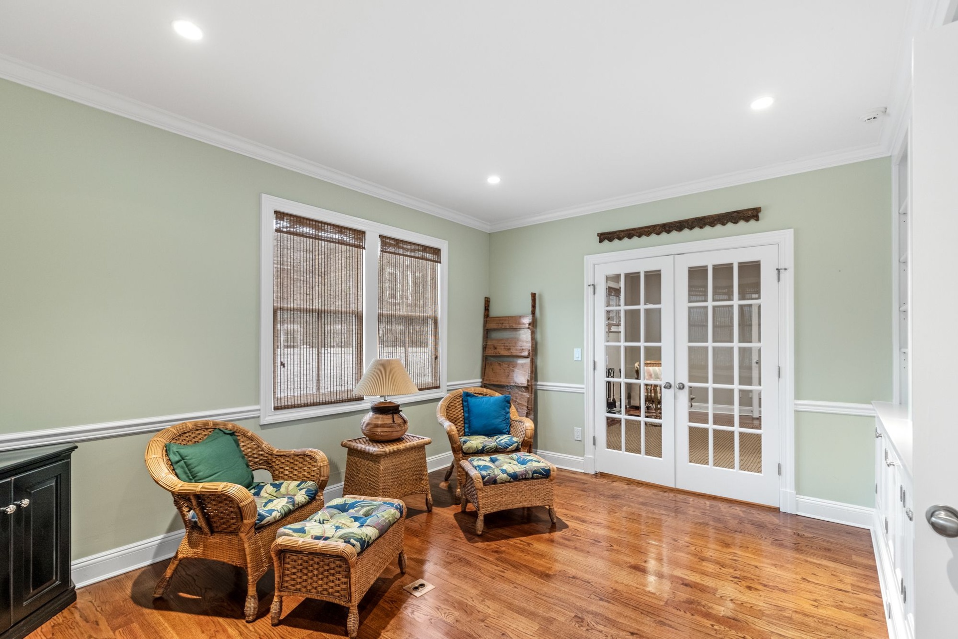 Upstairs, a private primary suite boasts dual closets, a luxurious double-vanity bath, and French doors opening to a balcony terrace overlooking the expansive yard — creating an idyllic vantage point for morning coffee or evening sunset views.