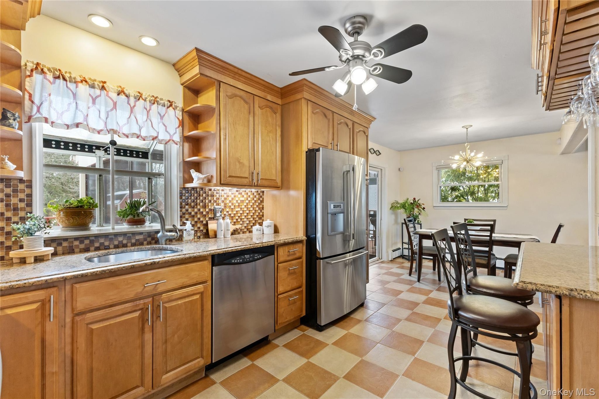 Inside, the sun-filled living room is anchored by a stunning stone fireplace, creating a cozy gathering space for relaxing evenings or entertaining guests. Hardwood floors throughout add timeless appeal and flow seamlessly into the heart of the home. The updated kitchen features tile flooring, stainless steel appliances, granite countertops, and a convenient breakfast bar, ideal for casual meals, morning coffee, or keeping conversations going while you cook. The kitchen opens naturally to the dining area, making it perfect for both everyday living and special occasions.