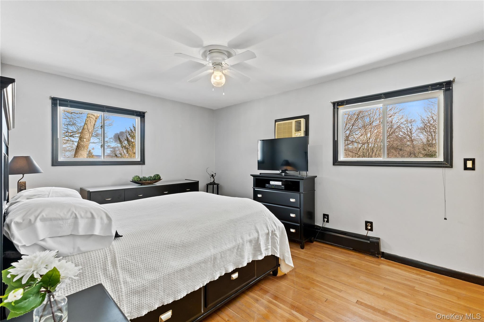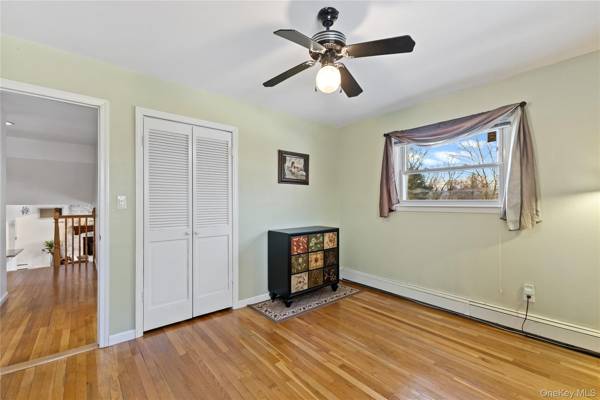 A few steps up, you’ll find an updated full bath with a walk-in shower, conveniently connected to the largest of the three bedrooms on this level—ideal for guests, a home office, or flexible living arrangements. Two additional bedrooms, all with hardwood floors, complete the floor.