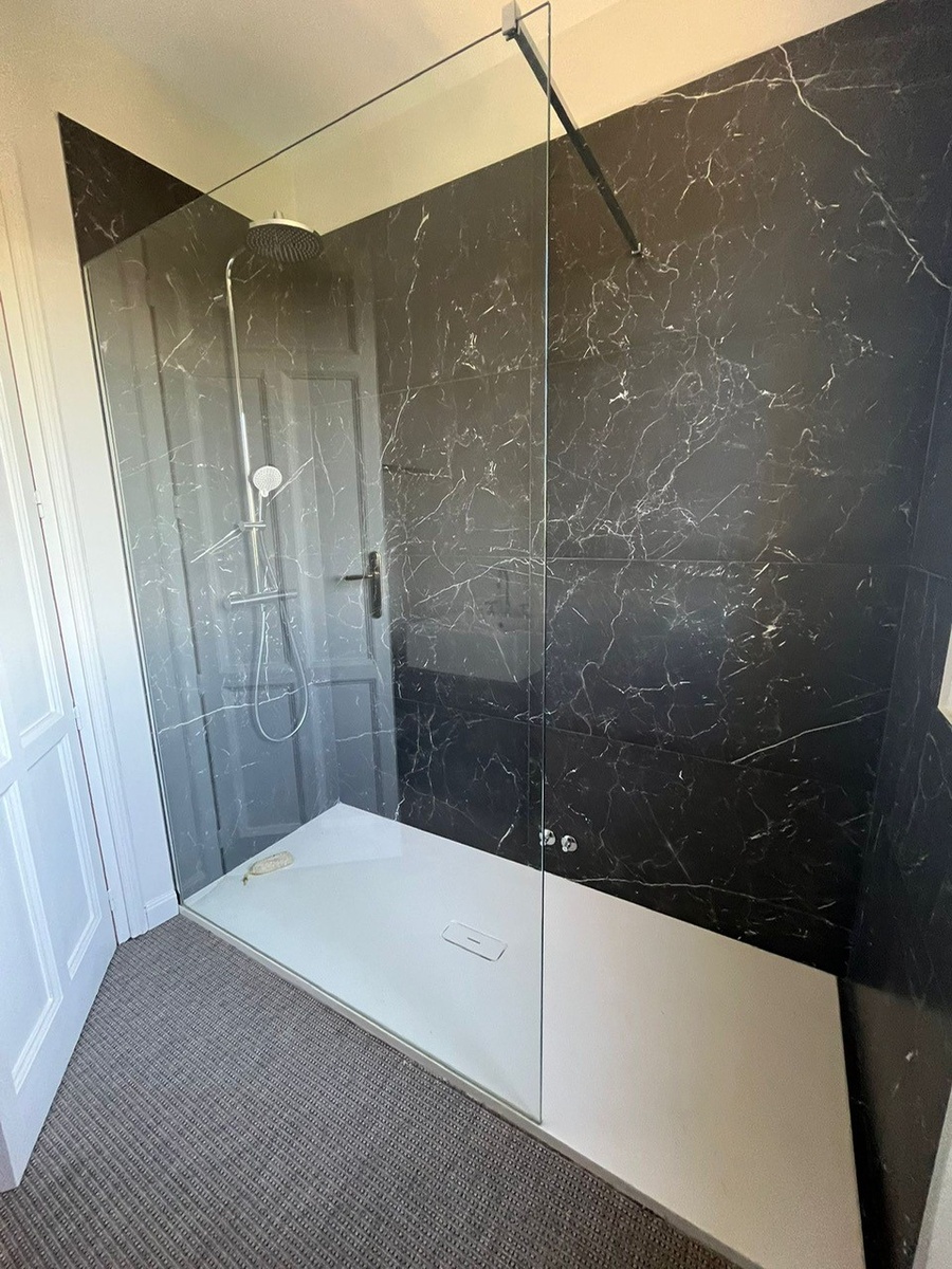 Suite Bedroom I with en-suite bathroom and bespoke grey shelving