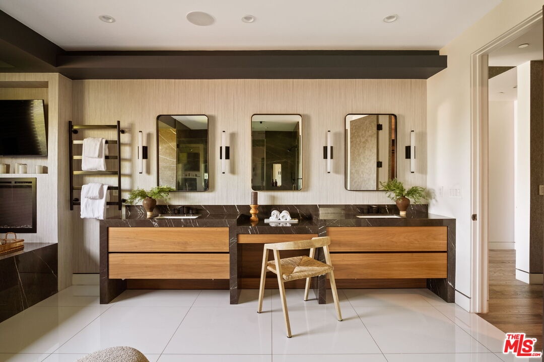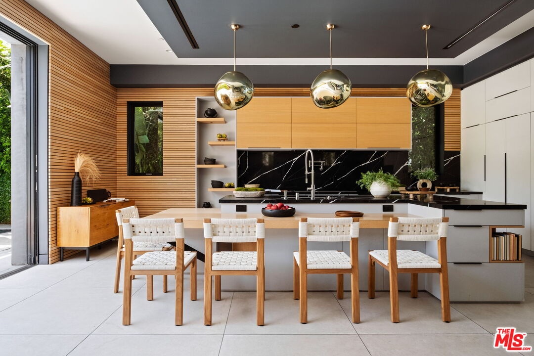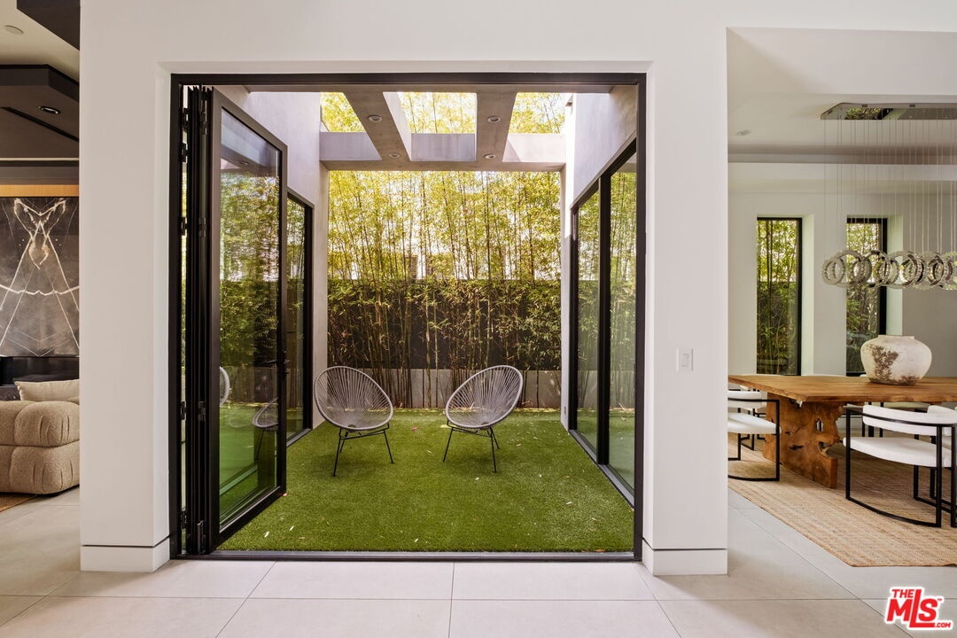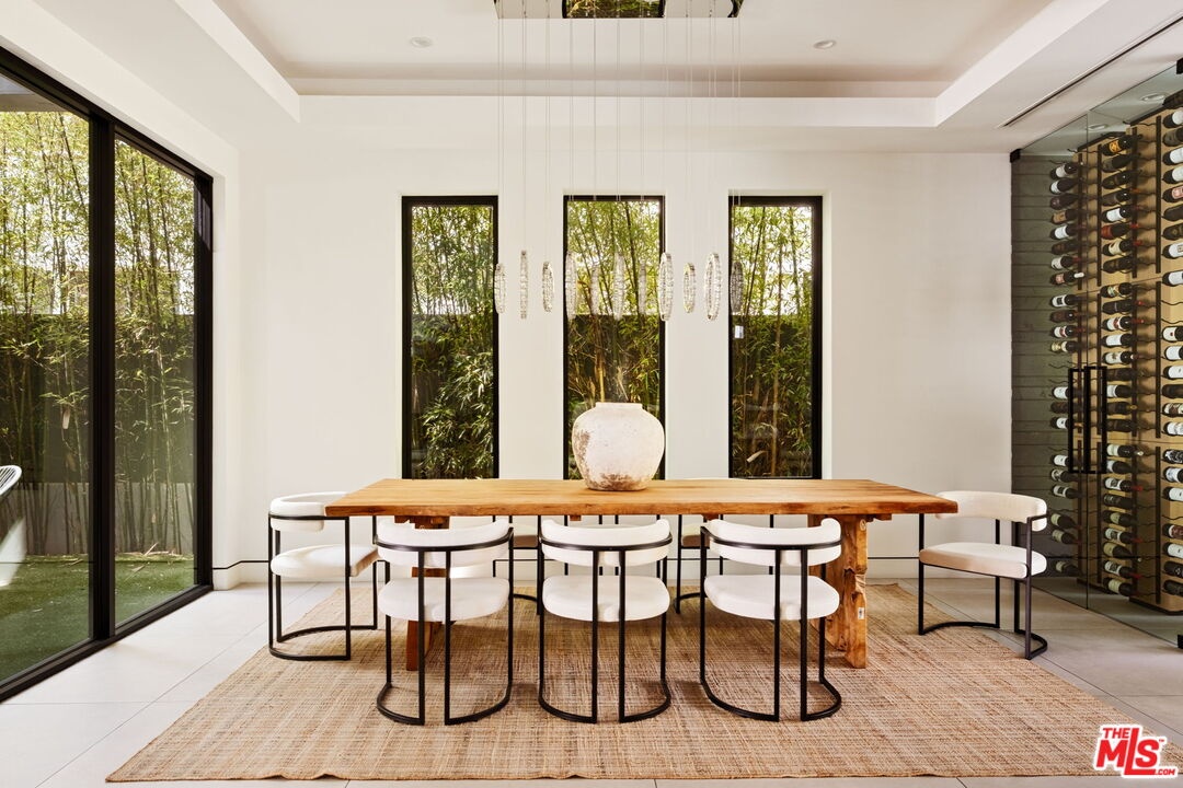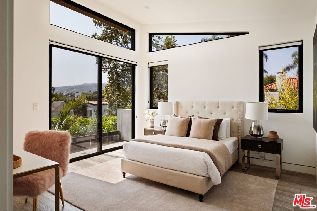 Step into this striking architectural residence, boasting a large rooftop with views of the Hollywood sign, Griffith Observatory, downtown LA, Century City and beyond! A private sanctuary set in one of Los Angeles' most coveted neighborhoods. Designed for luxurious living and effortless entertaining, this home offers a seamless blend of sophistication, comfort, and cutting-edge innovation. A grand open-concept layout welcomes you with soaring ceilings, expansive walls of glass, and an abundance of natural light. The chef-inspired kitchen is a centerpiece, featuring a full suite of premium Miele appliances, sleek cabinetry, and an oversized island perfect for casual dining or social gatherings. A stylish family room and formal living area flow into a lush courtyard, anchored by a dramatic indoor-outdoor connection through disappearing pocket doors. From intimate dinners to large-scale events, the main level offers a full bar, a glass-enclosed wine wall, a media room, and a private guest suite. A floating glass staircase leads to the upper level, where you'll find four generous ensuite bedrooms. The primary retreat is a serene escape with dual walk-in closets, a private balcony, and a spa-quality bath outfitted with a soaking tub, rainfall shower, double vanity, and high-tech amenities including a smart toilet and heated towel rack. For those who appreciate California's signature indoor-outdoor lifestyle, the rooftop deck offers expansive panoramic views, a built-in outdoor kitchen, fire pit, and plenty of lounge space to take in the sunset. Down below, the backyard is a resort-style oasis with a zero-edge pool and spa, custom outdoor shower, and beautifully landscaped grounds surrounded by privacy hedges. This smart home is equipped with Crestron automation, integrated speakers, dual-zone climate control, solar power with Tesla wall batteries, EV charging, and a whole-house water filtration and softener system. Additional features include an executive office, fitness room, marble-accented fireplaces, and a secure two-car garage with gated driveway access. Tucked away in a premier location just steps from The Grove, boutique shopping, and top-tier dining, this home is a rare opportunity to own a modern masterpiece in the cultural heart of L.A.