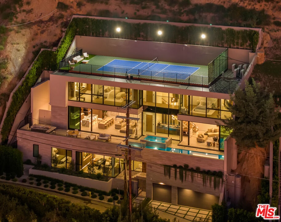 This newly constructed Classic Modern Hollywood Hills residence spans approximately 6,000 square feet and reflects a level of quality, design, and execution rarely found in new construction. Conceived and built by well known, experienced, design-driven team, the home emphasizes thoughtful architecture, refined materials, and seamless livability throughout. The floor plan offers four bedrooms plus a dedicated office, anchored by wide-plank walnut floors and travertine stone that bring warmth and cohesion to the interiors. The kitchen is outfitted with a full suite of Miele appliances. Floor-to-ceiling Fleetwood doors and windows frame sweeping ocean and city views while creating effortless indoor-outdoor flow. Every element of the home was carefully considered, from the proportions of the living spaces to the precision of the finishes. Amenities include an elevator, full smart-home integration, generous storage, wet bar, and wine refrigeration. A three-car garage with additional driveway parking an uncommon luxury in the Hills adds both convenience and functionality. Outdoor spaces are equally well executed, featuring a pool and spa, outdoor kitchen, full bar, fire pit, and a private pickleball court, all designed to maximize privacy, views, and year-round entertaining. This is a highly refined, turnkey offering that blends architectural integrity with modern luxury living in one of Los Angeles' most sought-after settings.