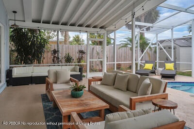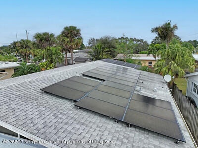 This beautifully upgraded vaulted-ceiling mid-century single-family home in Palm Beach Gardens features 3 bedrooms and 2 bathrooms, with no HOA fees. Recent renovations include a new roof (2018), solar panels