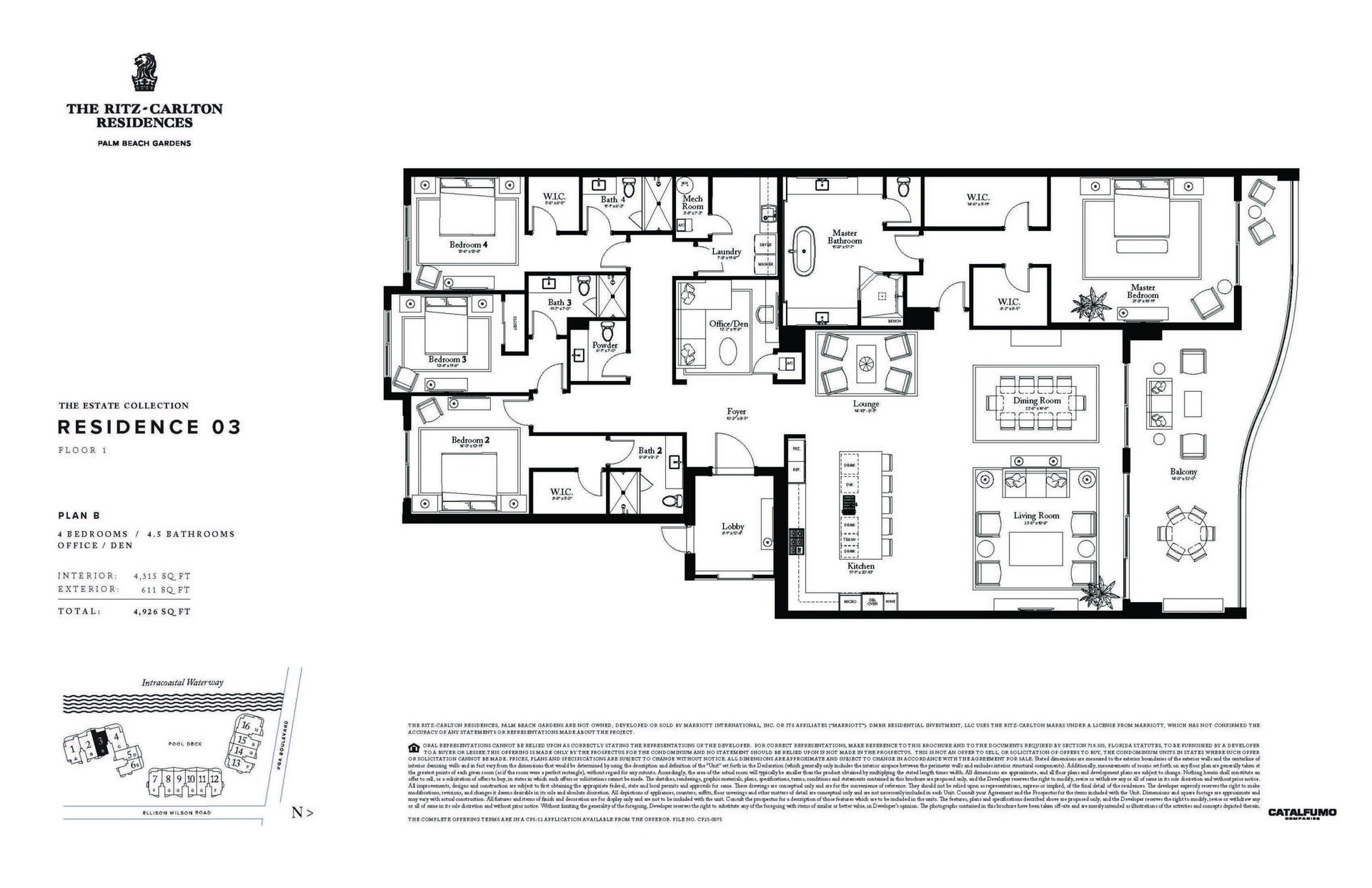 Move in this spring to Residence 103B at The Ritz-Carlton Residences, Palm Beach Gardens. Located on the 3rd floor of the South Building, this expansive 4BR + den, 4.5BA residence lives like a private estate home w/ spacious flow-through layout & a 52' by 14' wide balcony overlooking the Intracoastal, offering immersive water views. Floor-to-ceiling triple-pane glass fills the home with natural light. Features incl. private elevator, European oak cabinetry, Wolf & Sub-Zero appliances w/ gas cooktop, & 2 oversized garaged parking spaces. The boutique property of only 106 private residences w/ no hotel is managed & staffed by The Ritz-Carlton, plus a private 29-slip marina, pickleball courts, dog park, infinity-edge pool, cabanas, guest suites & 20,000 sq ft of amenities. Completion Q2 2026