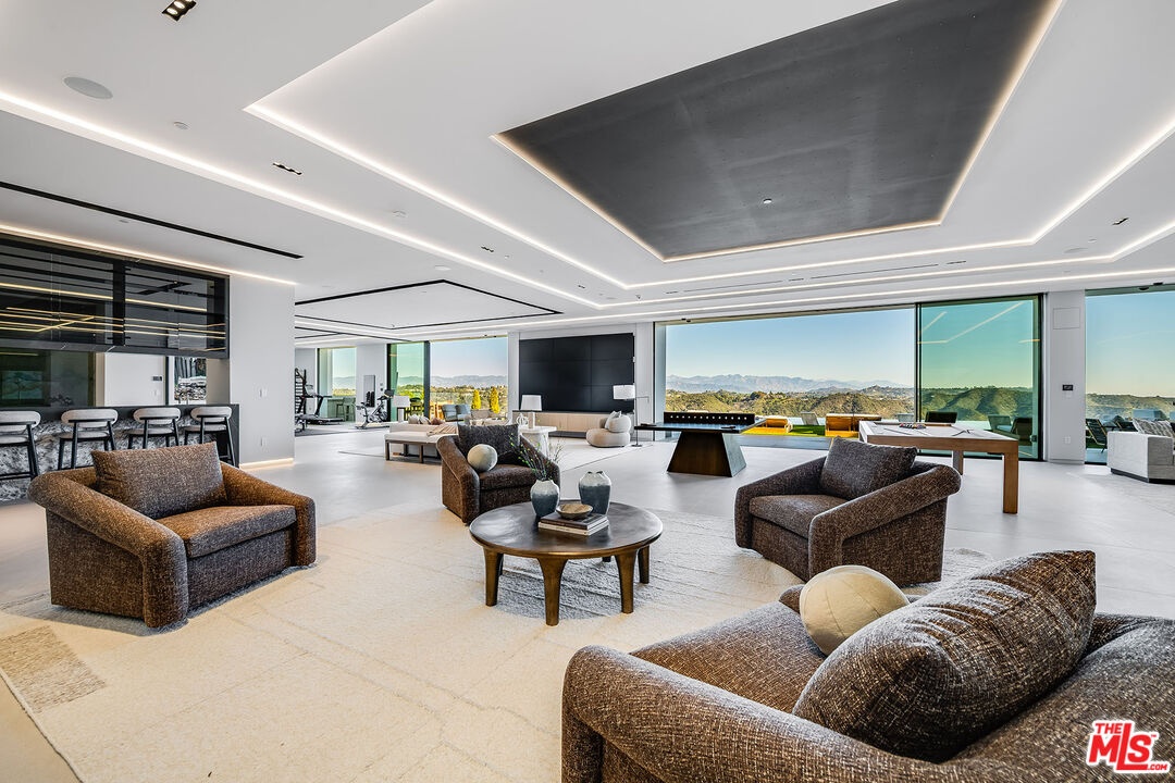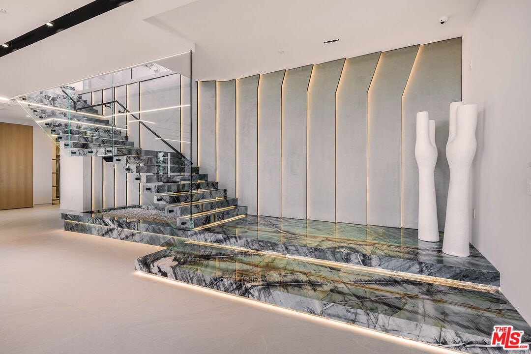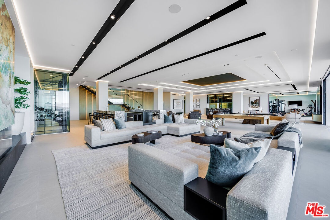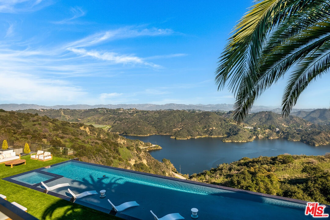Poised above Bel Air with sweeping city, canyon, and reservoir views, this contemporary architectural estate is defined by luminous design, sculptural form, and a refined connection to nature. Approached through a double-gated entry and expansive motor court, the residence reveals a striking facade enhanced by custom illumination and serene reflecting water features anchored by mature olive trees. Backlit onyx columns frame the entrance, setting a tone of quiet sophistication.The main living pavilion offers an open, radiant flow for dining and relaxation, surrounded by full-height automatic glass doors, refined stone surfaces, warm wood tones, and breathtaking views throughout. A floating green onyx staircase connects each level, thoughtfully designed to inspire and maximize light across the home.A chef's culinary haven, the residence features four kitchens designed for entertaining, professional preparation, and seamless service. The main level kitchen is equipped with dual oversized islands, a full suite of Gaggenau appliances, European cabinetry, and a walk-in industrial stainless-steel refrigeration room. A separate restaurant-grade chef's kitchen with stainless-steel finishes and Miele appliances supports large-scale culinary preparation, complemented by a dedicated butler's kitchen and an outdoor kitchen with pizza oven for catered events at scale.The entertainment level is a world unto itself, featuring a private two-lane bowling alley, cinema-grade theater, sophisticated lounge and bar, and a temperature-controlled wine cellar. A full private wellness retreat includes a Turkish hammam with dry sauna, steam room, cold plunge, hot tub, massage tables, hair and nail salon, juice bar, and a glass-enclosed fitness studio oriented toward expansive views.The upper level hosts the primary suite, a private sanctuary with panoramic vistas, dual walk-in closets, and dual bathrooms finished in marble and onyx, each appointed with TOTO smart systems. Three additional ensuite bedrooms feature floor-to-ceiling glass, custom closets, and serene natural finishes.Outdoor living is highlighted by an infinity-edge pool blending into the horizon, expansive stone terraces, fire features, softly illuminated landscaping, and a private hillside vineyard that enhances the home's sense of retreat. A refined contemporary estate, this tour de force embodies elegance, innovation, and tranquility in one of Bel Air's most elevated settings.