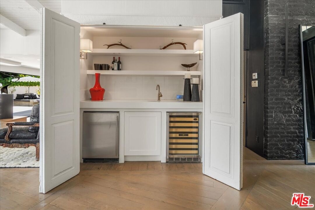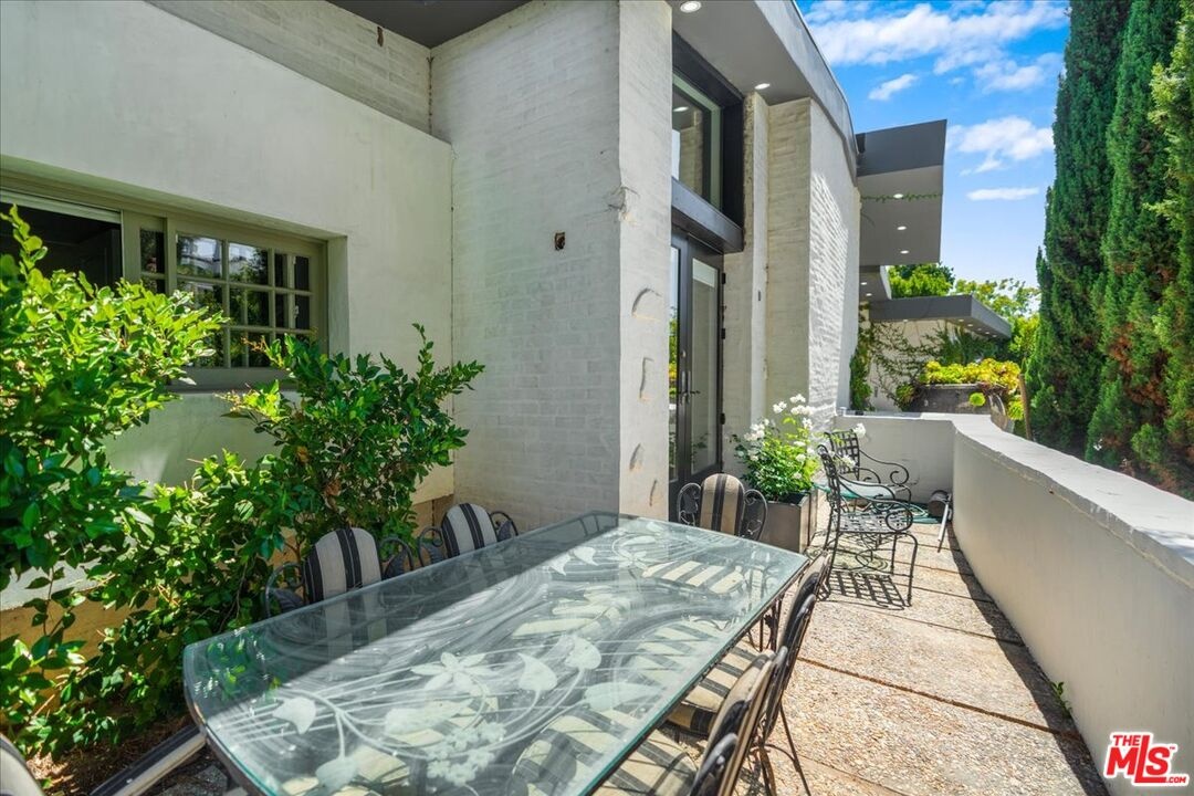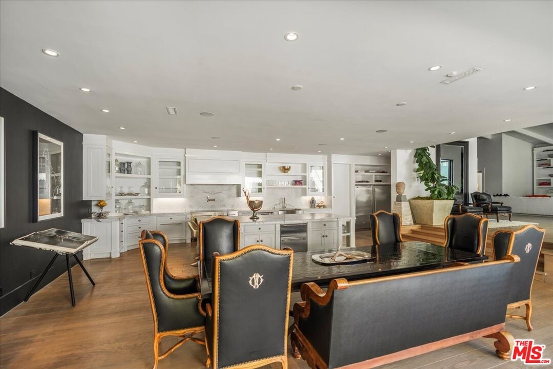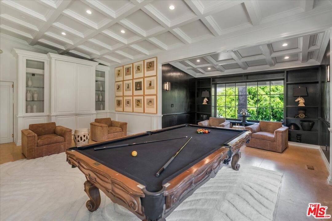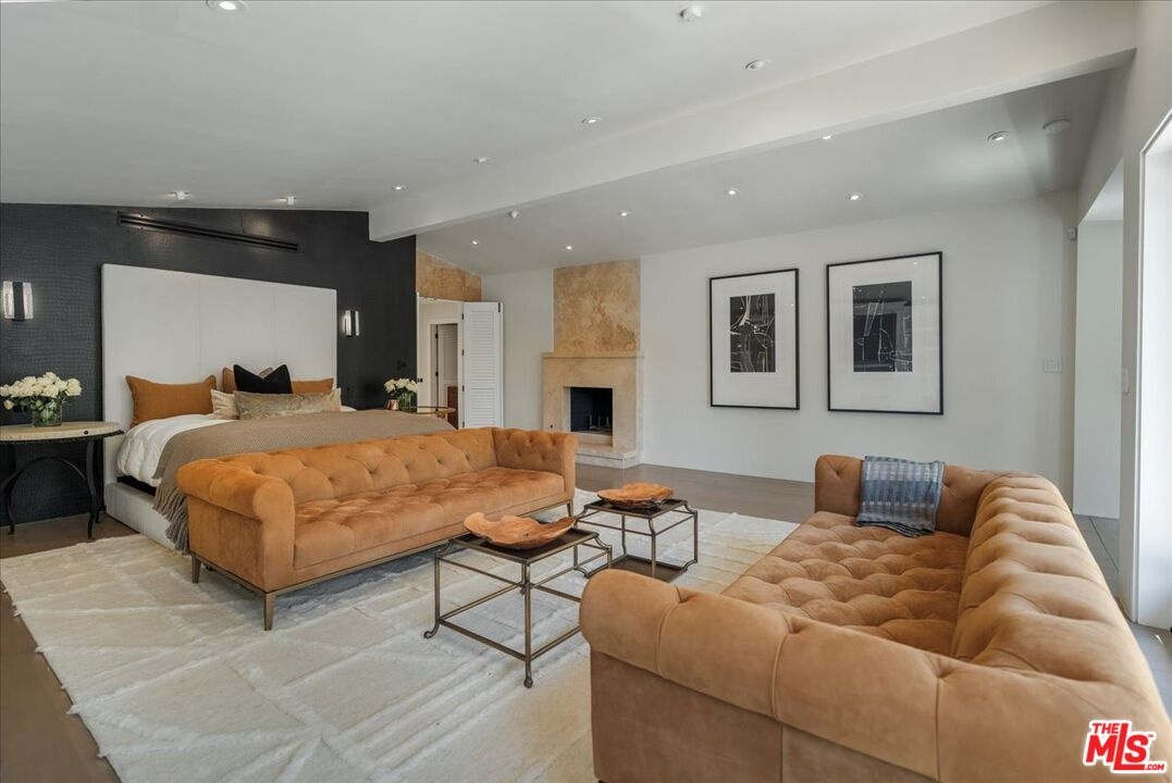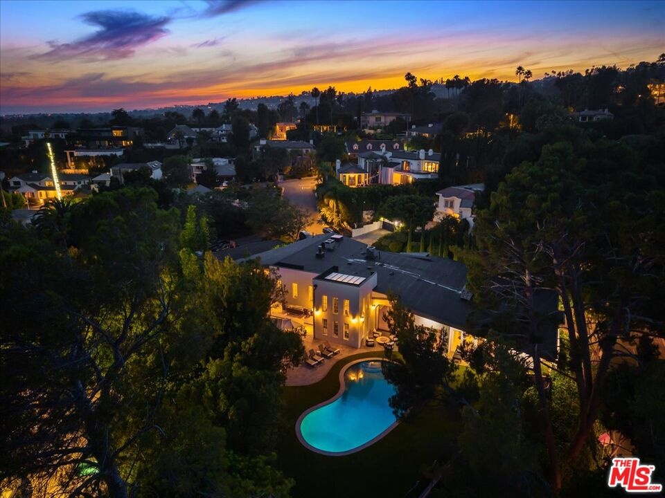 The Weinhart Estate. For the first time in nearly three decades, this rare mid-century jewel comes to market. Set on an elevated corner lot in the tranquil hills above the flats, the home offers the perfect blend of privacy, pedigree, and location. Clean mid-century lines, soaring beamed ceilings, and walls of glass capture panoramic canyon views while seamlessly merging indoor and outdoor living. The residence unfolds with a dramatic pivoting front door, expansive living spaces anchored by a striking stone fireplace, and a 40-foot chef's kitchen outfitted with a 12-foot island, dual Wolf induction ranges, Sub-Zero refrigeration, and book-matched statuary marble. A marble-topped wet bar, sophisticated den, and thoughtfully designed entertaining areas reflect timeless mid-century glamour. Upstairs, the skylit primary suite features a private balcony, marble fireplace, dual walk-in closets, and a spa-like bath. Additional guest suites echo the home's refined aesthetic. Outside, lush landscaping surrounds a Pebble-finish pool, built-in barbecue, and multiple terraces for alfresco dining and lounging. An extraordinary opportunity to own an authentic piece of mid-century style in one of Beverly Hills' most coveted settings just moments from the iconic Beverly Hills Hotel and the world-renowned shops and dining of Rodeo Drive.