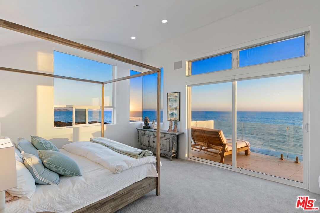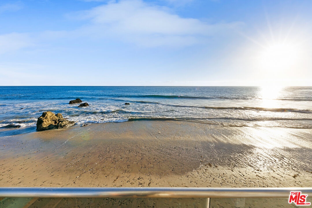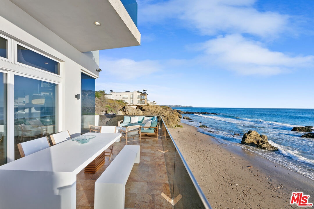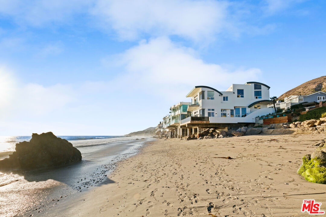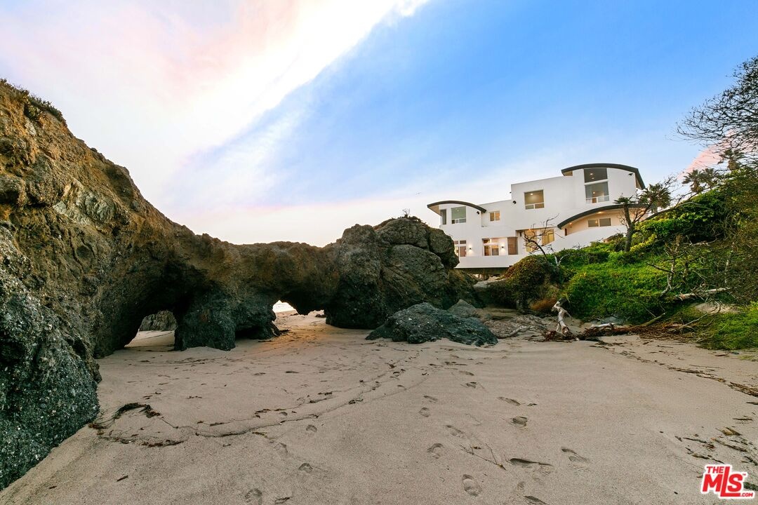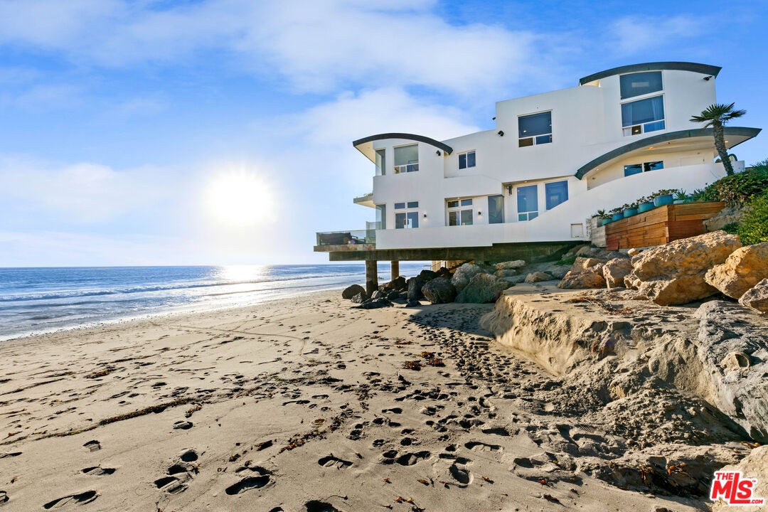 Welcome to this uniquely located seaside escape, a warmly crafted architectural residence situated in a private, gated enclave in the highly coveted Broad Beach neighborhood. This oceanfront retreat captures mesmerizing ocean views from nearly every room. Nestled on two premier beachfront parcels, the property features an impressive 60 feet of pristine ocean front. This custom home was designed 25 years ago by the esteemed Barsocchini & Associates for the current owner. This unique Malibu gem is currently being offered for long term lease. Located in the prestigious Sea Level Drive enclave, the home enjoys exceptional privacy and unobstructed views of dramatic rock formations and twinkling city lights, thanks to its prime position between two development-restricted lots. Architectural highlights include a distinctive Wave Motif copper-clad roof, artisanal art glass windows, bespoke iron railings, and inviting stone bathrooms. The welcoming interiors are characterized by soaring ceilings, expansive picture windows that bathe the rooms in natural light, and charming finishes, creating a harmonious blend of comfort and style. The bright living and dining areas on the main floor open onto a spacious wraparound deck, ideal for al fresco dining, barbecues, and relaxation by the sea. The gourmet kitchen, with its vaulted ceiling, custom cabinetry, bar seating, breakfast nook is a chef's delight. A stairway from the kitchen leads to an outdoor shower and the sandy beach. The main level also includes a bedroom and a full bath, while the lower level features a vast media/recreation room with a fireplace, laundry room, and bath. The upper floor houses three en-suite bedrooms, including the breathtaking ocean-view primary suite. This retreat features two walk-in closets, extensive built-ins, an oceanfront balcony, a spa-inspired bathroom with ocean views. Situated down the hallway lies a stylish library lounge, ideal for zoom calls, reading and relaxing. The adjacent lot provides a terraced outdoor sanctuary for entertaining and soaking in the sound of the breaking surf. The striking rock formations to the east are a source of constant visual delight. A surfer's hideaway for locals is a paddle away. The property includes a two-car garage and additional parking for four vehicles in the driveway. With its superbly executed design and one of a kind beachfront location, this residence invites you, your family and friends to indulge and enjoy the luxury of the Malibu beach lifestyle.