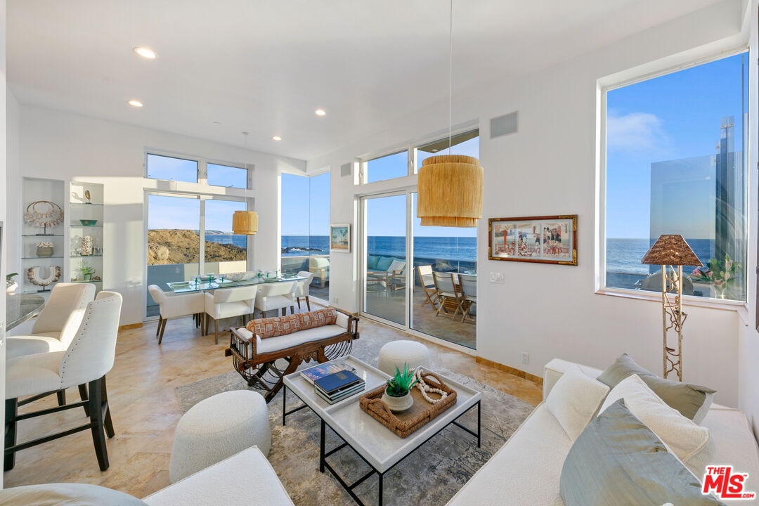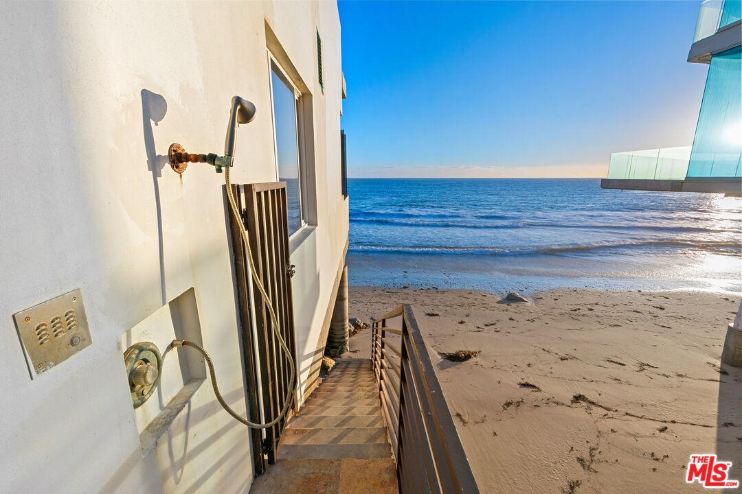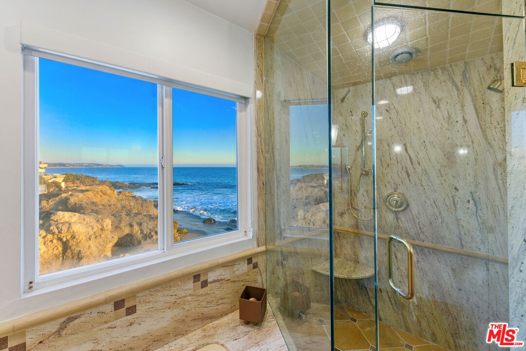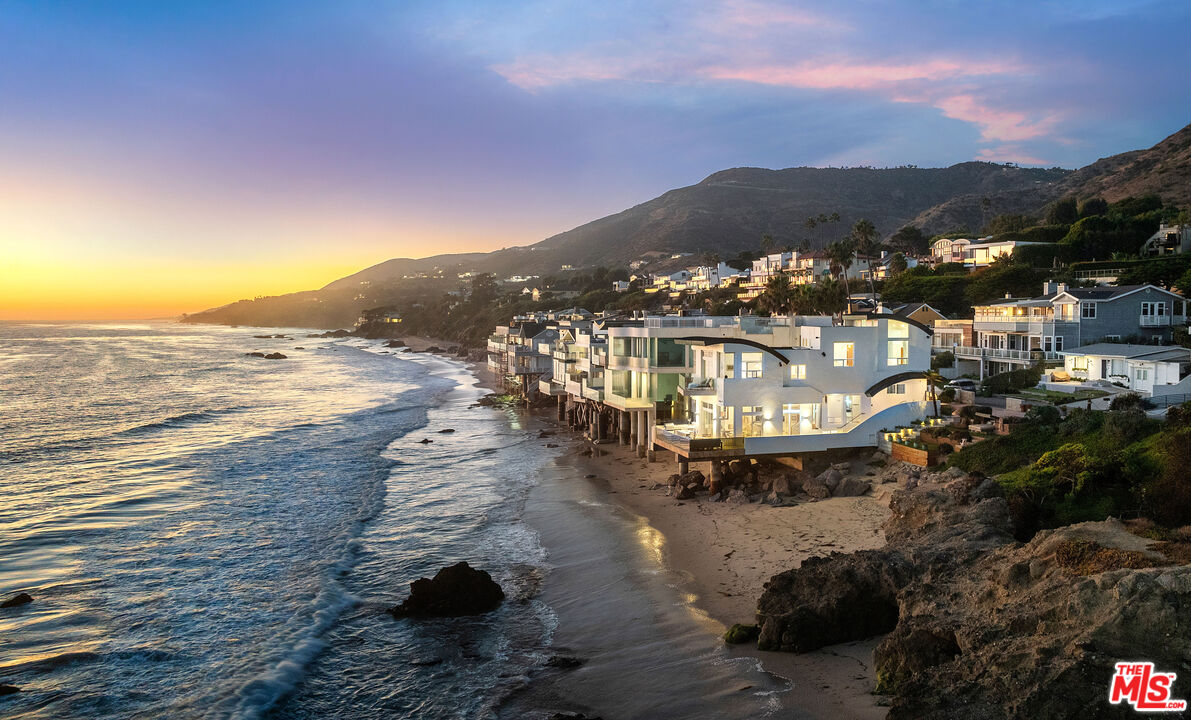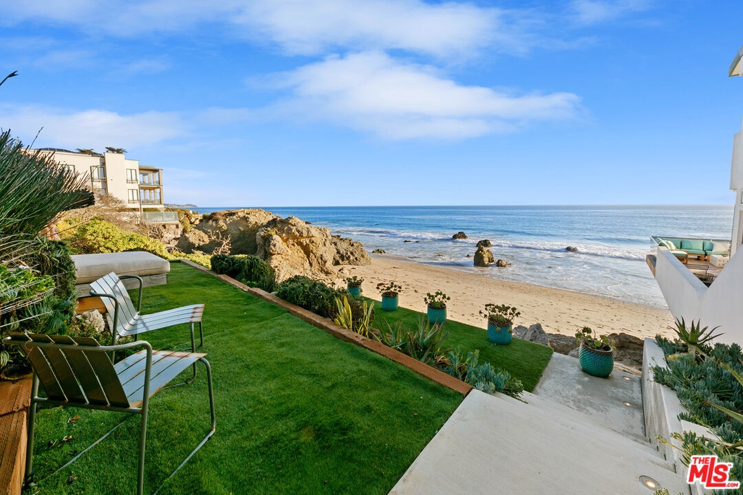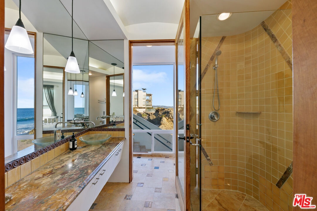 Welcome to this uniquely located seaside escape, a warmly crafted architectural residence situated in a private, gated enclave in the highly coveted Broad Beach neighborhood. This oceanfront retreat captures mesmerizing ocean views from nearly every room. Nestled on two premier beachfront parcels, the property features an impressive 60 feet of pristine ocean front. This custom home was designed 25 years ago by the esteemed Barsocchini & Associates for the current owner. This unique Malibu gem is currently being offered for long term lease. Located in the prestigious Sea Level Drive enclave, the home enjoys exceptional privacy and unobstructed views of dramatic rock formations and twinkling city lights, thanks to its prime position between two development-restricted lots. Architectural highlights include a distinctive Wave Motif copper-clad roof, artisanal art glass windows, bespoke iron railings, and inviting stone bathrooms. The welcoming interiors are characterized by soaring ceilings, expansive picture windows that bathe the rooms in natural light, and charming finishes, creating a harmonious blend of comfort and style. The bright living and dining areas on the main floor open onto a spacious wraparound deck, ideal for al fresco dining, barbecues, and relaxation by the sea. The gourmet kitchen, with its vaulted ceiling, custom cabinetry, bar seating, breakfast nook is a chef's delight. A stairway from the kitchen leads to an outdoor shower and the sandy beach. The main level also includes a bedroom and a full bath, while the lower level features a vast media/recreation room with a fireplace, laundry room, and bath. The upper floor houses three en-suite bedrooms, including the breathtaking ocean-view primary suite. This retreat features two walk-in closets, extensive built-ins, an oceanfront balcony, a spa-inspired bathroom with ocean views. Situated down the hallway lies a stylish library lounge, ideal for zoom calls, reading and relaxing. The adjacent lot provides a terraced outdoor sanctuary for entertaining and soaking in the sound of the breaking surf. The striking rock formations to the east are a source of constant visual delight. A surfer's hideaway for locals is a paddle away. The property includes a two-car garage and additional parking for four vehicles in the driveway. With its superbly executed design and one of a kind beachfront location, this residence invites you, your family and friends to indulge and enjoy the luxury of the Malibu beach lifestyle.