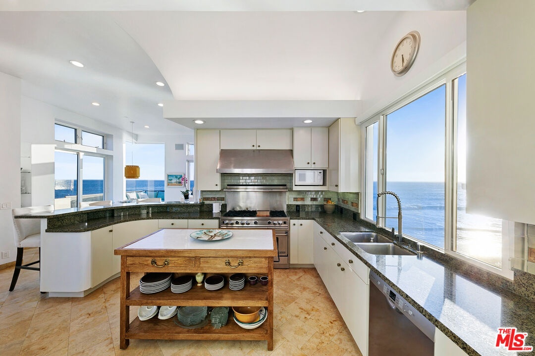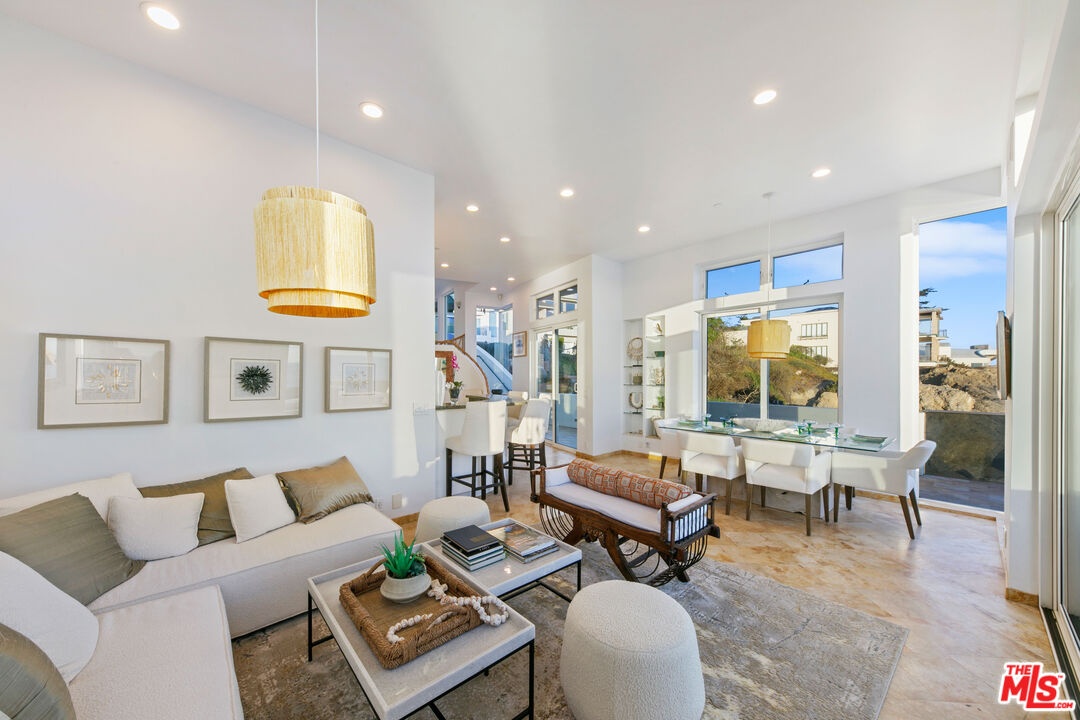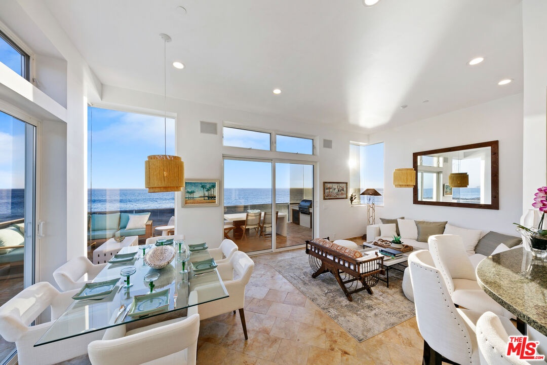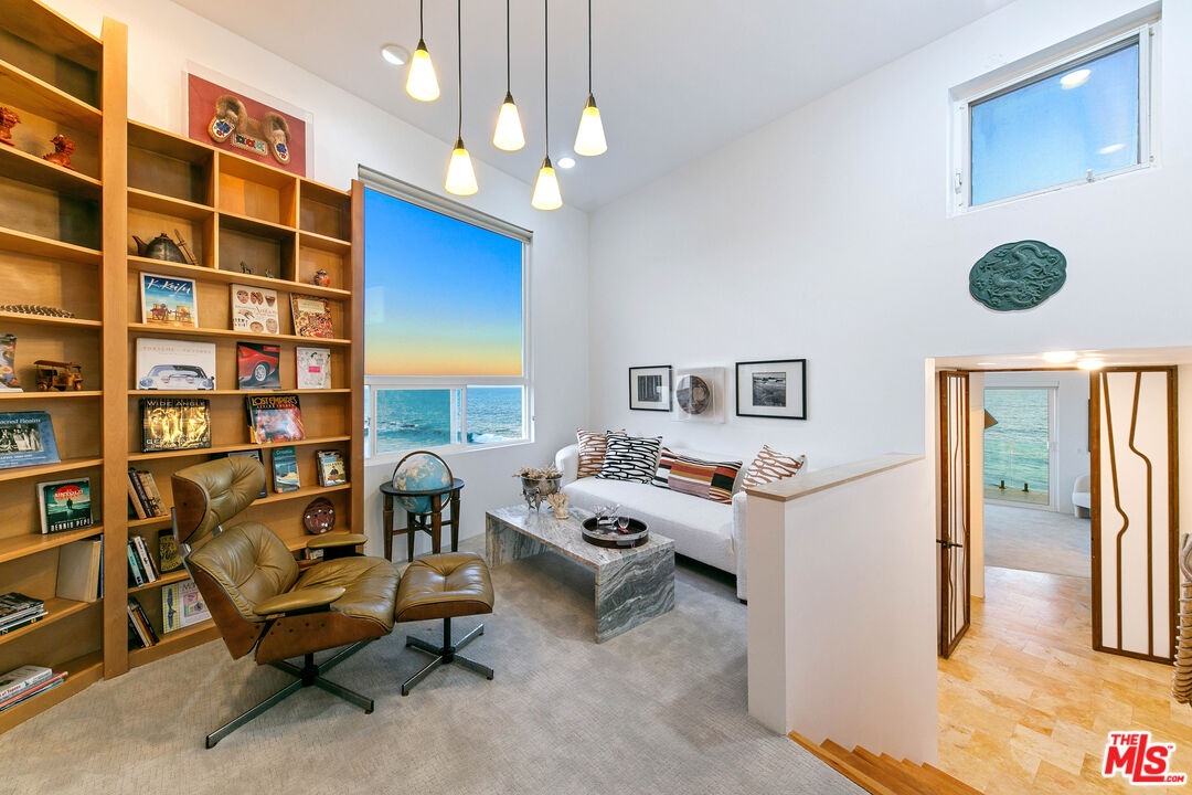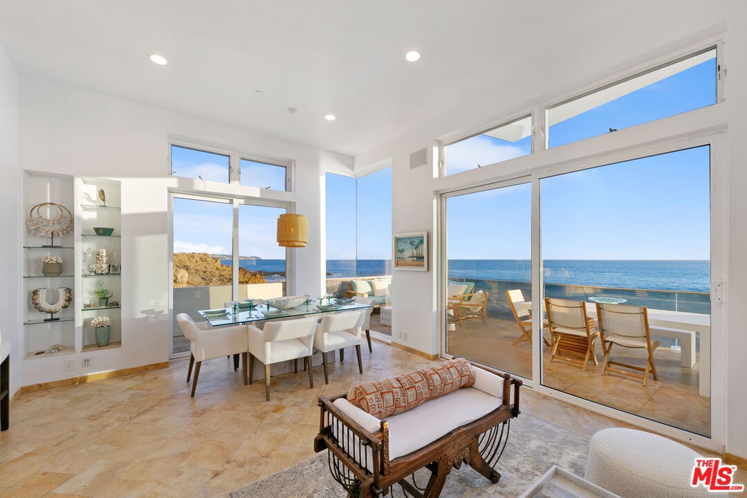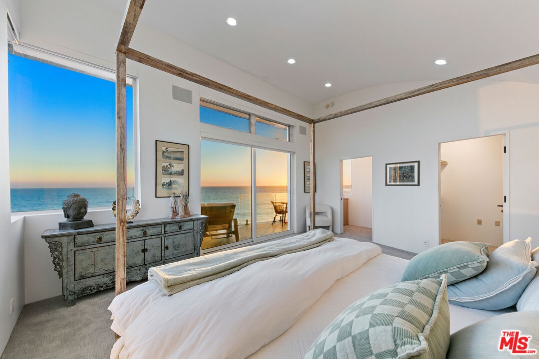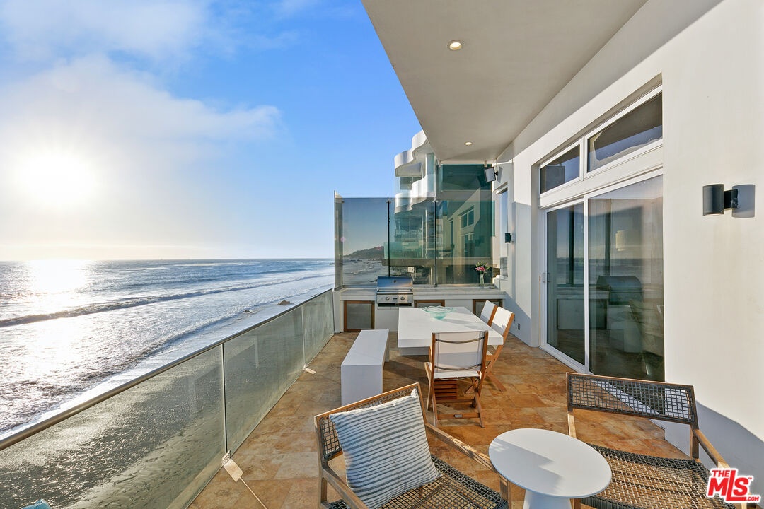 Welcome to this uniquely located seaside escape, a warmly crafted architectural residence situated in a private, gated enclave in the highly coveted Broad Beach neighborhood. This oceanfront retreat captures mesmerizing ocean views from nearly every room. Nestled on two premier beachfront parcels, the property features an impressive 60 feet of pristine ocean front. This custom home was designed 25 years ago by the esteemed Barsocchini & Associates for the current owner. This unique Malibu gem is currently being offered for long term lease. Located in the prestigious Sea Level Drive enclave, the home enjoys exceptional privacy and unobstructed views of dramatic rock formations and twinkling city lights, thanks to its prime position between two development-restricted lots. Architectural highlights include a distinctive Wave Motif copper-clad roof, artisanal art glass windows, bespoke iron railings, and inviting stone bathrooms. The welcoming interiors are characterized by soaring ceilings, expansive picture windows that bathe the rooms in natural light, and charming finishes, creating a harmonious blend of comfort and style. The bright living and dining areas on the main floor open onto a spacious wraparound deck, ideal for al fresco dining, barbecues, and relaxation by the sea. The gourmet kitchen, with its vaulted ceiling, custom cabinetry, bar seating, breakfast nook is a chef's delight. A stairway from the kitchen leads to an outdoor shower and the sandy beach. The main level also includes a bedroom and a full bath, while the lower level features a vast media/recreation room with a fireplace, laundry room, and bath. The upper floor houses three en-suite bedrooms, including the breathtaking ocean-view primary suite. This retreat features two walk-in closets, extensive built-ins, an oceanfront balcony, a spa-inspired bathroom with ocean views. Situated down the hallway lies a stylish library lounge, ideal for zoom calls, reading and relaxing. The adjacent lot provides a terraced outdoor sanctuary for entertaining and soaking in the sound of the breaking surf. The striking rock formations to the east are a source of constant visual delight. A surfer's hideaway for locals is a paddle away. The property includes a two-car garage and additional parking for four vehicles in the driveway. With its superbly executed design and one of a kind beachfront location, this residence invites you, your family and friends to indulge and enjoy the luxury of the Malibu beach lifestyle.