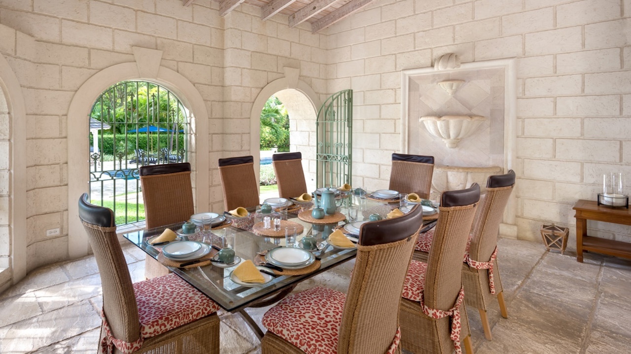 This incredible home is designed for elevated island living and effortless entertaining. The spacious outdoor areas invite relaxation beside the sparkling swimming pool, while the shaded gazebo offers an ideal setting for al fresco dining with friends and family. The patio overlooking the gardens offers a peaceful setting for outdoor relaxation.