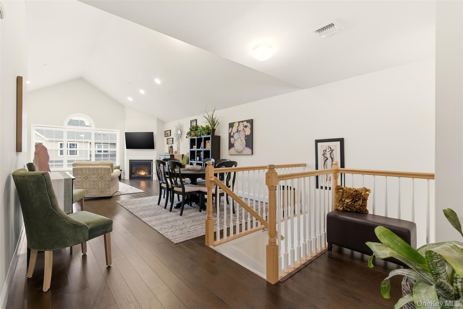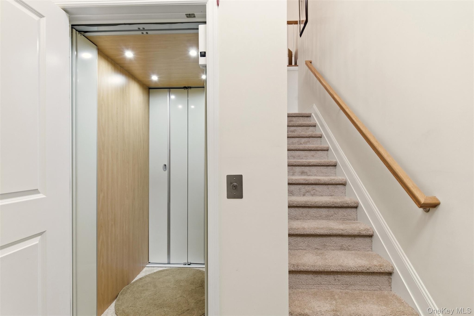 The home features a private first-floor foyer with stair and in-unit elevator access to the main living level. The open living and dining areas include hardwood flooring, vaulted ceilings, recessed lighting, and a gas fireplace with remote.