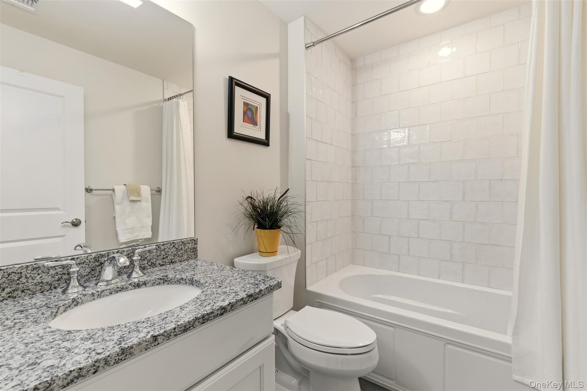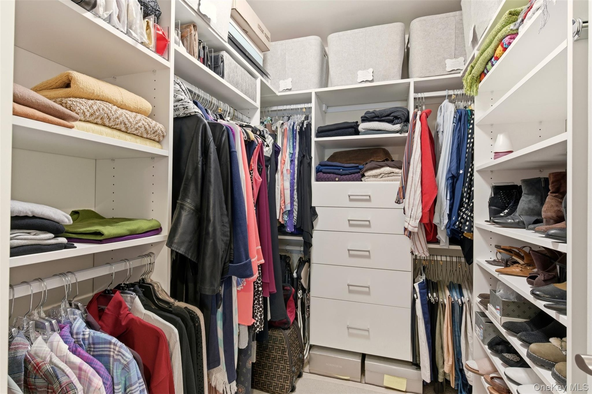The primary suite includes a custom-organized oversized closet and an en suite bath with double vanity, separate shower, and soaking tub. A second bedroom, full bath, and dedicated laundry room with washer and dryer complete the layout.