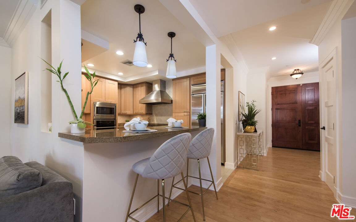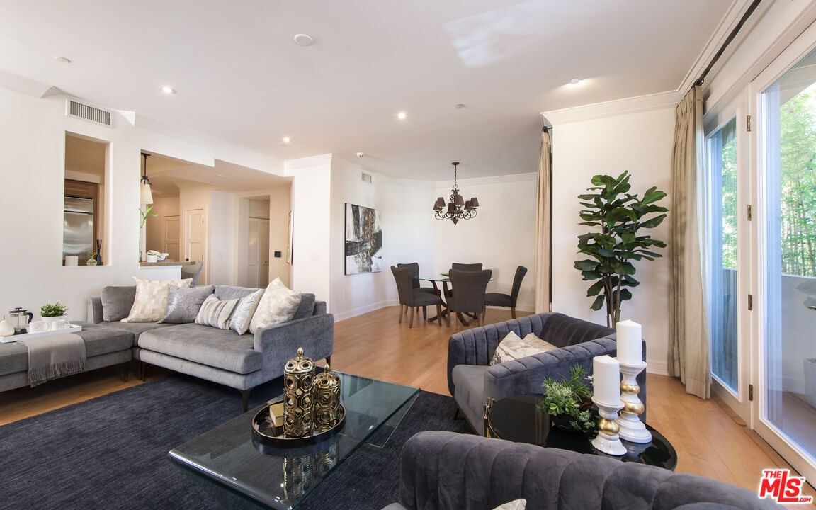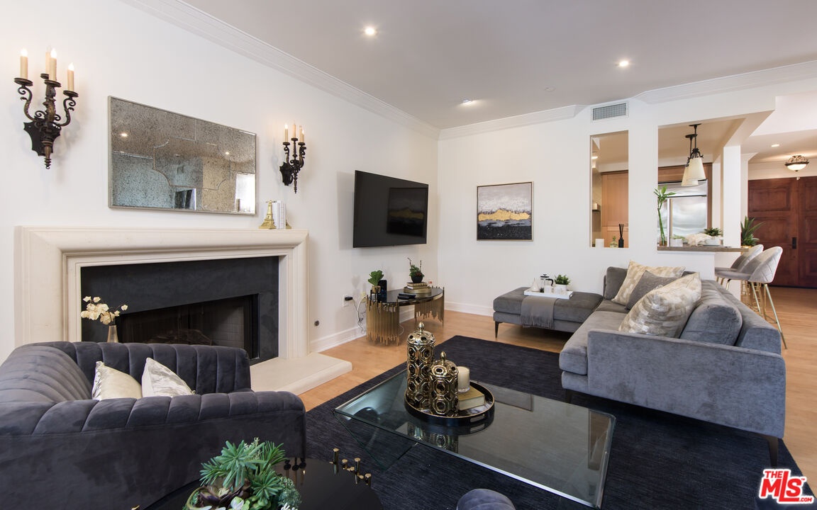 This luxurious single-level condo is located in a prestigious full-service Beverly Hills building offering 24/7 doorman, concierge, and security services. Nestled on a picturesque tree-lined street, the residence is just moments from Bristol Farms, Robertson, Melrose, and West Hollywood's premier shopping and dining. The spacious 2-bedroom, 2.5-bathroom unit spans over 1,600 square feet and features a sleek modern kitchen, hardwood floors, designer lighting, two fireplaces, and stylishly bathrooms. Additional highlights include an in-unit washer and dryer, tasteful updates throughout, and an ideal layout for both everyday living and effortless entertainingall within one of the most sought-after full-service communities in Beverly Hills.