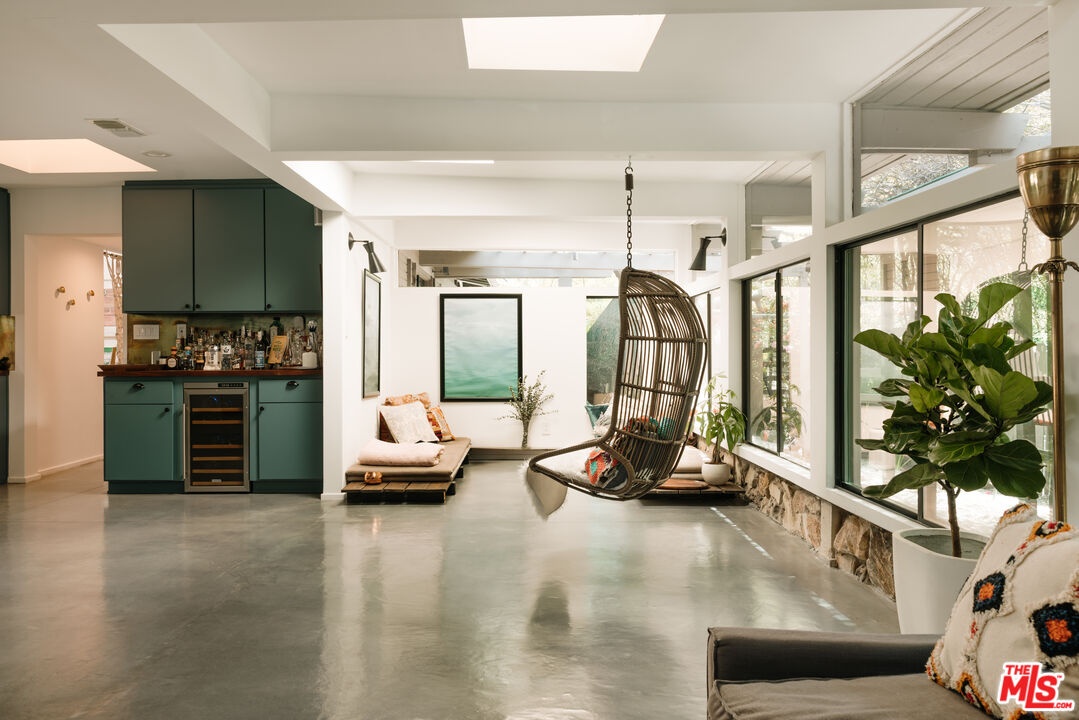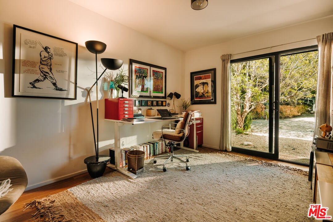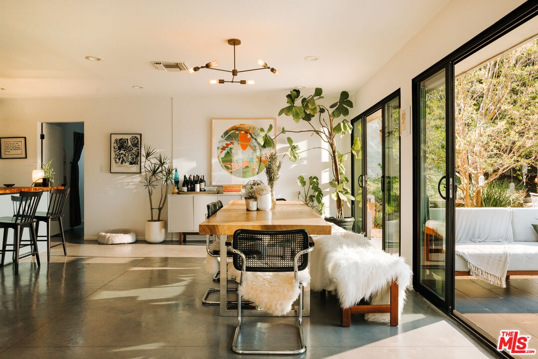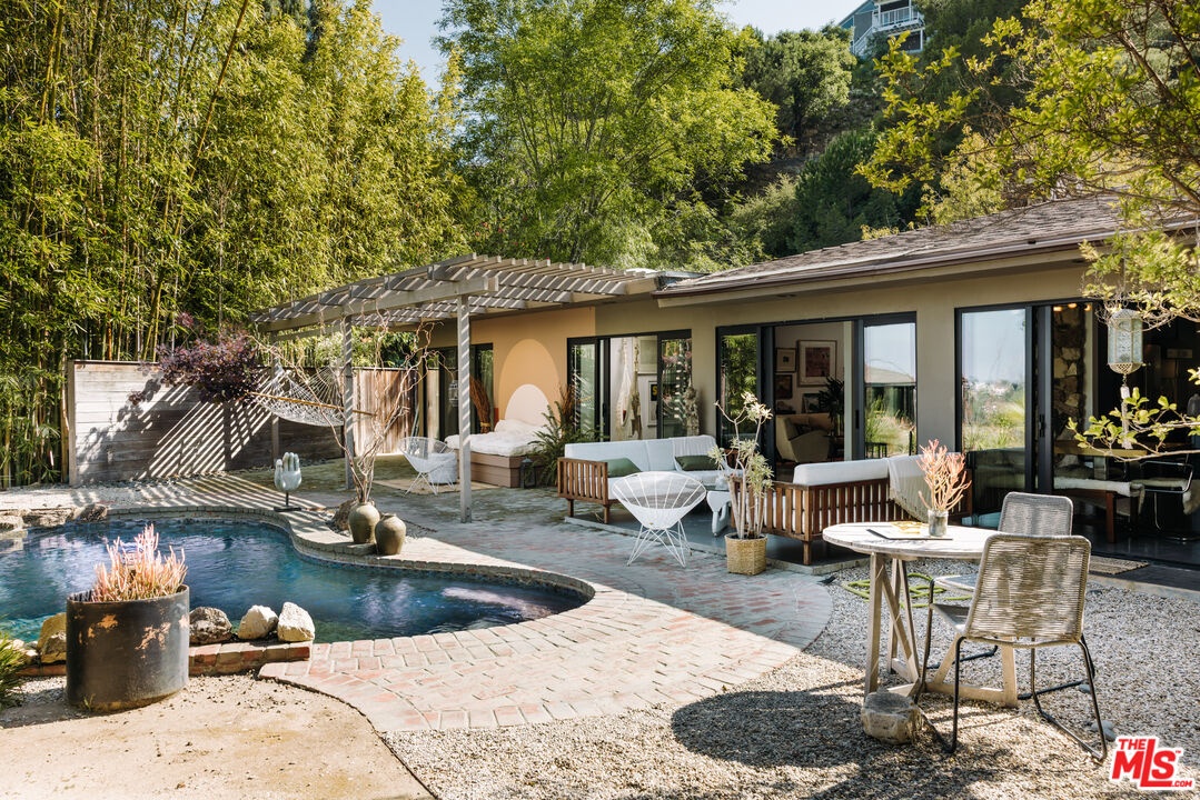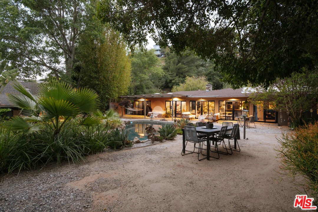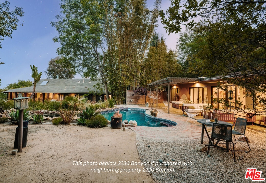 This listing features 2230 Banyan Dr as a standalone offering. It may also be purchased in conjunction with the adjacent residence at 2220 Banyan Dr, which is listed on the market for an additional $6,195,000 which allows the owner to combine the properties to create one large, special compound with two separate structures. 2230 Banyan Dr is a midcentury-inspired retreat spans 2,821 square feet with 3 bedrooms and 2.5 bathrooms, thoughtfully situated on a generous 9,352 square foot lot. As you enter the courtyard, you're greeted by a rare baobab tree, setting a unique and calm tone for rest of the home. Designed to evoke warmth and tranquility, the structure centers around a dramatic stone fireplace that anchors the open-concept living space, truly balancing elegance with comfort as soon as you enter the home. The custom kitchen flows effortlessly into the dining room and other living spaces, while an entire eastern wall of glass sliding doors welcomes in the morning light that extends out to the patio and pool. The north wing features two delightful bedrooms, a full bath, and a laundry area; ideal for guests, children, or a quiet work-from-home zone. Tucked away in its own private wing, the primary suite opens to a secluded courtyard that feels like a personal wellness retreat. Additional sliding doors lead directly from the suite to the backyard pool, blending indoor serenity with outdoor ease. Warm hardwood floors, thoughtful sightlines, and a true sense of privacy elevate the experience throughout. Outside, a sunlit backyard invites you to unwind with a sparkling pool, shaded lounge areas, and mature landscaping that completes the tranquil atmosphere. Sophisticated, soulful, and serene, 2230 Banyan is a timeless offering.
