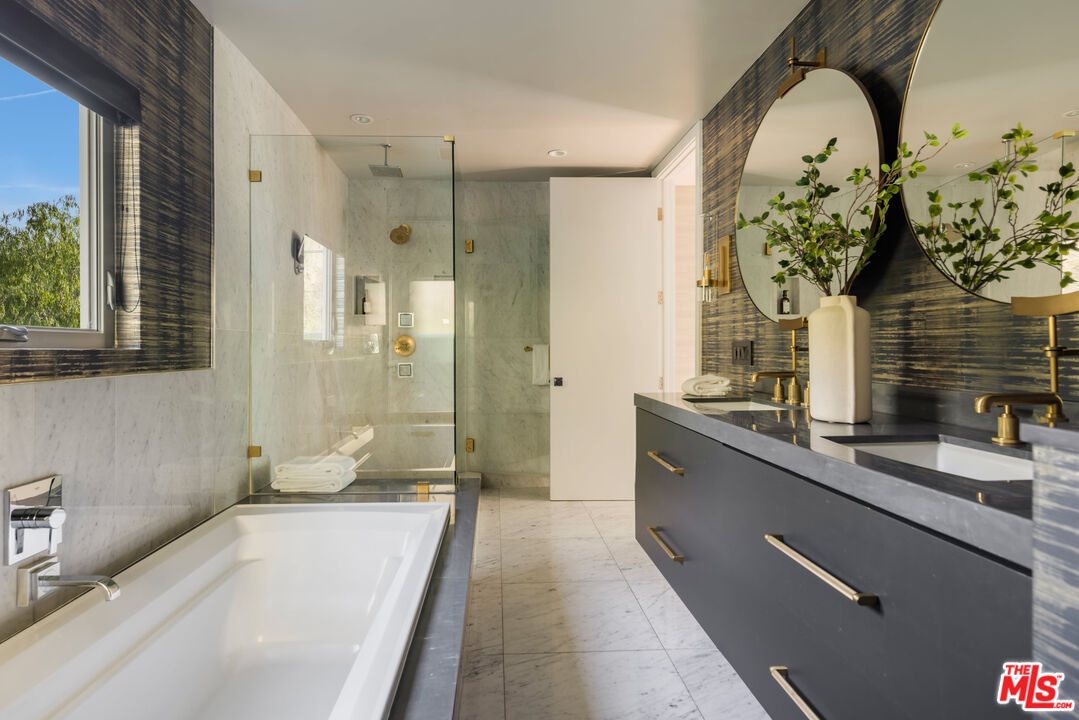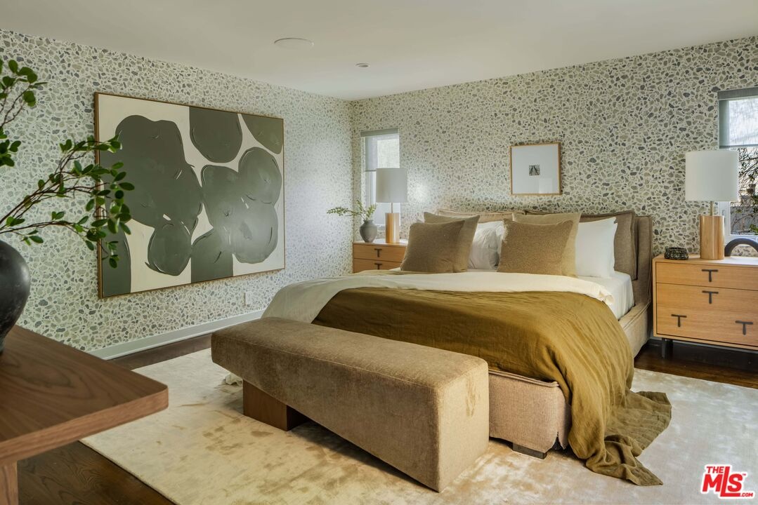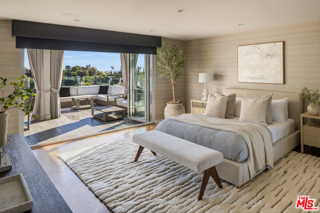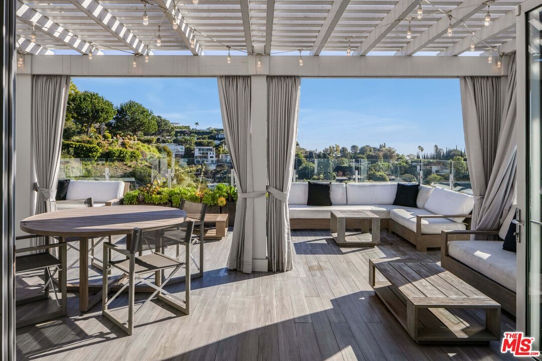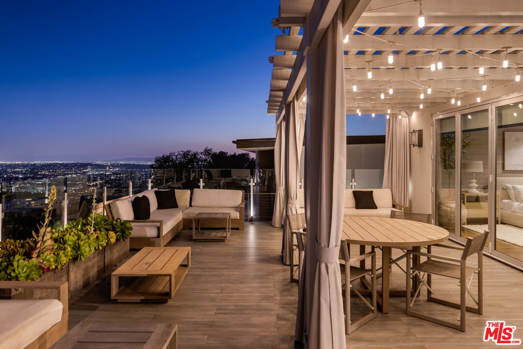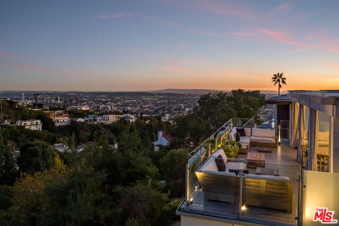 Set above the Sunset Strip in the legendary Bird Streets, this modern hillside retreat commands jetliner panoramas stretching from Downtown Los Angeles to the Pacific, offering a rare sense of calm and seclusion just moments from the city. Positioned across multiple levels and thoughtfully designed for privacy, the residence unfolds through expansive walls of floor-to-ceiling glass that bathe the interiors in natural light while framing uninterrupted views at every turn. Custom wall treatments and bespoke upgrades create intentional spaces designed for both everyday living and entertaining.The kitchen is both a functional centerpiece and a gathering place, appointed with custom millwork, professional-grade appliances, and a substantial center island that anchors the main level. Adjacent living spaces extend naturally to outdoor terraces, while an upper-level family room opens directly to additional patios, allowing the home to unfold outdoors.The primary suite is positioned as a private escape, with direct access to an expansive terrace arranged for open-air dining and quiet relaxation against a sweeping city backdrop. Within, a generous walk-in closet with safe and a finely finished bath - featuring dual vanities, a soaking tub, and marble shower - complete the suite. Guest accommodations throughout the residence maintain the same level of consideration, offering privacy and comfort in equal measure. Above it all, a rooftop retreat, bordered by mature hedging, introduces a rare vantage point with an additional putting green and jacuzzi, suspended high above the lights below.