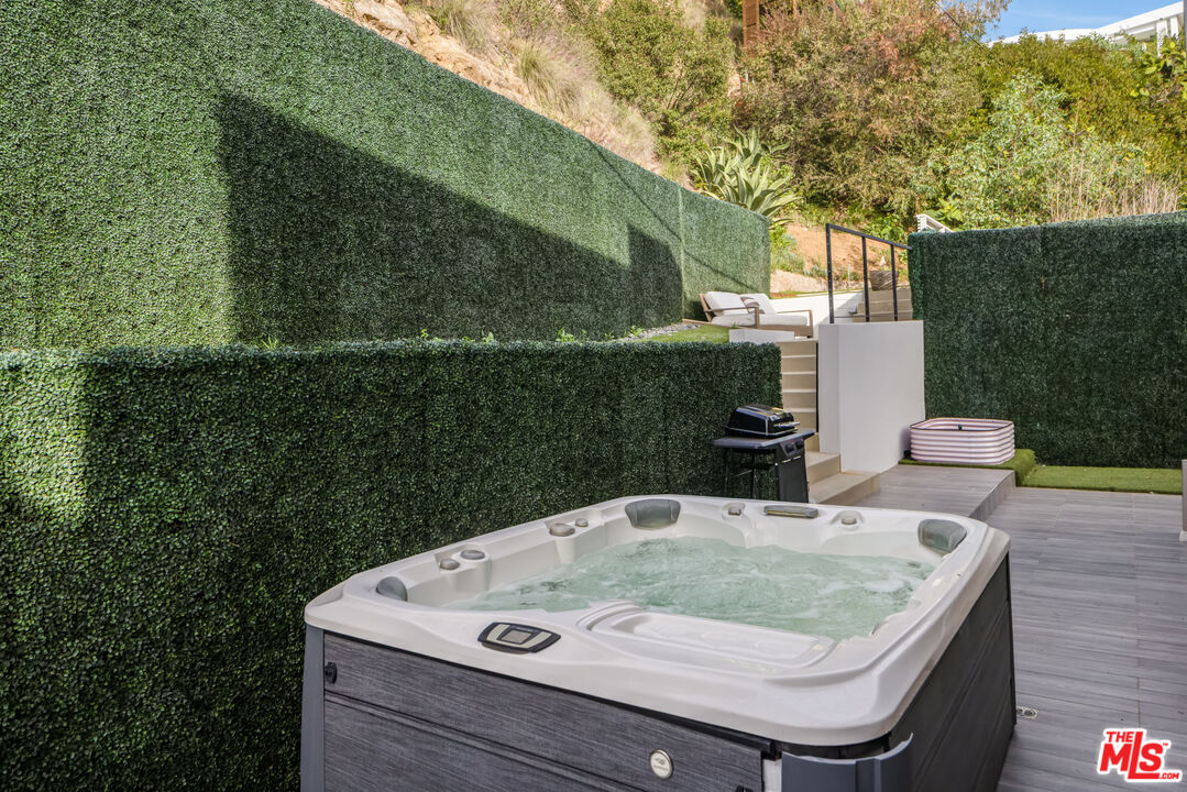 Set above the Sunset Strip in the legendary Bird Streets, this modern hillside retreat commands jetliner panoramas stretching from Downtown Los Angeles to the Pacific, offering a rare sense of calm and seclusion just moments from the city. Positioned across multiple levels and thoughtfully designed for privacy, the residence unfolds through expansive walls of floor-to-ceiling glass that bathe the interiors in natural light while framing uninterrupted views at every turn. Custom wall treatments and bespoke upgrades create intentional spaces designed for both everyday living and entertaining.The kitchen is both a functional centerpiece and a gathering place, appointed with custom millwork, professional-grade appliances, and a substantial center island that anchors the main level. Adjacent living spaces extend naturally to outdoor terraces, while an upper-level family room opens directly to additional patios, allowing the home to unfold outdoors.The primary suite is positioned as a private escape, with direct access to an expansive terrace arranged for open-air dining and quiet relaxation against a sweeping city backdrop. Within, a generous walk-in closet with safe and a finely finished bath - featuring dual vanities, a soaking tub, and marble shower - complete the suite. Guest accommodations throughout the residence maintain the same level of consideration, offering privacy and comfort in equal measure. Above it all, a rooftop retreat, bordered by mature hedging, introduces a rare vantage point with an additional putting green and jacuzzi, suspended high above the lights below.