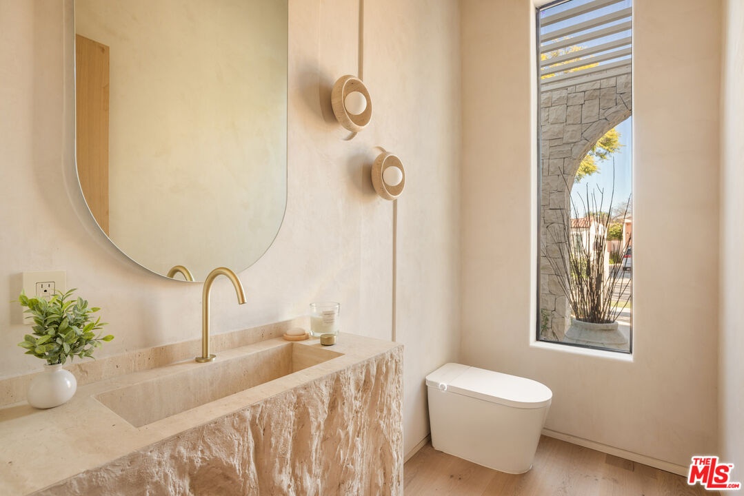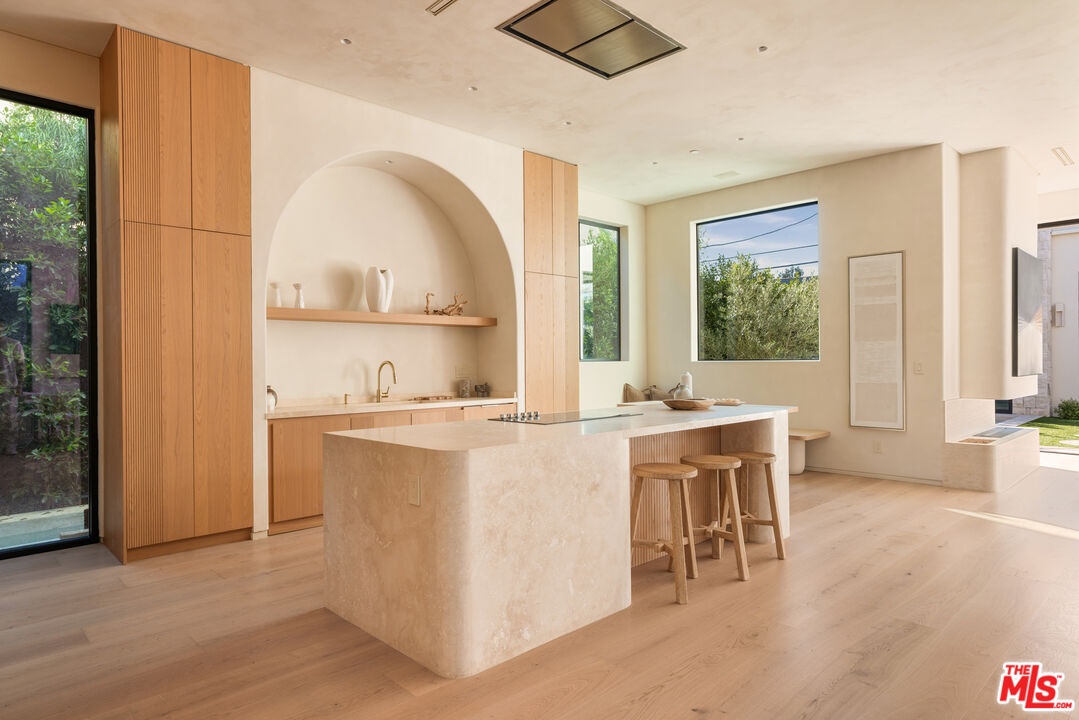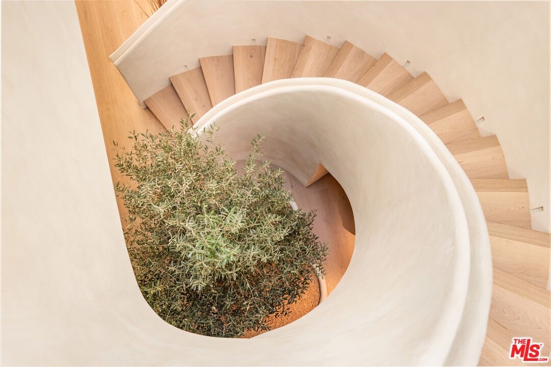Located in one of LA's most sought-after enclaves, this Mediterranean-inspired residence exemplifies modern craftsmanship and elevated living. Upon entry, asculptural spiral staircasegracefully wraps around a mature olive tree, rising beneath a dramatic skylight that fills the foyer with natural light and sets a striking architectural tone. Inside, travertine finishes, plastered walls and contemporary curves create a seamless flow of texture and form throughout. Expansive, wall-to-ceiling sliding glass doors dissolve the boundary between the living spaces and the manicured backyard, flooding the interiors with natural light and enhancing effortless indoor-outdoor living. The chef's kitchen anchors the home with refined materials and meticulous detailing, ideal for both everyday living and hosting. Outside, the backyard unfolds as a private resort-style retreat, featuring a pool and spa, built-in BBQ and lush landscaping designed for year-round enjoyment, while a detached ADU provides flexibility for guests, work or extended living. Upstairs, the primary suite serves as a serene sanctuary with two expansive walk-in closets and a spa-like bathroom complete with a soaking tub. Two additional bedrooms occupy the second level, offering comfort, privacy and thoughtful separation. Complete with a two-car garage and exceptional attention to detail throughout, this smart home delivers a rare blend of architecture, function and lifestyle, quietly positioned near boutique shopping and acclaimed fine dining in one of Los Angeles' most coveted neighborhoods.