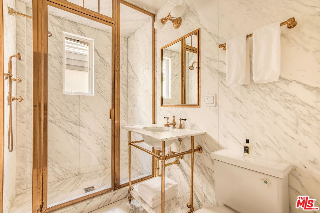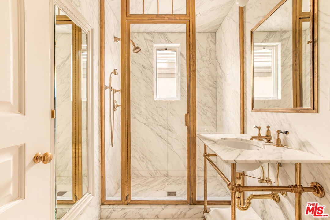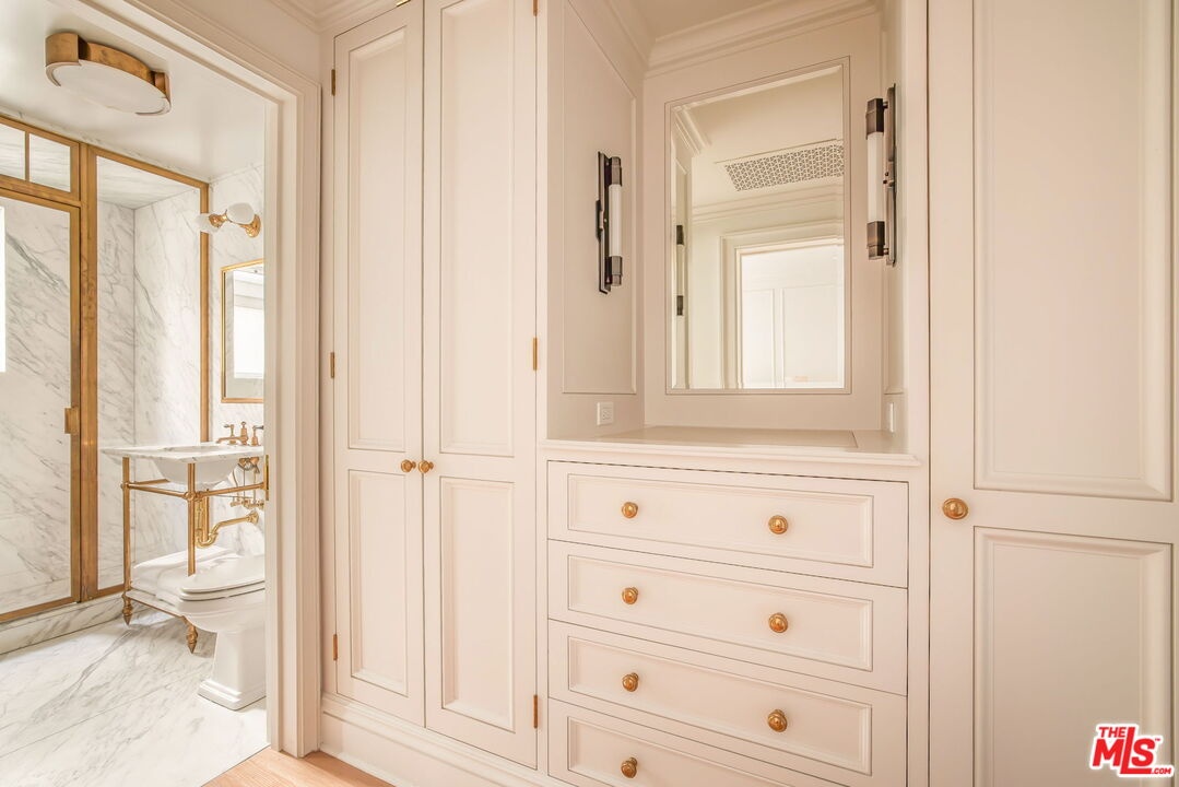 Presenting the most exquisitely designed, thoughtfully renovated residence in West Hollywood's full-service Granville Towers. This magnificently renovated fourth-floor home spans 1,177 square feet with one bedroom and one and a half bathrooms, and enjoys three exposures that fill the home with natural light throughout the day. No expense was spared in its transformation, from custom arches, molding, and paneling to a chef's kitchen with bespoke cabinetry and marble countertops, and a marble bathroom with custom brass shower enclosures and fixtures. The powder room is adorned with hand-painted de Gournay wallpaper, while abundant closet space, Bertazzoni appliances, and an in-unit stacked washer and dryer complete this extraordinary space. The top-to-bottom renovation includes new white oak flooring, plumbing fixtures by Catchpole & Rye, and Forbes & Lomax light switches. Lighting fixtures by Jamb London, Collier Webb, Kelly Wearstler, and Urban Archaeology are featured, as well as designer floor tile from Exquisite Surfaces. Custom linen treatments enhance every window. The Granville Towers is a historic French Normandy style condominium building in the heart of West Hollywood, originally built in 1930. Known for its dramatic turrets, lush gardens, and Old Hollywood charm, it has long attracted celebrities and creatives seeking privacy with character. Combining classic architecture with modern amenities, it remains one of the area's most iconic and prestigious residential addresses. Residents of The Granville enjoy gated underground parking, a secure gated entrance, and the services of a doorman, offering both safety and convenience. Perfectly situated, the building is close to West Hollywood's acclaimed restaurants, supermarkets, and vibrant nightlife.