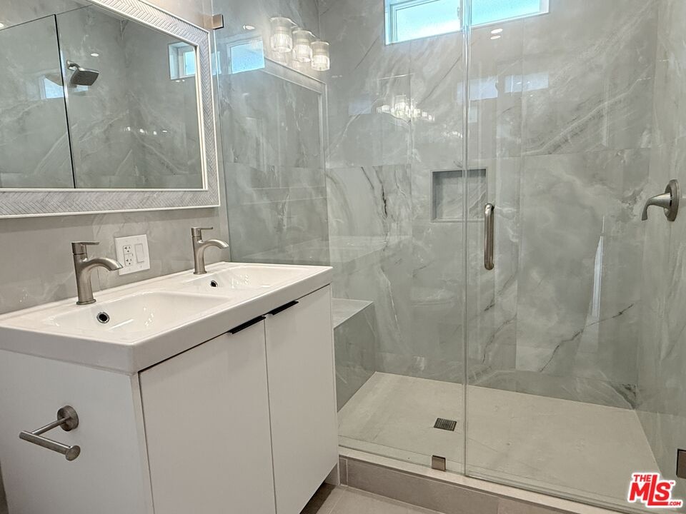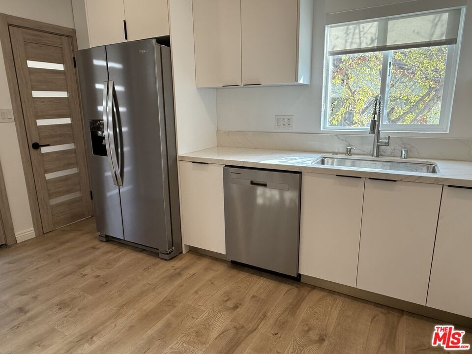 This is the first time in years (if ever) that this beautifully re-imagined 2-bedroom, 1.5-bath residence has been available for lease. A rare, free-standing single-family home within a small triplex, it is ideally located on a quiet, tree-lined residential street while remaining moments from the shops, dining, and nightlife along Santa Monica Boulevard that define West Hollywood living. The home has recently undergone a thoughtful and extensive renovation, creating a bright, cheerful, and inviting living environment. Wide-plank wood flooring and recessed lighting flow throughout, complementing a clean, neutral palette that enhances both volume and continuity. Public spaces are organized within a spacious great room featuring distinct living and dining areas, a generous wall ideal for art or media, and a bank of windows that fills the space with natural light. The newly remodeled kitchen is both stylish and highly functional, showcasing brand-new stainless steel appliances, quartz-style countertops, and abundant cabinetry and storage. A convenient guest bath completes the main living area. Both bedrooms are well-proportioned and charming, offering good closet space, with laundry thoughtfully located just outside their doors. The primary bedroom opens to a sunny rear patio, while the front bedroom overlooks an expansive, gated parking area secured by newly installed metal fencing and gates. Mature specimen trees and lush greenery further enhance the property's sense of privacy. The primary and guest bathrooms have been beautifully remodeled with coordinated finishes and modern fixtures, completing this turnkey offering that blends comfort, style, and location.