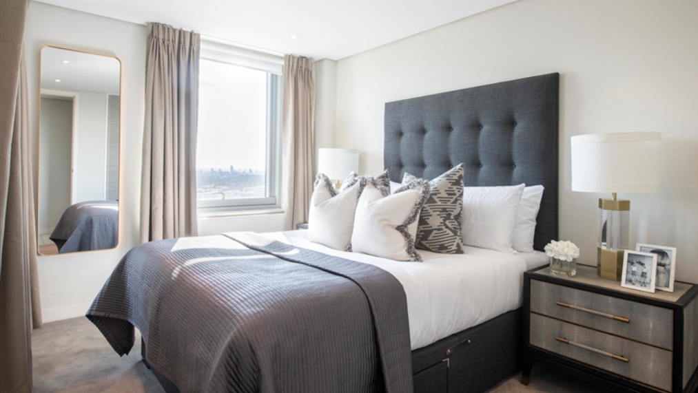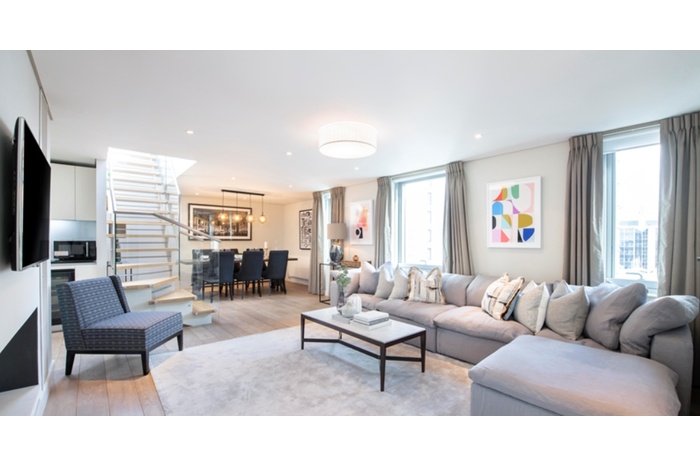 The apartment offers expansive living and entertaining accommodation, featuring a beautiful reception room and a large private terrace providing breathtaking views across London. Further benefits include two reading balconies, a superb modern fitted open-plan kitchen, four bedrooms, three bathrooms, generous storage space, and flexible furnishing options.