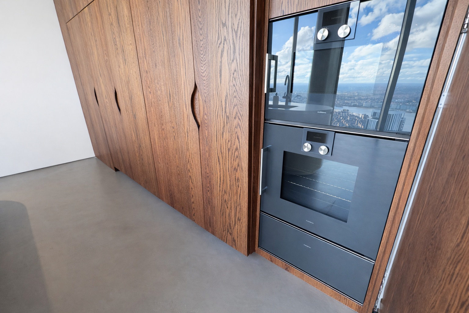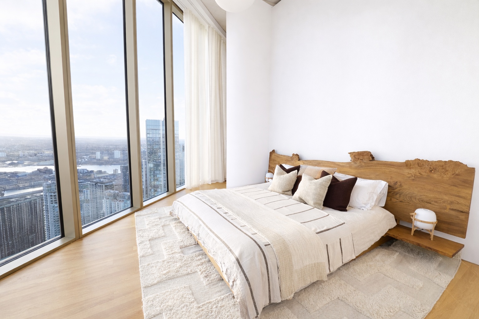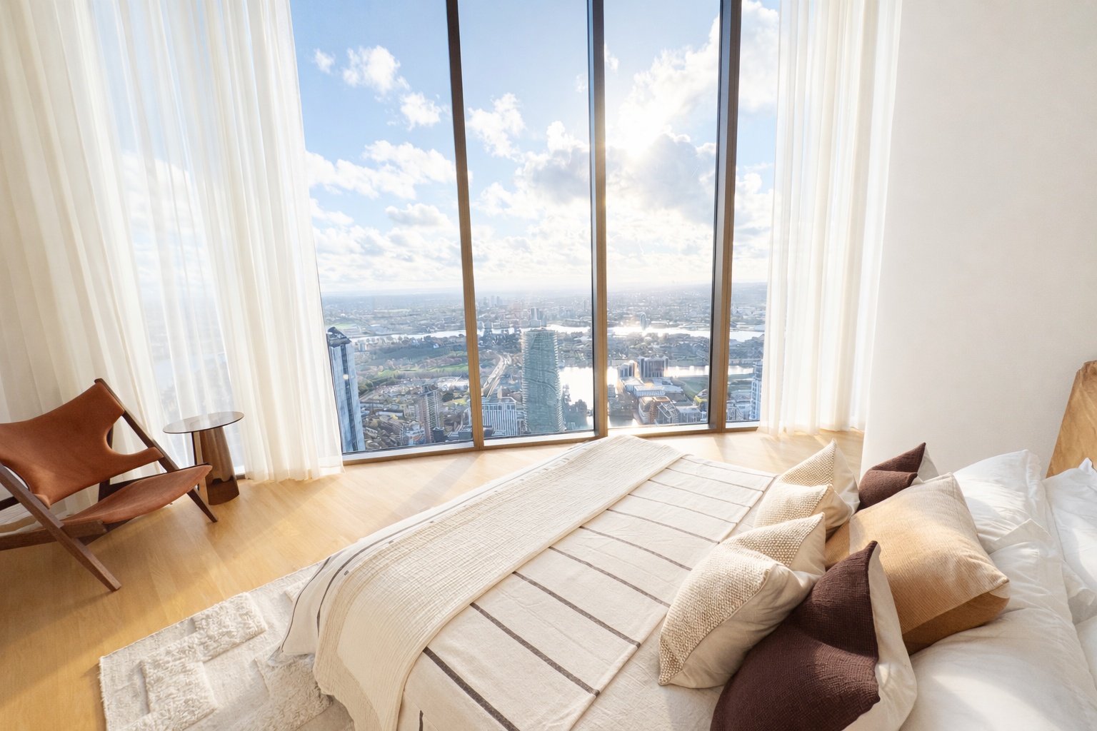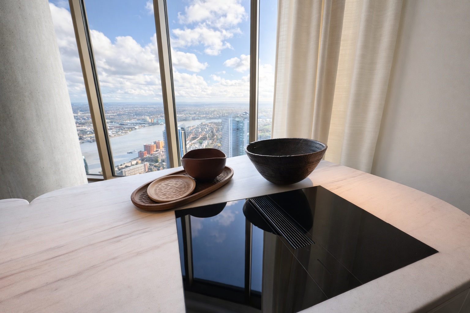 From its elevated position, the apartment enjoys panoramic views across Canary Wharf’s skyline, the River Thames, and stretching across South-East London, delivering dramatic day-to-night vistas.