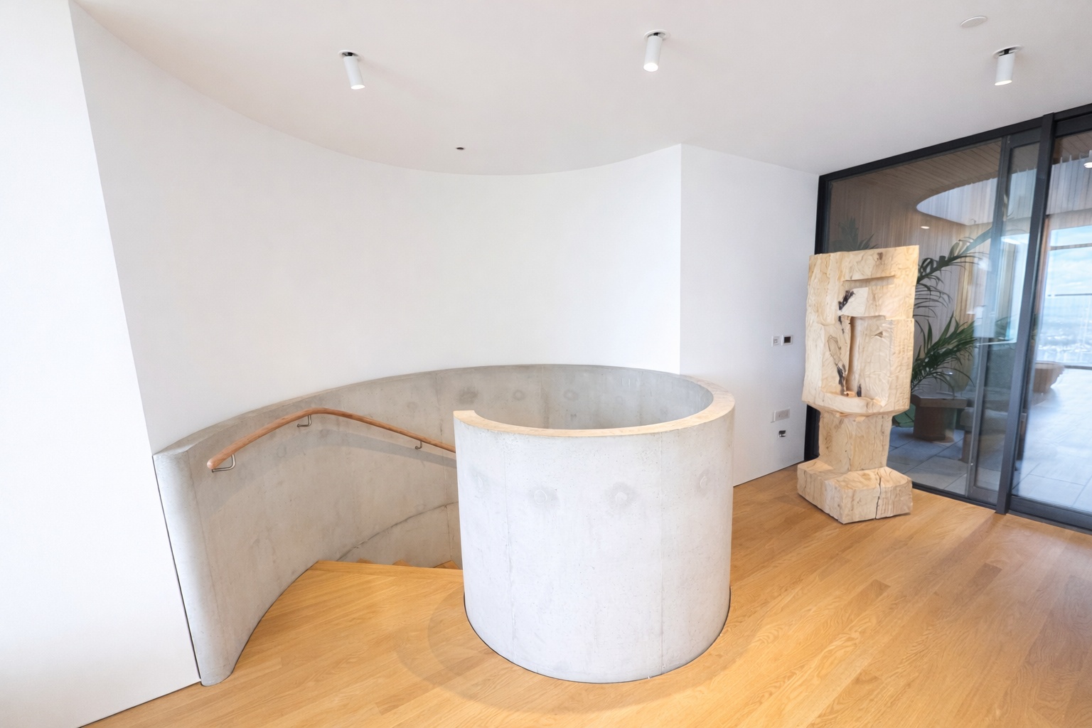 Arranged over two thoughtfully designed floors, the apartment showcases a refined blend of contemporary architecture and Nordic-inspired interior design. Soft curved lines, natural textures, and a muted colour palette create a calm, elegant atmosphere throughout, while expansive floor-to-ceiling glazing floods the space with natural light and frames the spectacular views.