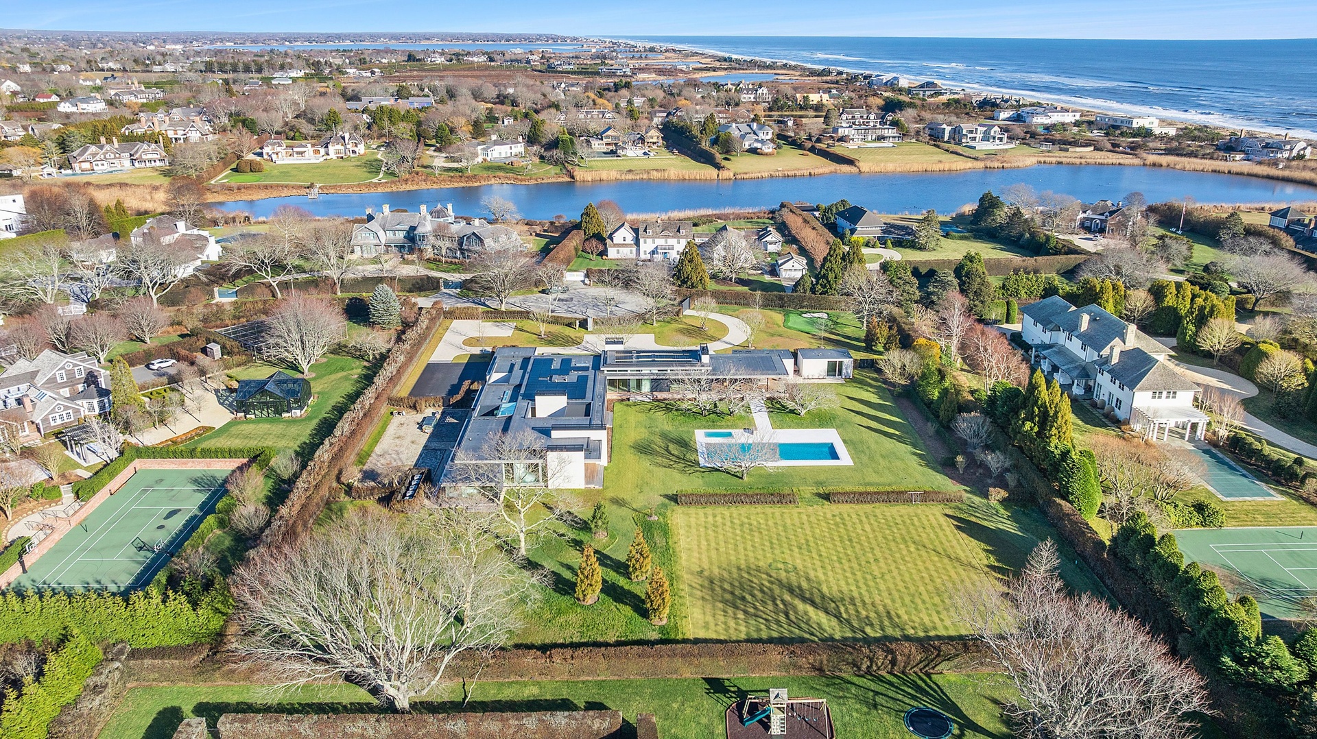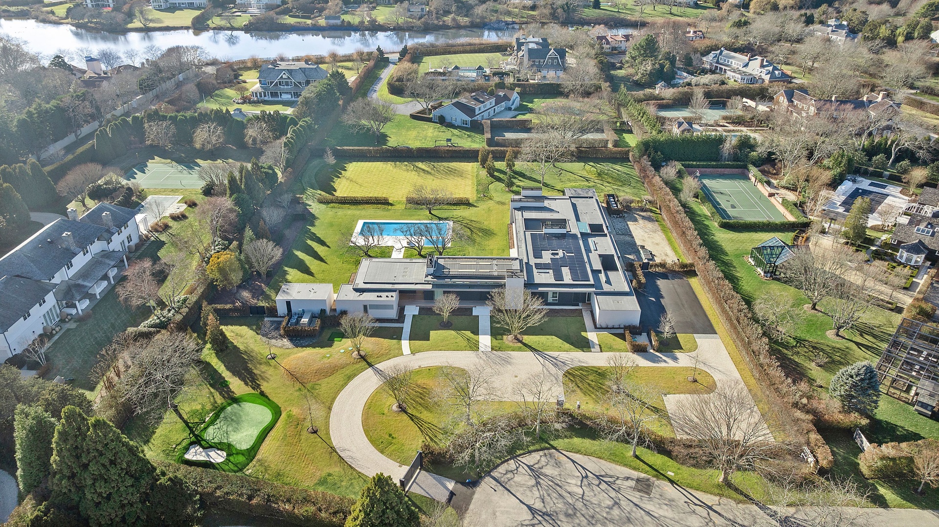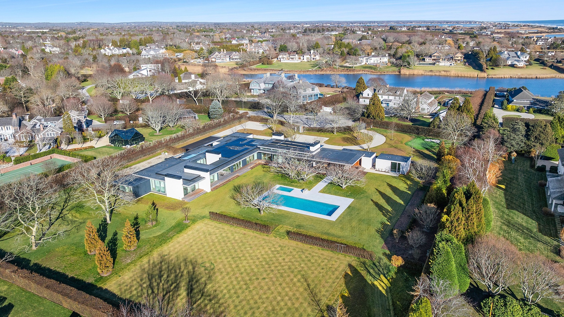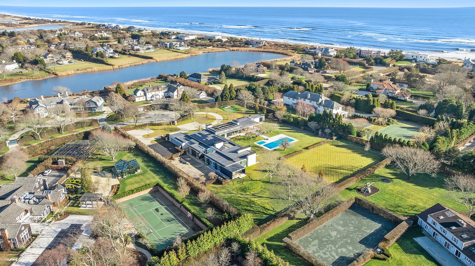 Tucked along one of Southampton Village’s most coveted lanes and just moments from the ocean, 156 Duck Pond Laneis a brand-new modern estate that redefines luxury coastal living. Set behind gates on a beautifully landscaped parcel, the residence unfolds as a private retreat where architecture, light, and lifestyle converge. Clean modern lines are softened by warm natural materials and walls of glass, allowing sunlight to pour into every corner of the home while seamlessly connecting the interiors to the expansive grounds.