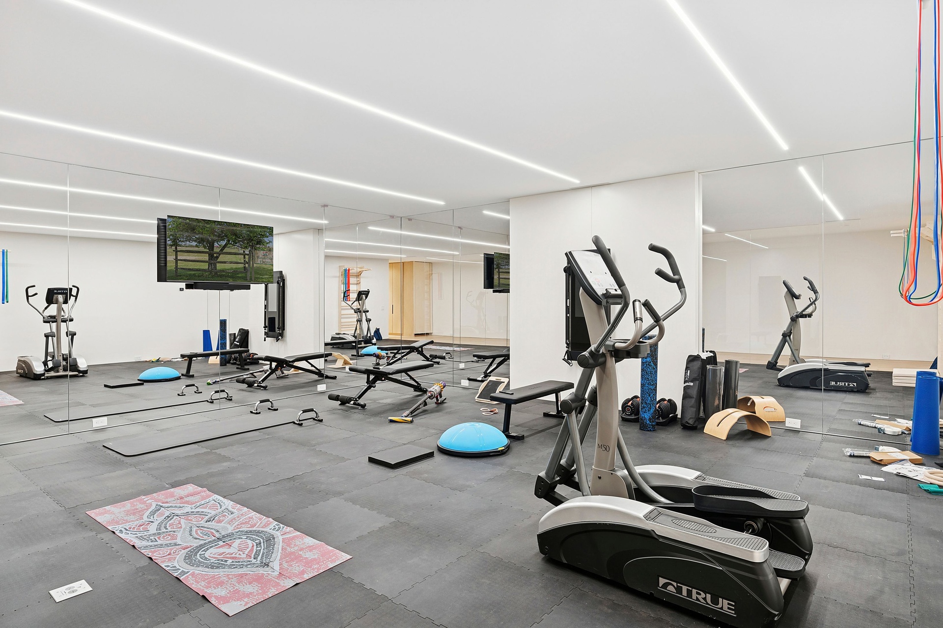 The lifestyle amenities rival those of a private resort. Indoors, enjoy a golf simulator, media room, game room, gym, and sauna, along with five fireplaces—three wood-burning and two gas—that add warmth and ambiance throughout the seasons. The primary suite is a true sanctuary, complete with a luxurious bath featuring a steam shower and serene views of the grounds. Two laundry rooms, one on each level, add ease and functionality to daily living.