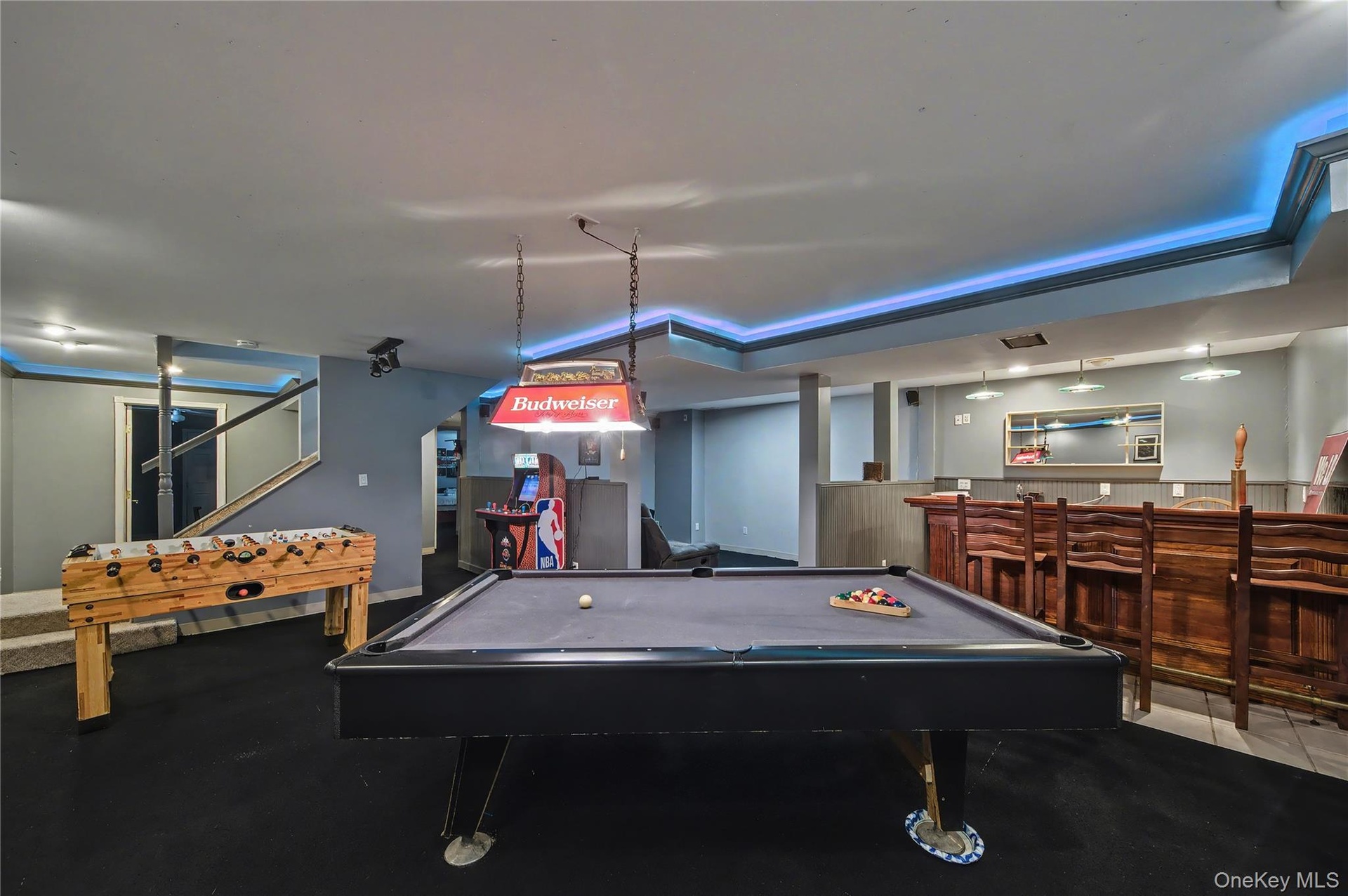 The finished lower level continues the lifestyle experience with a stylish bar, pool table, gym with equipment, a private home office with a full bath, and a true theater room featuring surround sound — your own in-home cinema escape.
