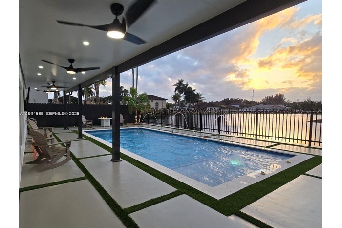 Beautifully updated 4-bedroom, 3-bath modern residence offering porcelain flooring, soaring ceilings, and an expansive open-concept kitchen with high-end finishes. Features include a two-car garage with EV charging, covered terrace, contemporary pool with LED lighting, and serene waterfront views. Move-in ready with outstanding curb appeal, located in a secure, non-HOA community. A truly exceptional opportunity.