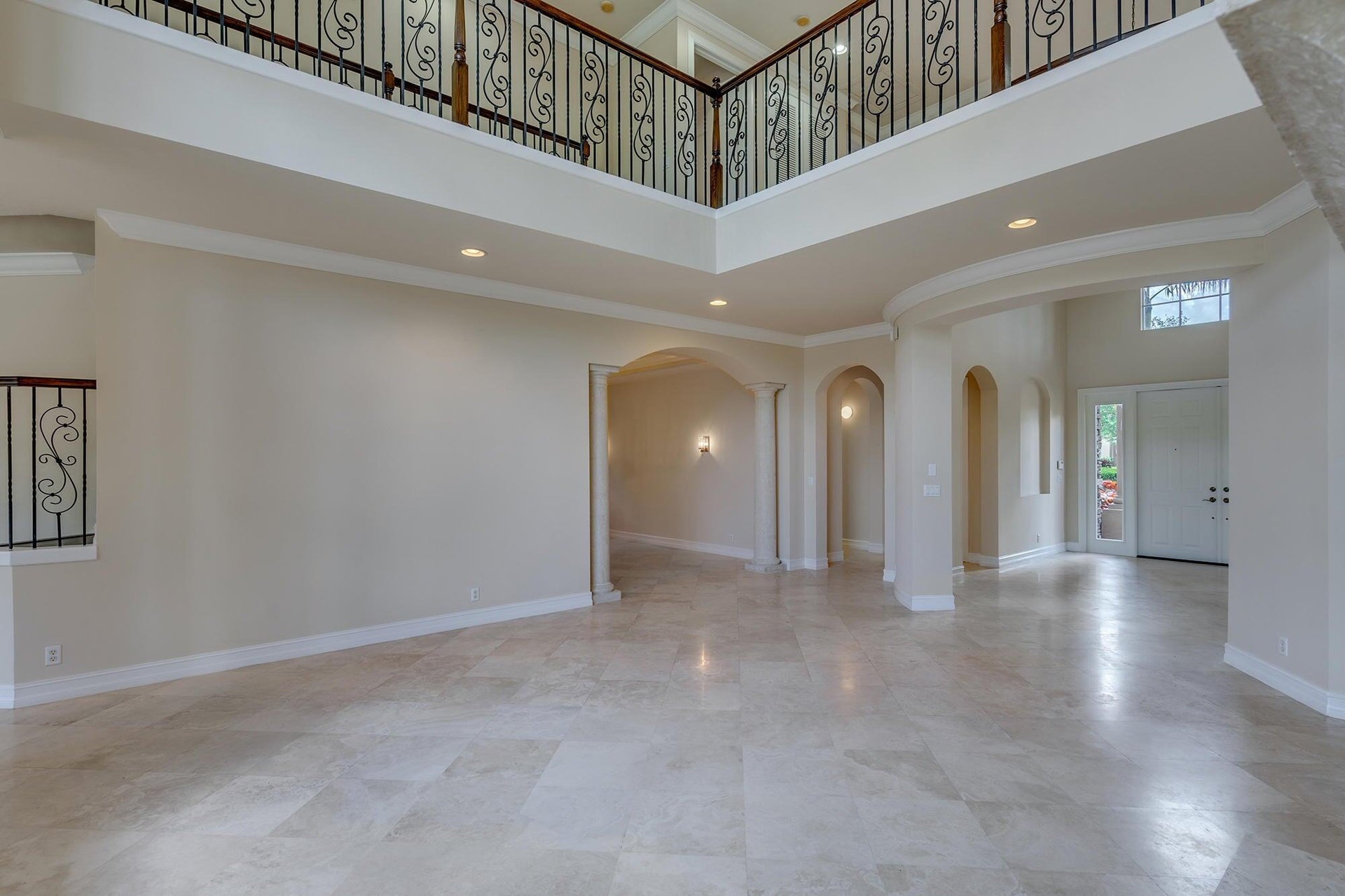Inside, you'll find travertine flooring, a wrought iron staircase, crown molding, and a gracious formal living room with fireplace. The gourmet kitchen features 42'' wood cabinetry with crown molding, granite countertops, stainless steel appliances, and a breakfast area overlooking the water. The master suite offers a private retreat with spa-like bath, dual vanities, soaking tub, and walk-in closets. Upstairs, a spacious loft and multiple stairways add to the home's thoughtful design.