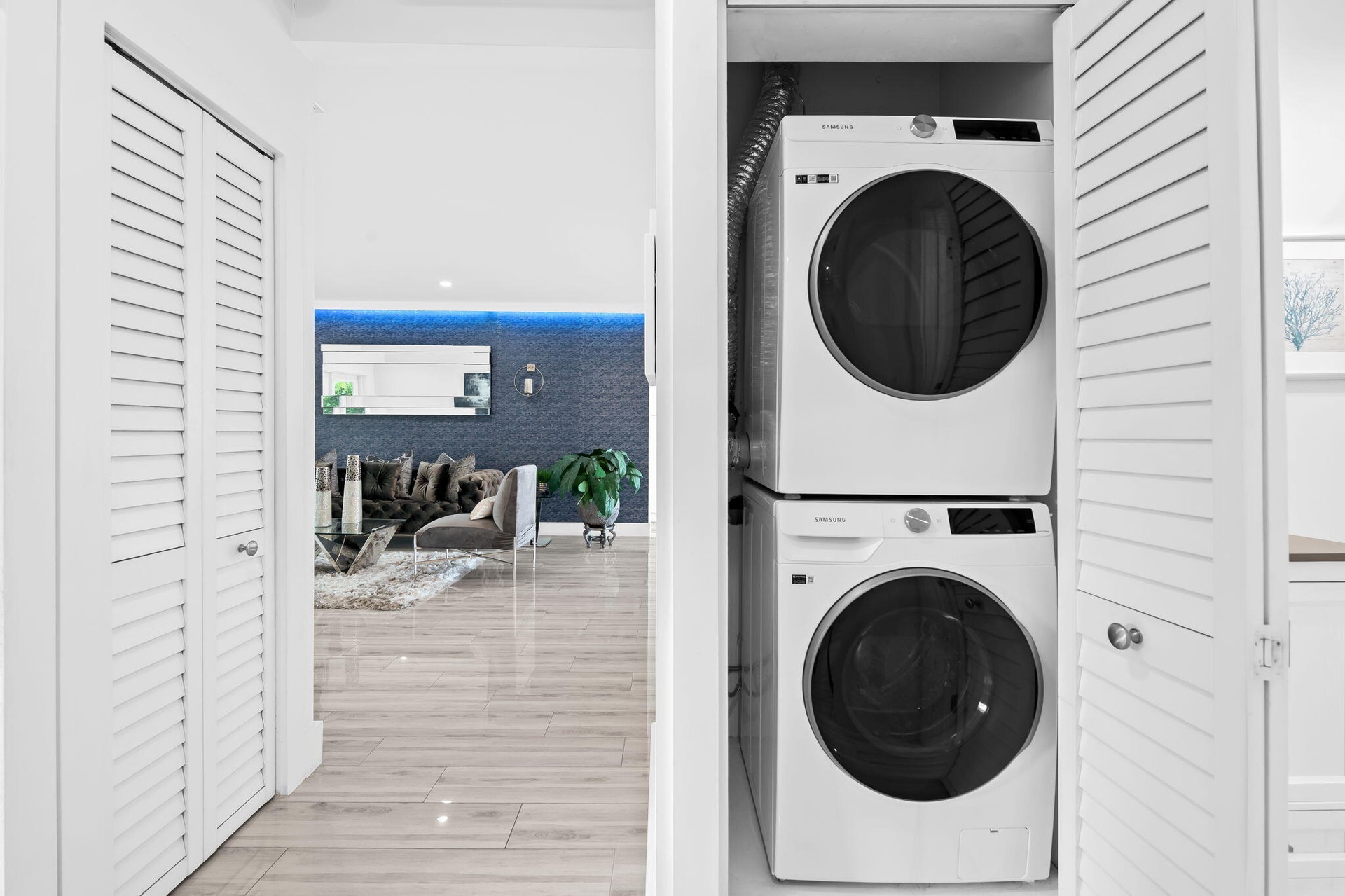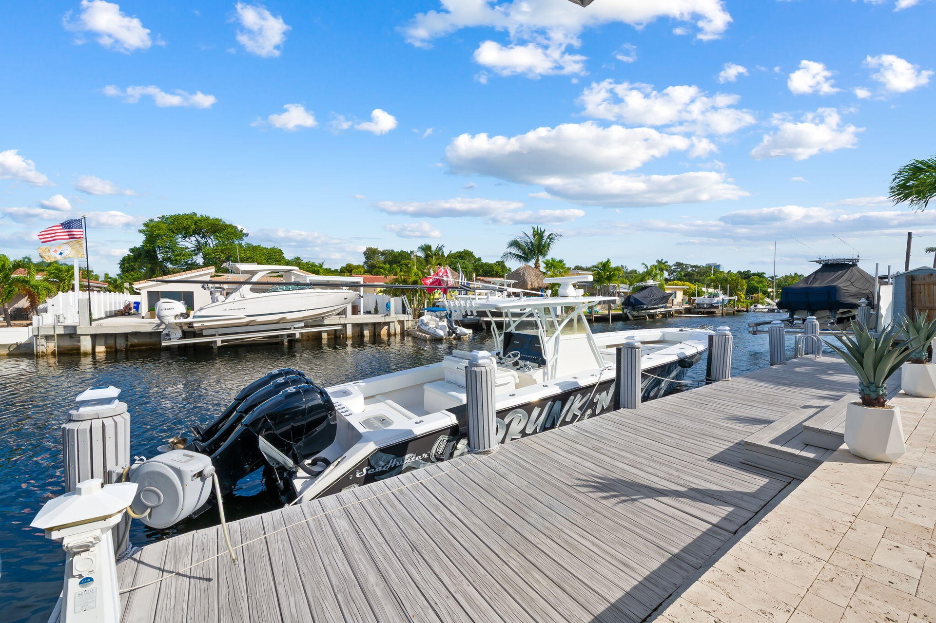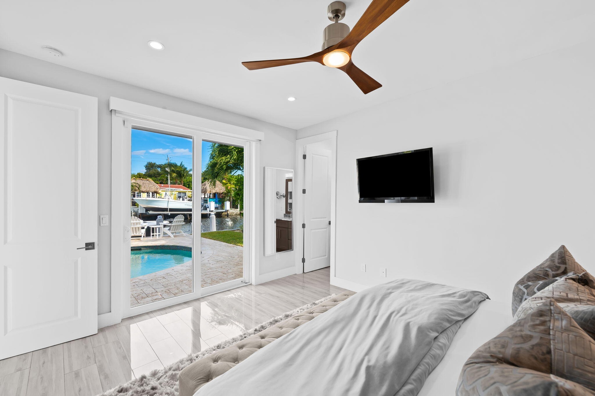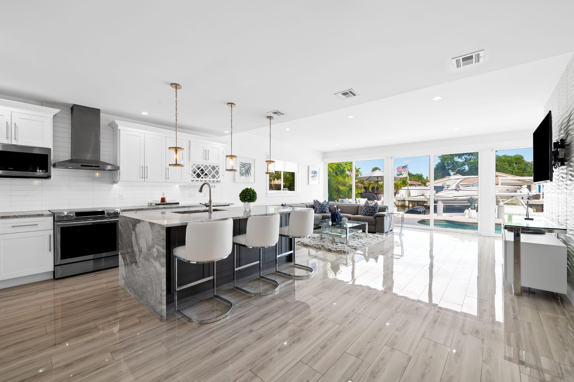 Welcome to this stunning waterfront retreat where modern design meets smart living. This fully furnished (unfurnished upon request) three-bedroom, two-bath home offers 60 feet of prime ocean-access waterfrontage with NO fixed bridges. Featuring a 50-foot dock with Hatteras brand duel light power pedestal 50/30 amps, water and solar dock lights and a sparkling resort-style pool surrounded by a travertine patio and lush tropical landscaping. Every detail has been thoughtfully curated for comfort and style, from the impact-rated windows and doors to the elegant half-circle driveway and fully fenced backyard that blend privacy with sophistication. Inside, a bright open layout features glossy polished white wood-plank ceramic tile, solid wood interior doors, and custom designer wall wall treatments. Freshly painted in designer tones of Sherwin-Williams "Brite White"and "First Star" gray for a crisp, modern aesthetic. The chef's kitchen showcases a waterfall-edge island with dual-side storage, a custom range hood, a French-door refrigerator, and a full suite of premium Samsung appliances. Entertaining is effortless with a built-in Newair 46-bottle wine cooler and premium El Dorado furnishings throughout. Dual central cooling systems, automatic shades, dimmers in every room, and custom smart lighting ensure refined living, while the spa-inspired primary bath with a rainfall shower and body jets creates a luxurious daily retreat. The outdoor space completes the picture with a sparkling pool, travertine deck, and a dock ideal for entertaining or unwinding by the water. Recent updates, including a full remodel, wood dock, and new hurricane proof garage door, make this home move-in ready and designed for the ultimate South Florida lifestyle. Pompano Beach is one of South Florida's fastest-growing coastal communities, offering a dynamic blend of lifestyle, leisure, and investment potential. Enjoy world-class restaurants, rooftop bars, and casual beachfront dining just minutes away, along with the iconic fishing pier and new waterfront parks. The approved Pompano Beach Innovation District is set to further enhance the area's appeal, driving continued growth and property appreciation. With easy access to golf courses, parks, major highways, and nearby cities like Fort Lauderdale and Miami, this location offers the best of coastal living with unmatched convenience.