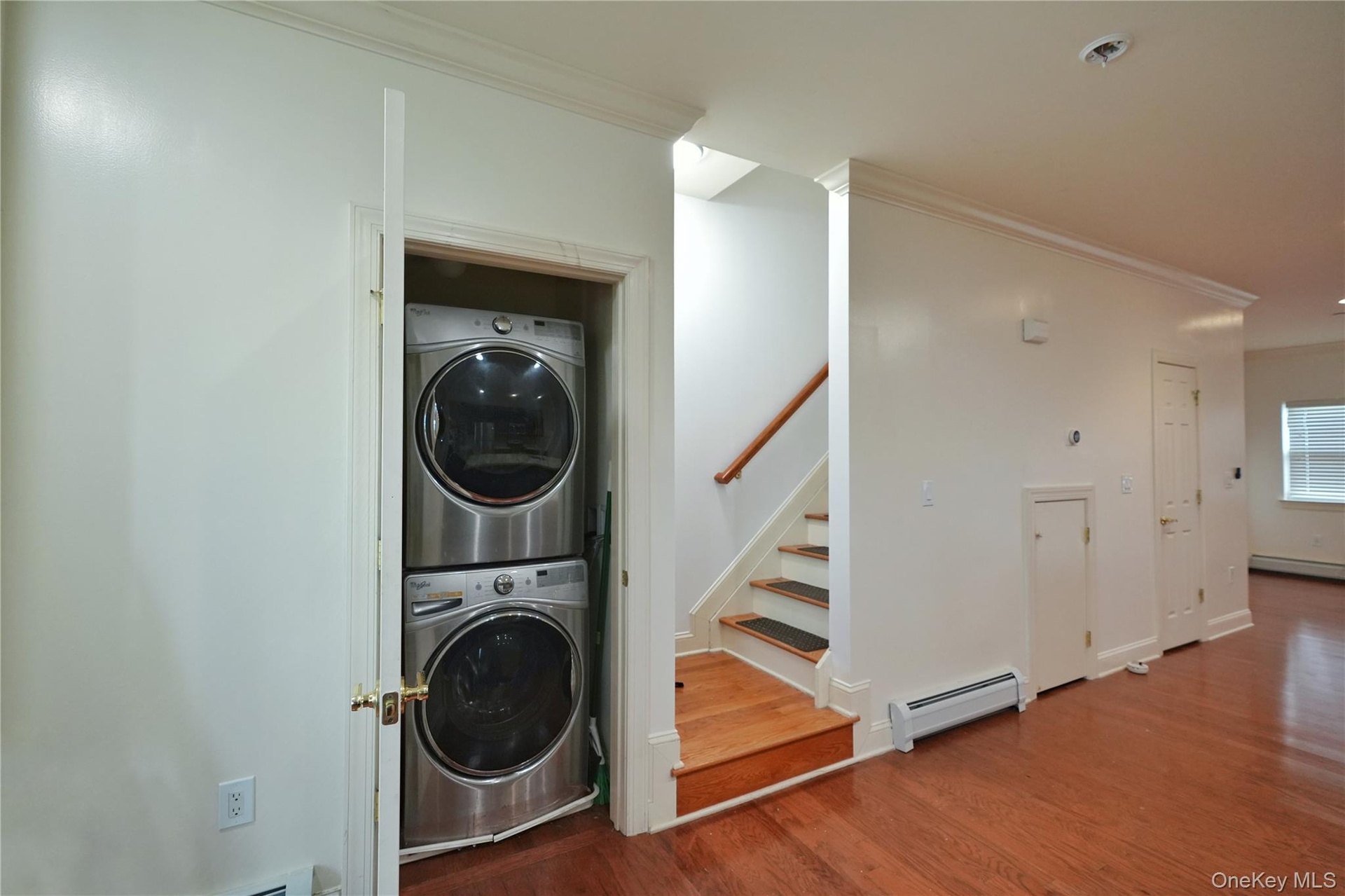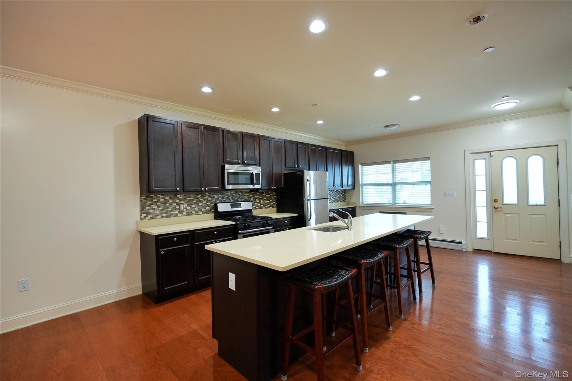 The first floor features hardwood flooring throughout, a bright, open kitchen with an oversized island, in-unit washer and dryer, conveniently located powder room, and a private backyard patio—ideal for relaxing or entertaining. The second floor features a primary suite which easily accommodates a king-size bed and offers a generously sized closet and en suite bathroom. Two additional bedrooms provide ample space and storage, to go along with a freshly painted hall bathroom. One assigned parking space is INCLUDED.