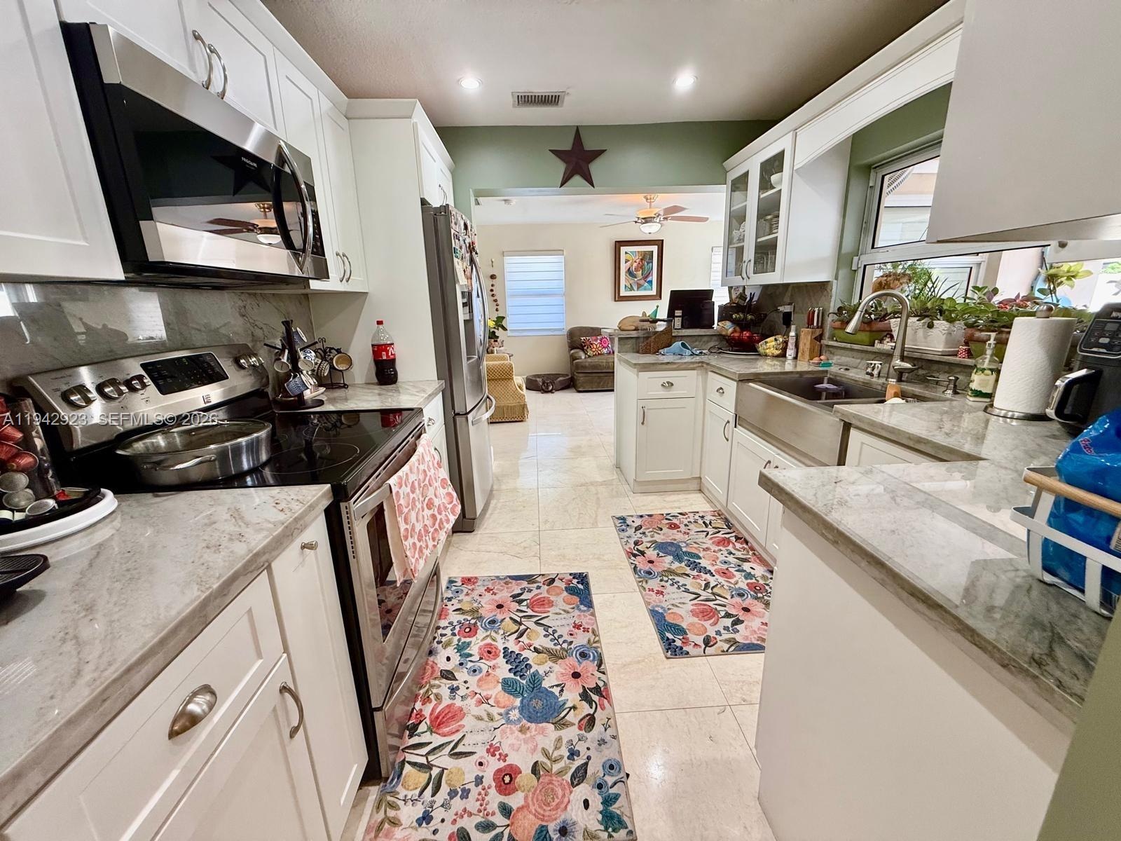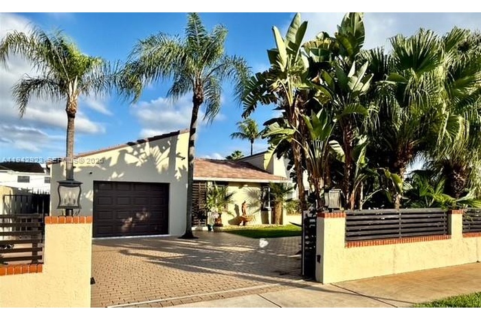 Step into your own private Oasis!!! Beautifully updated 4BR/2BA pool home on an almost 1⁄4-acre corner lot. Home is larger than tax roll per owner. Solid CBS construction with newer roof, electric gated entrance, and circular stamped concrete driveway. Fully landscaped front and backyard with landscape lighting and sprinkler system. Hurricane impact windows and doors throughout. Interior features include marble floors throughout, freshly painted interior, custom window treatments, wood interior doors, ceiling fans, and two A/C units. Updated kitchen with stainless steel appliances and wine cooler. Washer, dryer, and freezer included. Updated bathrooms and Titan water heater. Enjoy a private backyard oasis featuring a pool with new pool equipment, covered concrete terrace, convenient pool bath access, planters, outdoor furniture, and fruit trees. Security camera and alarm system with Vivint. Truly turnkey and move-in ready.