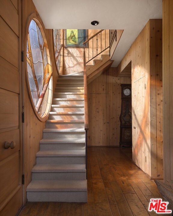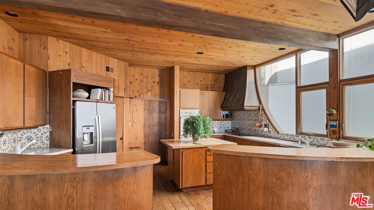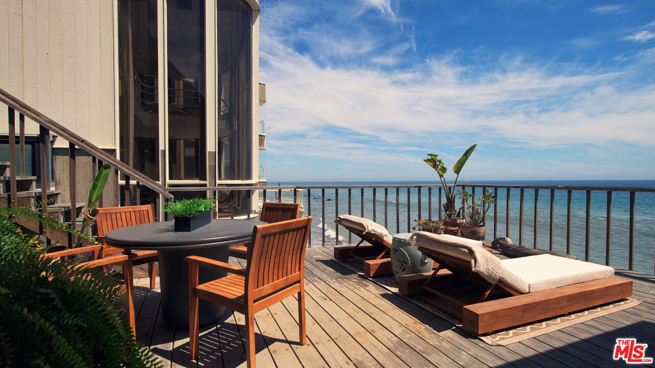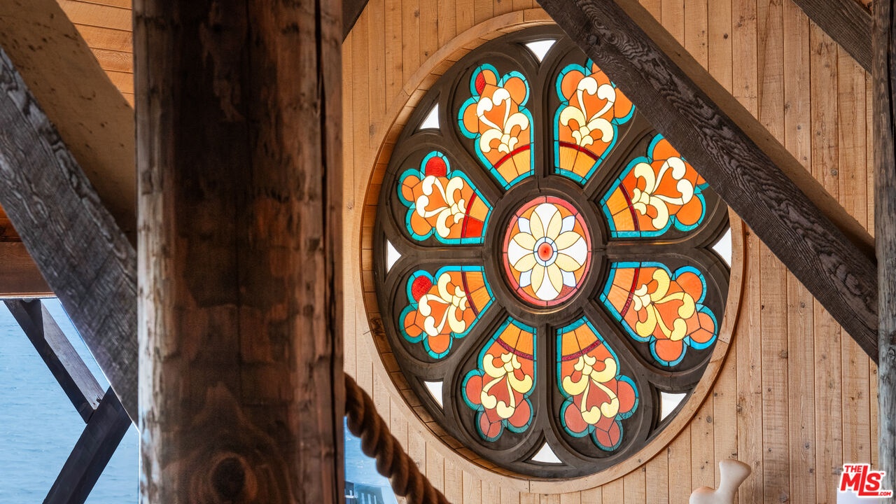 Poised on the quiet cul-de-sac end of Malibu Cove Colony's private road, this oceanfront estate is an extraordinary work of art by renowned architect Harry Gesner. With its soaring geometries, expressive woodwork, and walls of glass that frame the endless Pacific, the home reflects Gesner's signature blend of drama and intimacy. Approached by a wooden bridge detailed with nautical rope, the residence begins with monumental double doors salvaged from the historic San Francisco Mint, an entry that immediately signals rarity and provenance. Inside, a world of handcrafted artistry unfolds, illuminated by sunlight streaming through skylights and stained-glass windows reclaimed from a historic church. The interiors are a celebration of natural materials and timeless design. Wood-beam ceilings, wide-plank floors, and five fireplaces create warmth and character, while sweeping walls of glass open to panoramic views stretching down the coast to Point Dume. The main level embraces open concept living, where the family room flows seamlessly into a window-lined dining area and onward to an ocean-view kitchen featuring custom cabinetry, bar seating, a butcher block island, double Thermador ovens, and hand-tiled counters. On the level below, the living room serves as a dramatic gathering space with soaring ceilings, another grand brick fireplace, a stained-glass rose window, and sliding doors that open to a broad oceanfront deck designed for dining, lounging, and effortless indoor-outdoor living. Upstairs, three of the four bedrooms boast sweeping ocean views, capturing the artistry and serenity of this one-of-a-kind residence. The primary suite is a private sanctuary with wood beam ceilings, a fireplace with artisan tile detailing, and sliding doors to its own oceanfront balcony. A loft retreat, accessed by ladder, overlooks the coastline with extraordinary views. The primary bath continues the artistry with double vanities, a walk-in shower, an in-ground vintage tiled tub, and access to a second private terrace overlooking the lush hillside. Additional bedrooms feature sliding glass doors to ocean-view decks and stained-glass accents that enhance the home's singular character. Everywhere, bespoke craftsmanship abounds from custom built-ins to nautical-inspired railings underscoring the home's authenticity and artistry.With direct beach access and expansive decks hovering above the sand, this is more than a residence: it is a piece of California architectural history. A rare chance to own a Harry Gesner original in Malibu Cove Colony, where art, history, and coastal living converge in perfect harmony.
