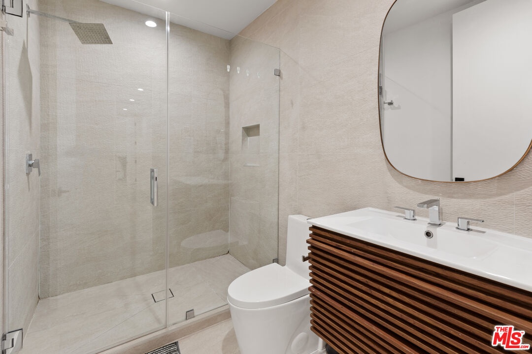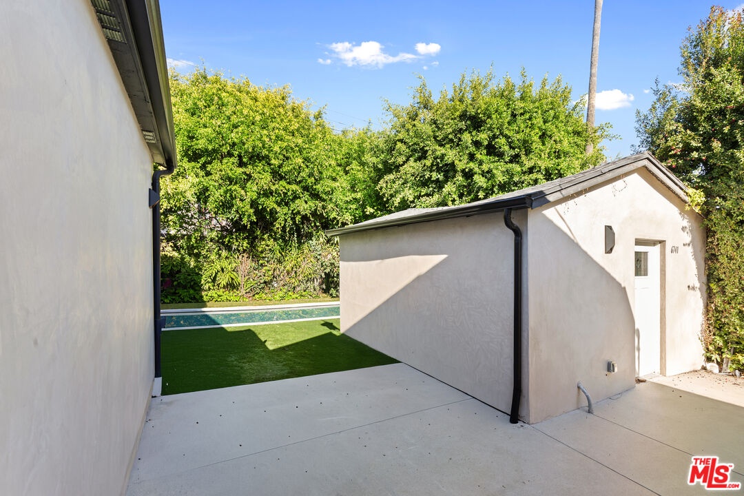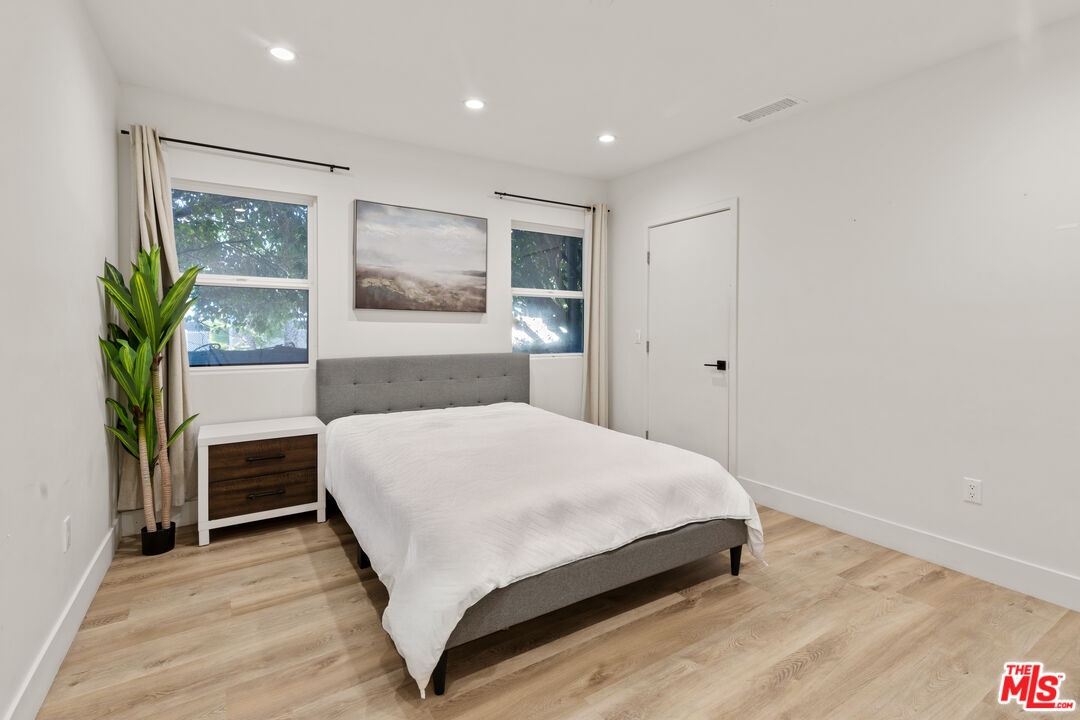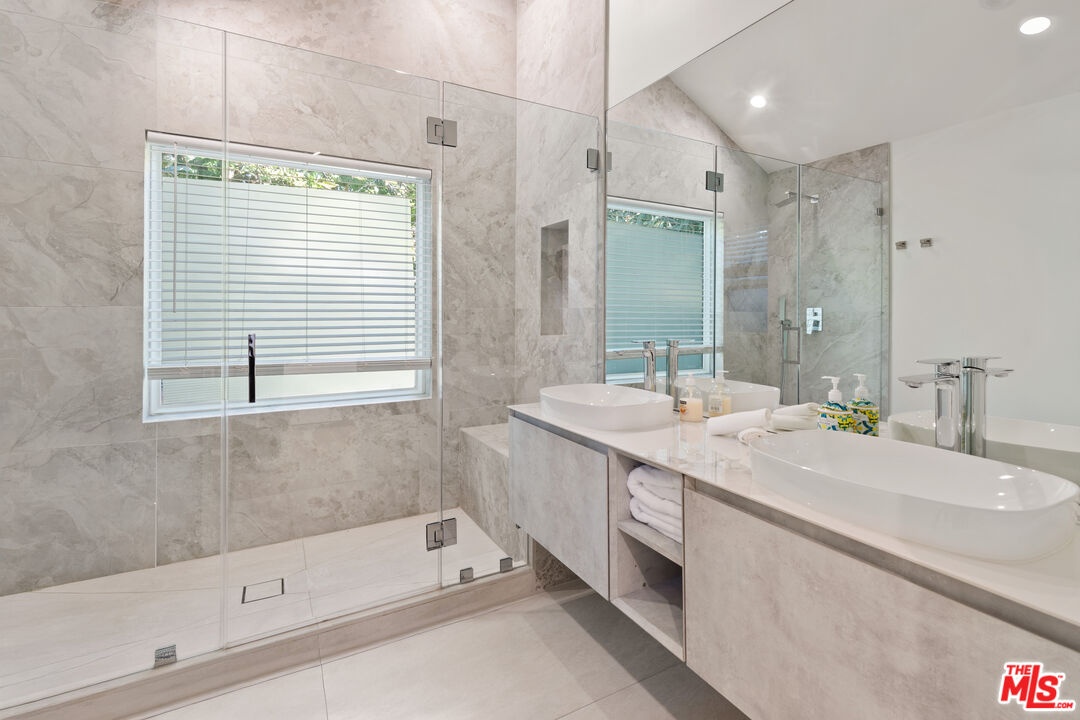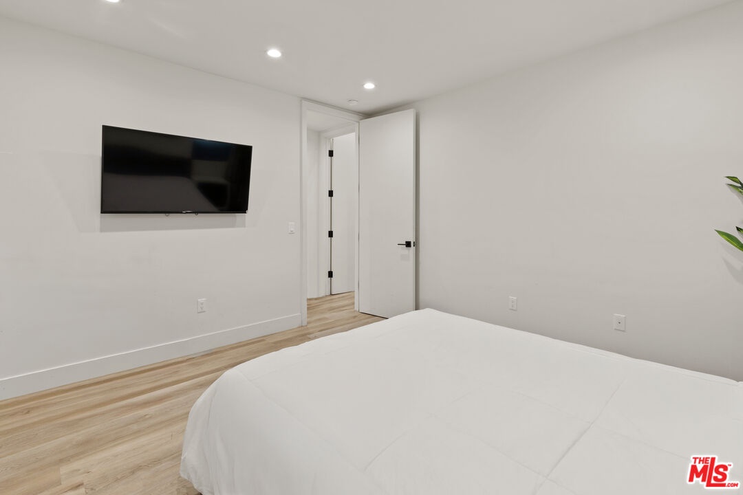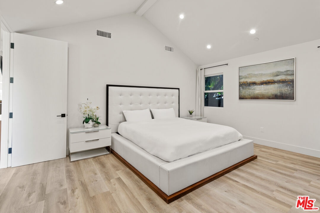 A refined modern retreat set behind gates on a quiet, tree-lined street in the heart of coveted Beverly Grove. Thoughtfully reimagined with clean architectural lines and warm natural finishes, this residence offers an effortless blend of contemporary design and relaxed California living.The home opens into a soaring great room where vaulted ceilings, exposed architectural beams, and wide-plank oak floors create an immediate sense of volume and light. Expansive living and dining spaces flow seamlessly into a sleek chef's kitchen, anchored by a striking stone-wrapped center island, custom flat-panel cabinetry, and premium stainless-steel appliancesperfectly suited for both everyday living and elegant entertaining.Walls of glass dissolve into a private backyard oasis, creating a seamless indoor-outdoor connection. The sun-drenched pool, lounging and dining areas, and mature hedging form a serene, resort-style setting designed for both hosting and unwinding in total privacy.The primary suite is a tranquil escape, finished in soft stone and refined modern details, featuring dual floating vanities, a glass-enclosed walk-in shower, and peaceful garden views. Three additional bedrooms and beautifully curated baths provide comfort and flexibility for family, guests, or a home office.Every element has been carefully curated to deliver effortless luxury and timeless design, from the architectural ceiling lines to the fluid layout that celebrates Southern California's signature indoor-outdoor lifestyle. A rare Beverly Grove offering that pairs modern elegance with a true sense of serenity.