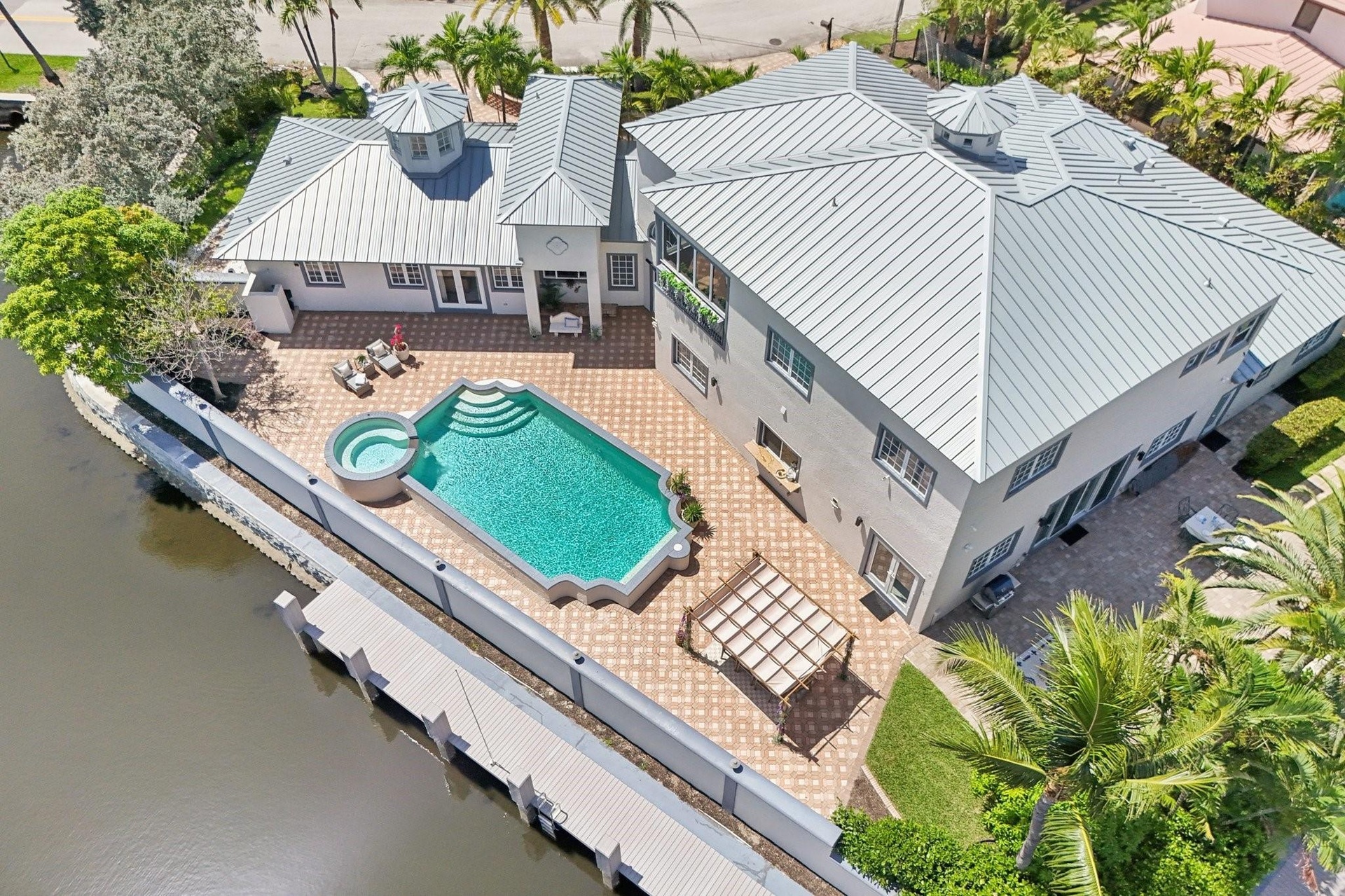 MOTIVATED SELLER!! 285 feet of waterfront on a point lot in prestigious Lighthouse Point with ocean access and no fixed bridges! This 5 bed, 6.5 bath home has 2 additional Bonus Rooms (home offices), Reading Nook and is loaded with upgrades! Boasting a new metal roof, 150ft composite dock with 20,000 pound boat lift, the main kitchen has been recently updated along with a spa inspired primary bathroom. Rest assured with hurricane impact windows and doors providing protection from the elements. With beautiful ceiling details throughout, this property offers a unique private suite with full kitchen, washer/dryer and designer finishes. Perfect for in-laws or long-term guests. This home has been professionally decorated to provide warmth and comfort. Move-in ready—just bring your water toys!